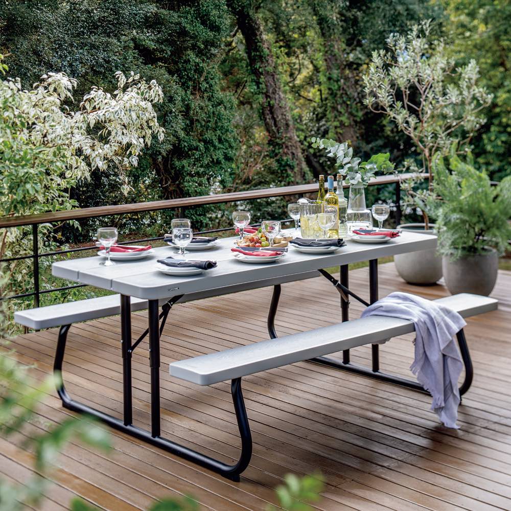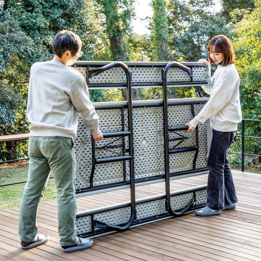 ゆったり広々、ガーデンパーティー。大人数でも余裕のワイドサイズながら、使わないときは折りたたんで省スペース収納。公共施設にも対応する高品質も自慢です。