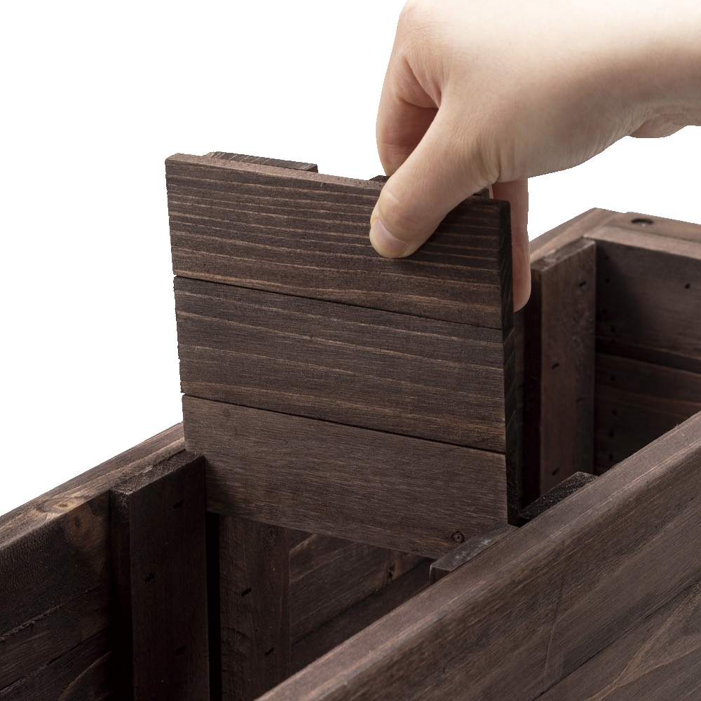 ナチュラルな天然木とシンプルデザインで、庭のテイストを選ばず調和。仕切り板付きで、半分は直植え、半分は鉢を入れる使い方も。○完成品で組立て不要○根の広がりを防ぐ間仕切り付き○水抜き穴あり