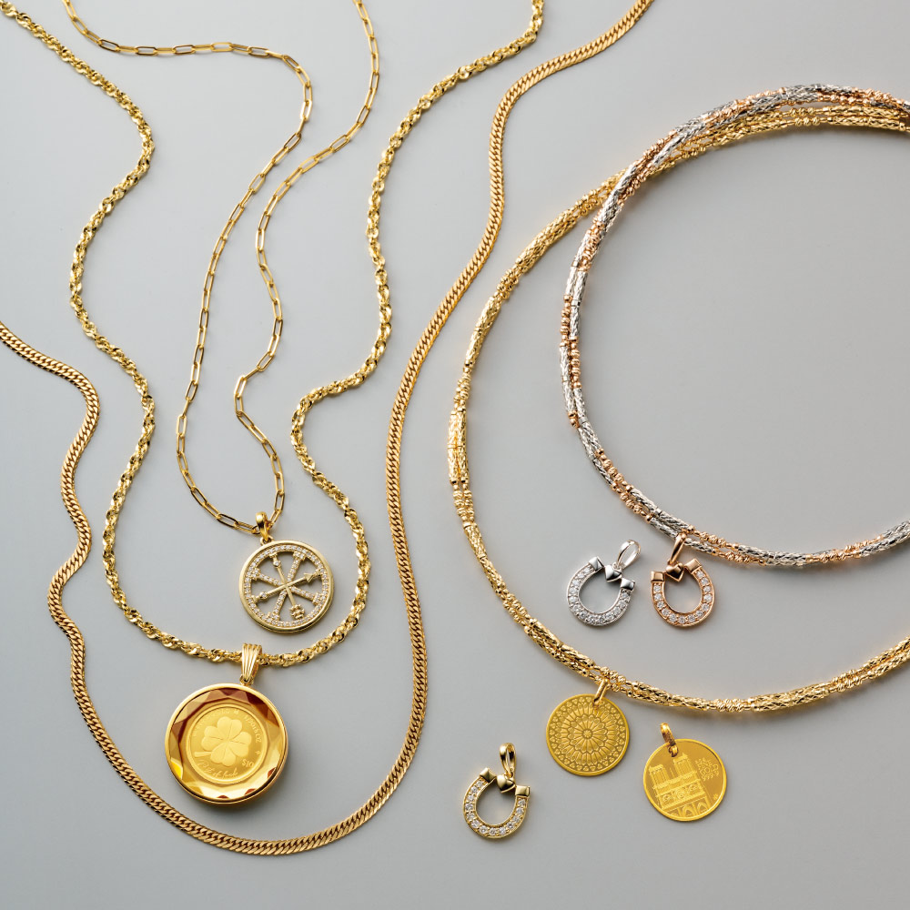Special Recommendationコレクション、資産、そしてもちろん、美しい装飾品として…。高騰が続く金を、今、手に入れるのは人生を豊かにする選択の一つです。「選ぶ価値」のある逸品熟練した職人が手掛ける6面ダブルカットの喜平チェーン。造幣局の検定マーク入りの確かな品質の逸品を、相場のベストプライスでご提供します。