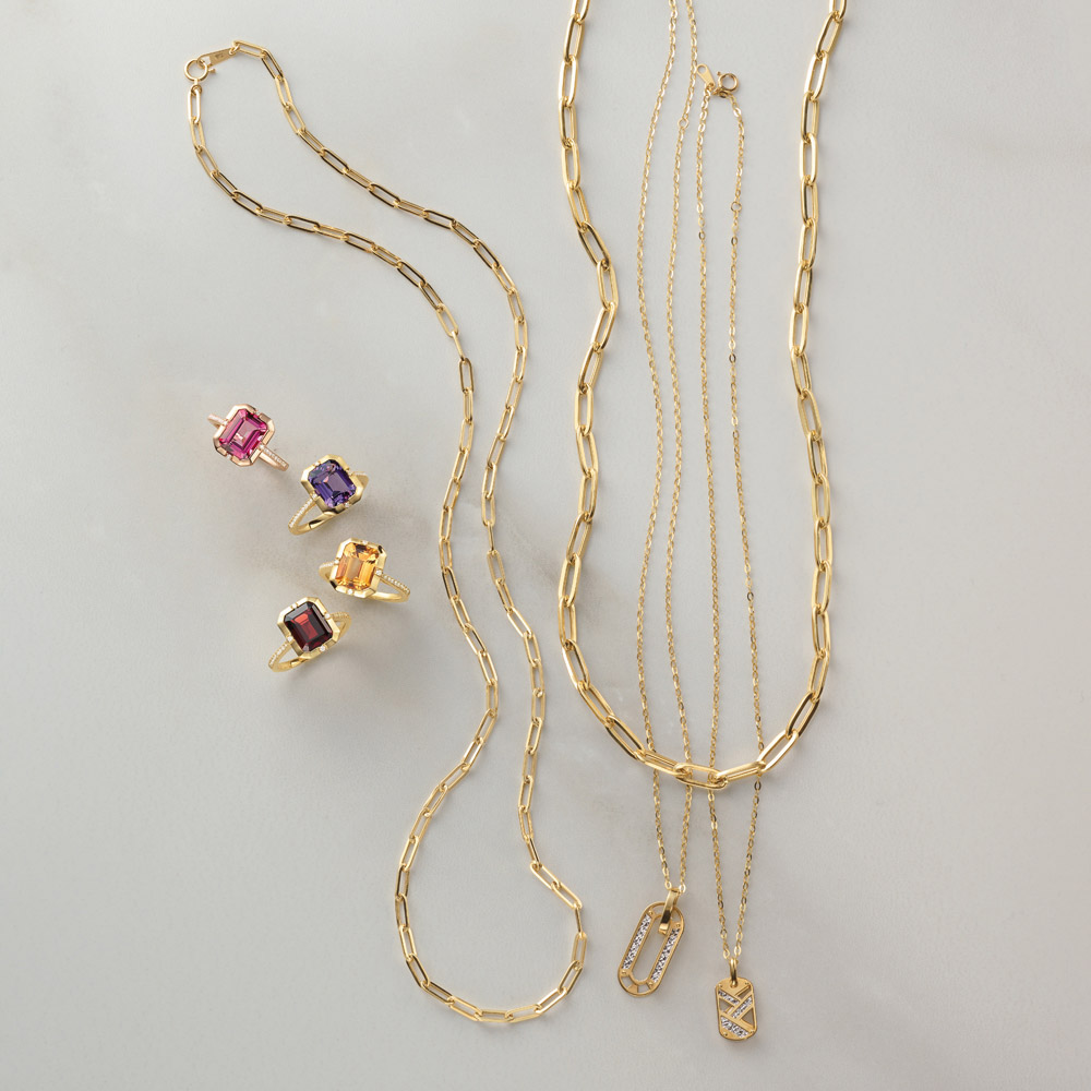 EVERYDAY FAVORITES「今」の気分と装いに寄り添うデイリー・ジュエリー自由なレイヤードやさりげないアレンジで、日常の装いを表情豊かに彩るジュエリー。旬モードなコーディネート例もぜひ、ご参考に!気ままなようで洗練が香る ゴールド×色石の華麗な共演ネックレスとリングの組み合わせは、モダン&シンプルなデザインが統一感の決め手。 軽やかさとリッチなボリューム感を備えた中空クリップチェーン。コマの大きさ、長さをバリエーション豊かに揃えました。主役になる太幅・中幅タイプは着こなしの格を高める効果が。細幅タイプはカジュアルなスタイルに好バランス。さまざまな組み合わせでレイヤードを楽しめるのも愛用ポイント。