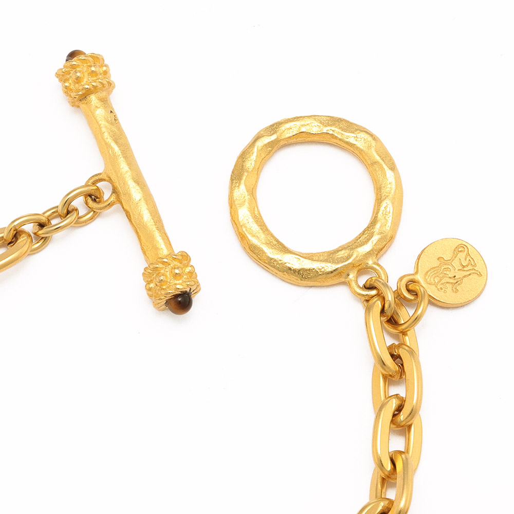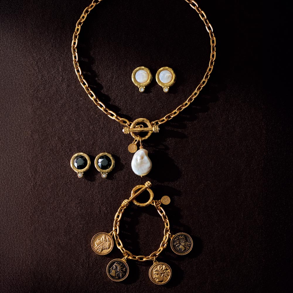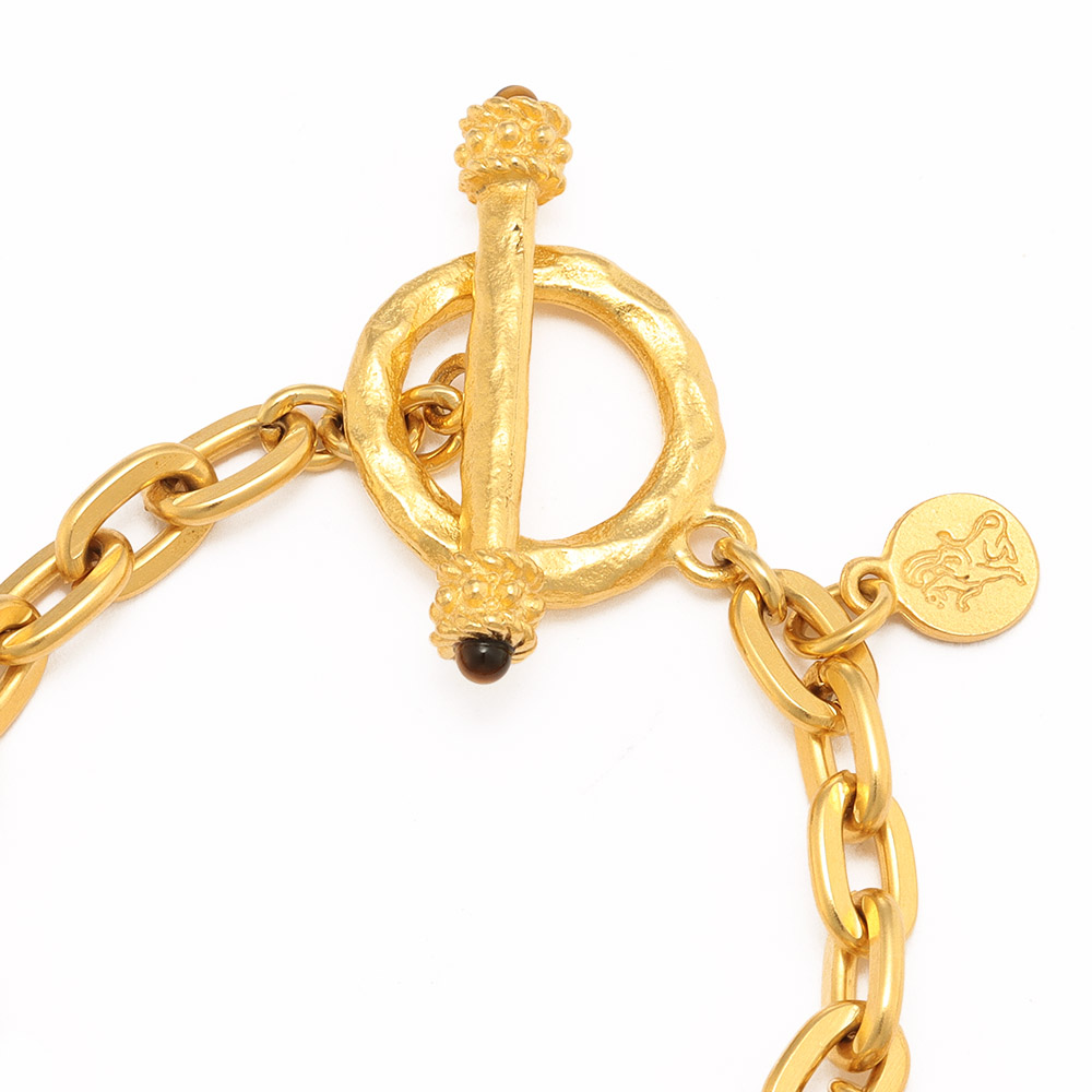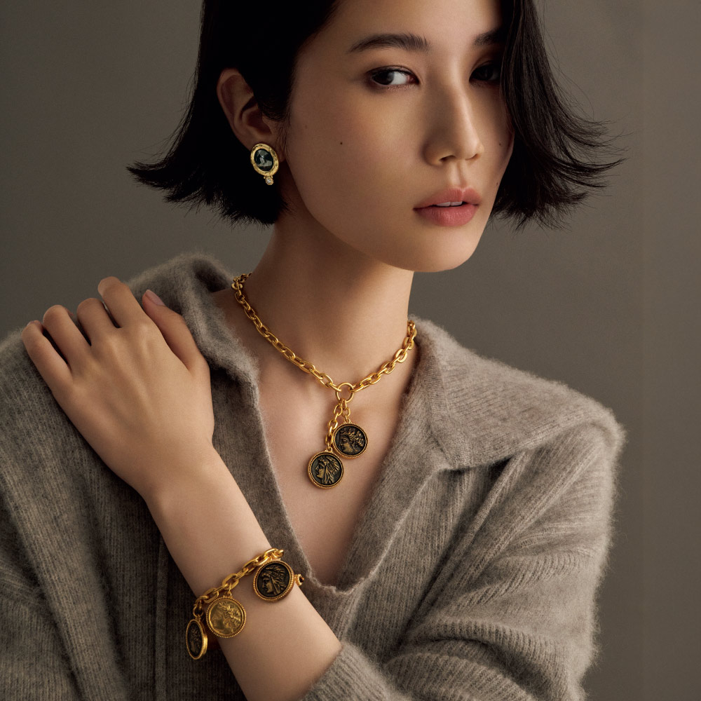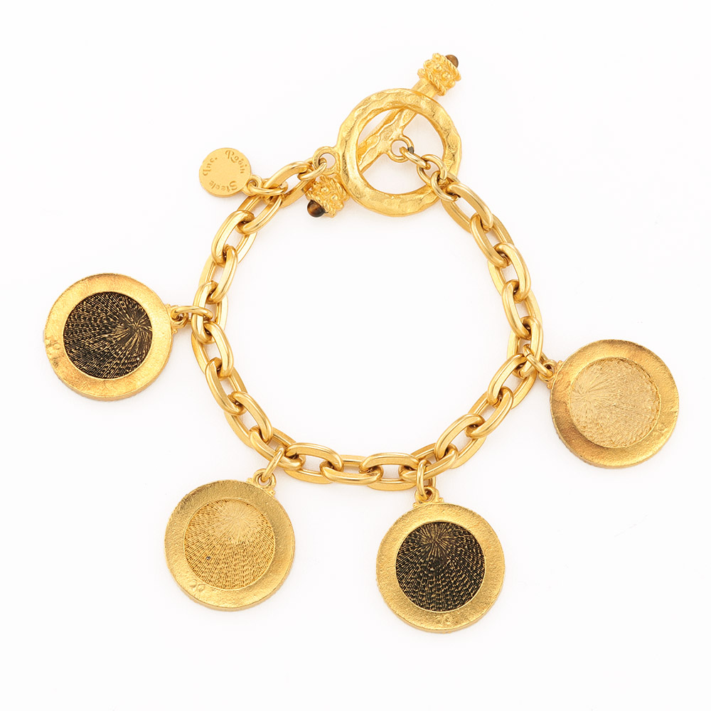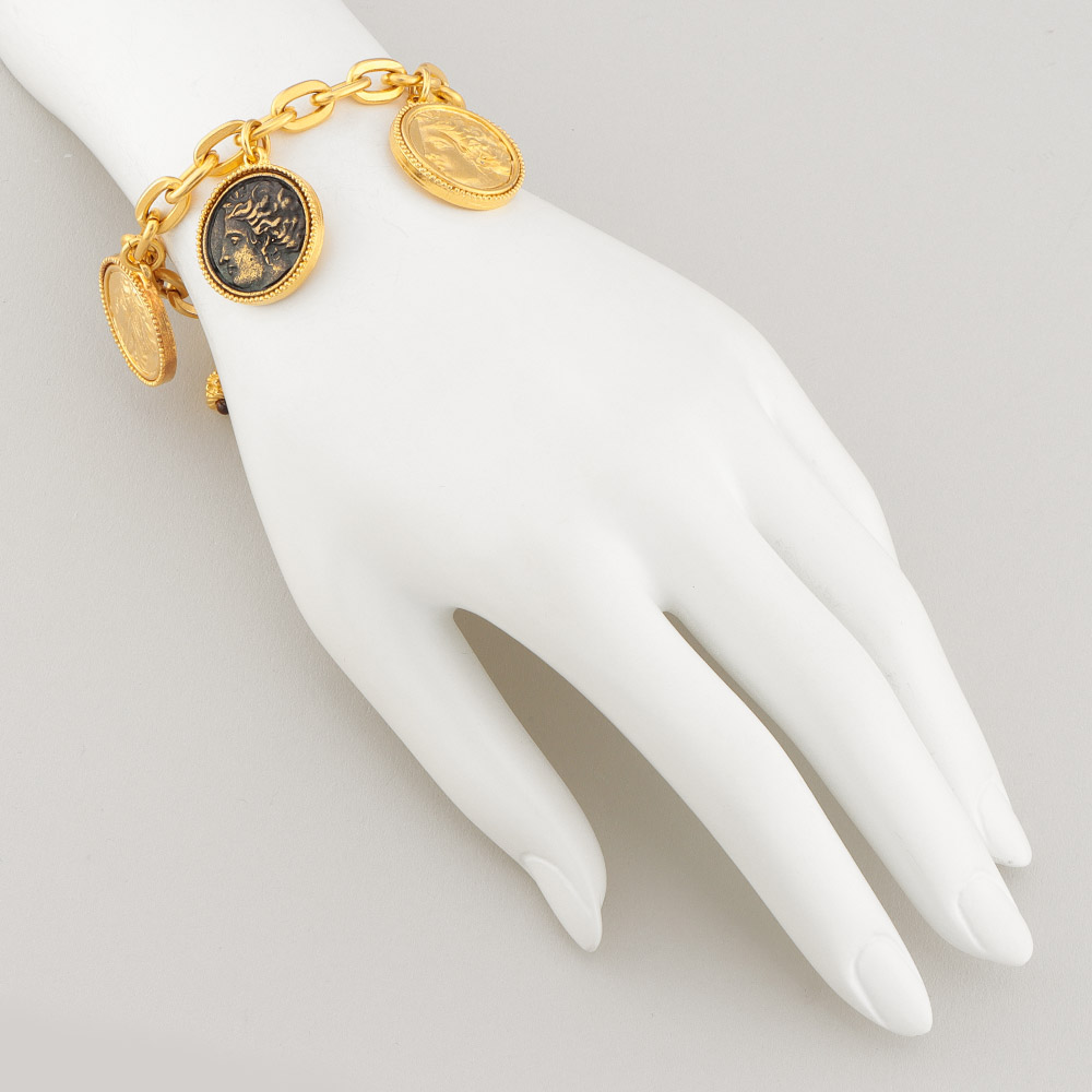 重厚でありながら都会的で洗練されたコスチュームジュエリーニューヨークの工房で製作される「ロビン・スティール」。ヴィンテージパーツをあしらった独自の世界観に魅了されます。2種、2色のアンティークのメダルを複製したメダリオンが揺れるブレスレット。