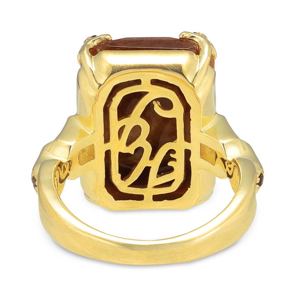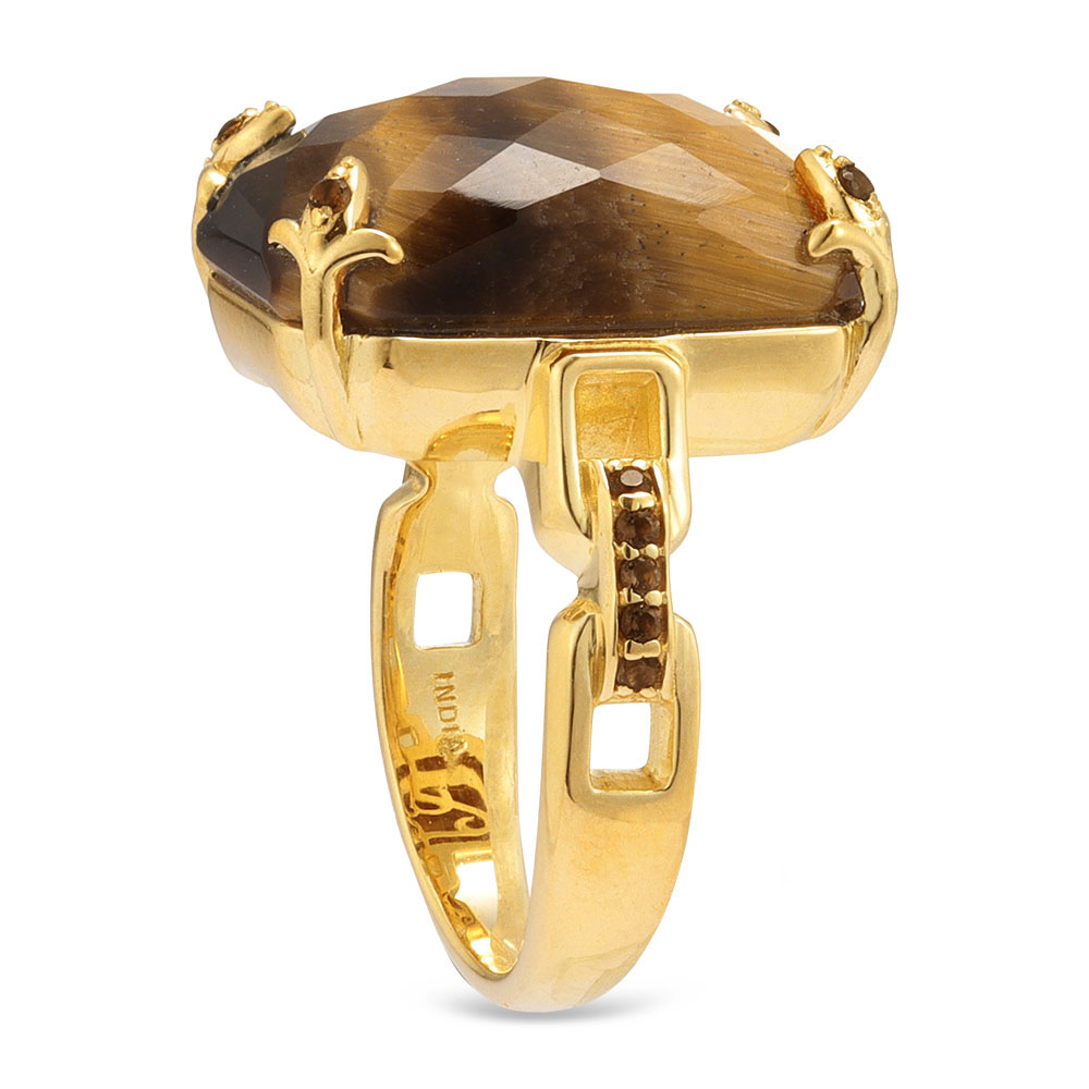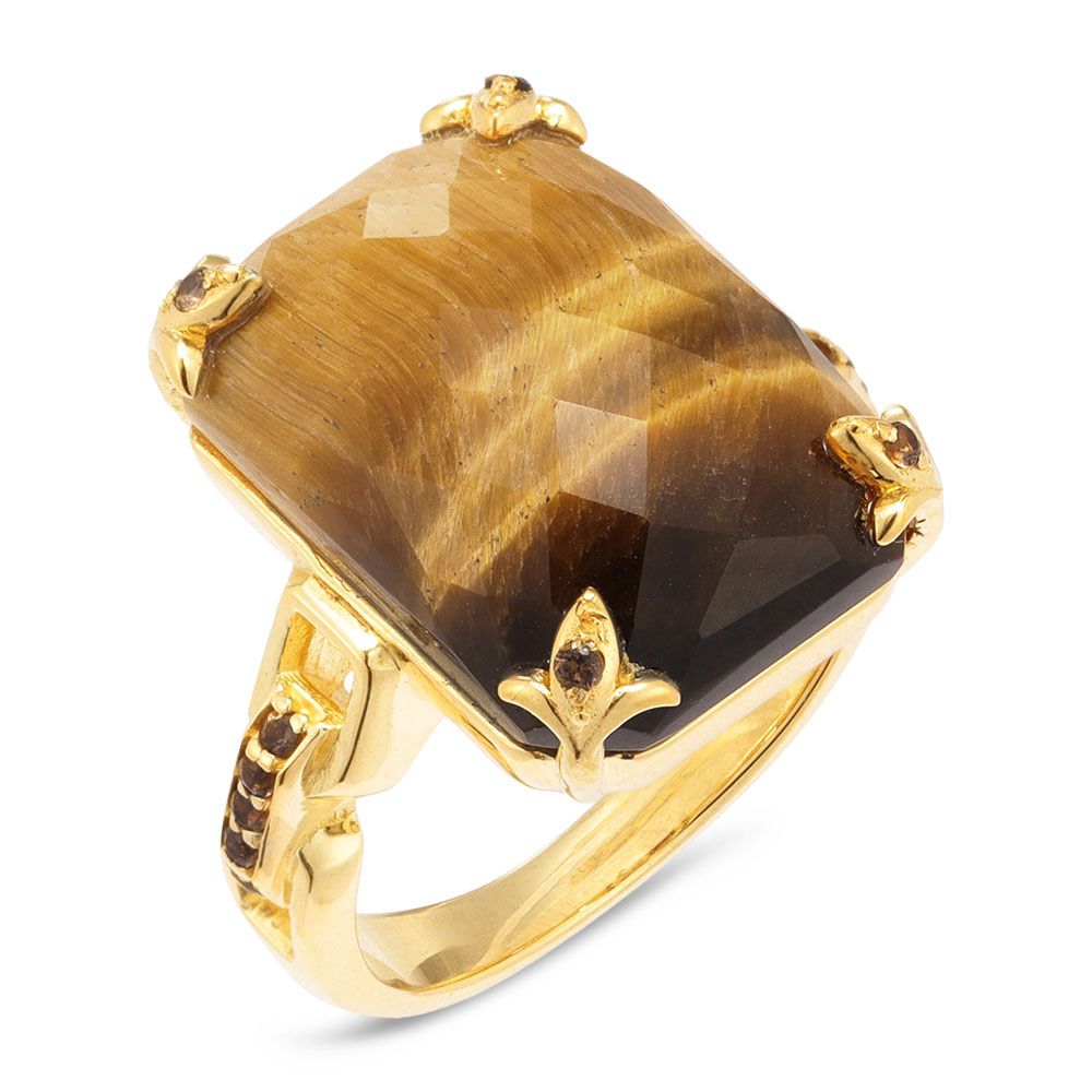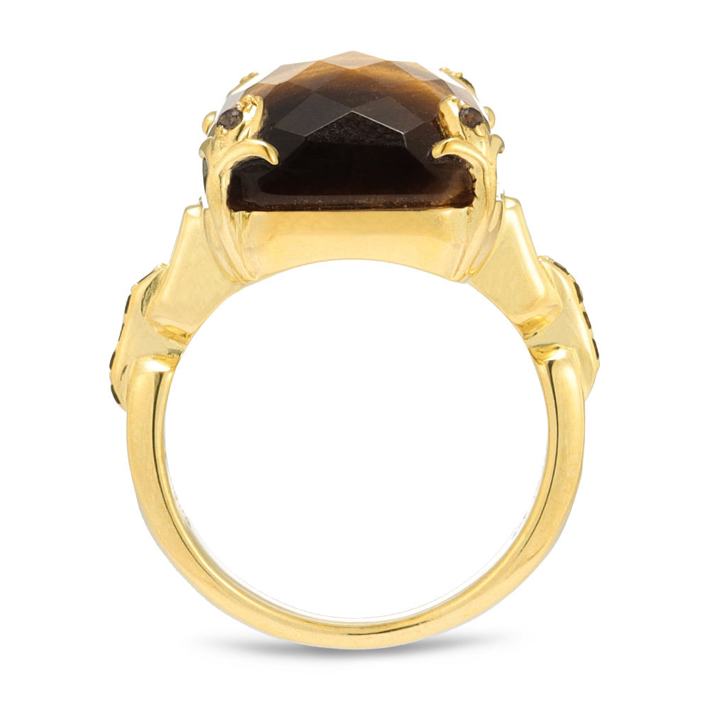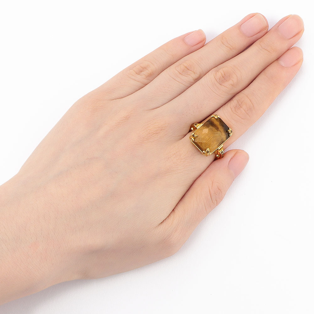 Hilary Joy Couture/ヒラリージョイ天然石のステートメントジュエリーを得意とするヒラリージョイ。石の魅力とエナジーをダイレクトに感じるデザイン、拘った細工のNY発ブランド。金褐色の縞模様が神秘的なタイガーアイは、幸運や金運を招くとされる人気石。アームと爪にスモーキークオーツをセットした、ボリュームリング。