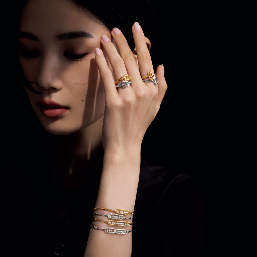 ときに凛と、ときに華やかに仕草に呼応して舞い踊るダイヤの光繊細に揺らぎ、光を振り撒くダンシングダイヤのバングル。ダイヤが細かく揺れて、煌めきに多彩な表情を添えます。ストレッチ仕様のため、サイズフリーで着脱は簡単。横長フレームに整然と並ぶダイヤが、華やかな光を拡散。リング(商品番号:J00101)とのセット使いも素敵です。