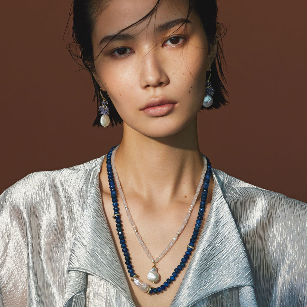 深みのある濃紺のラピスラズリは、フェミニンなパールやムーンストーンをプラスすることで、辛さと甘さが絶妙に調和。