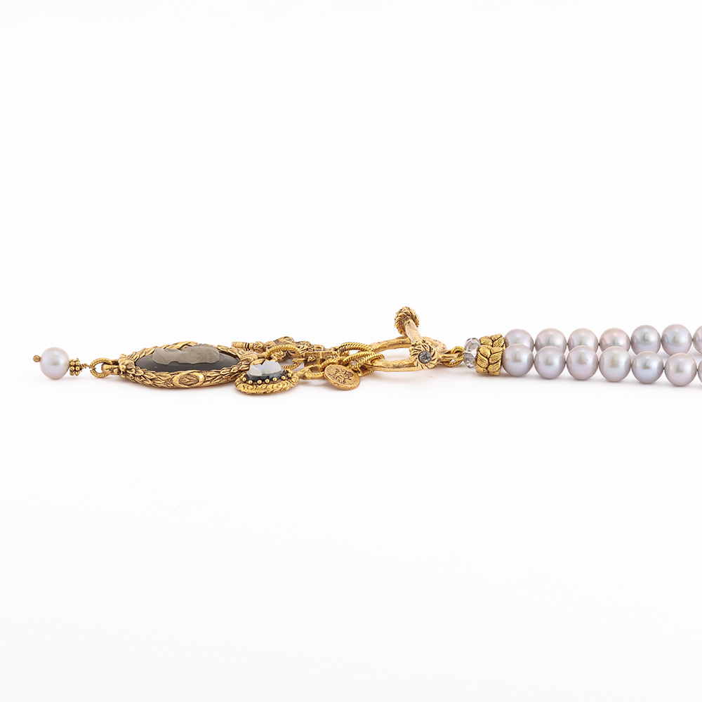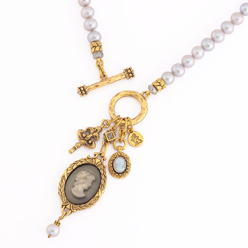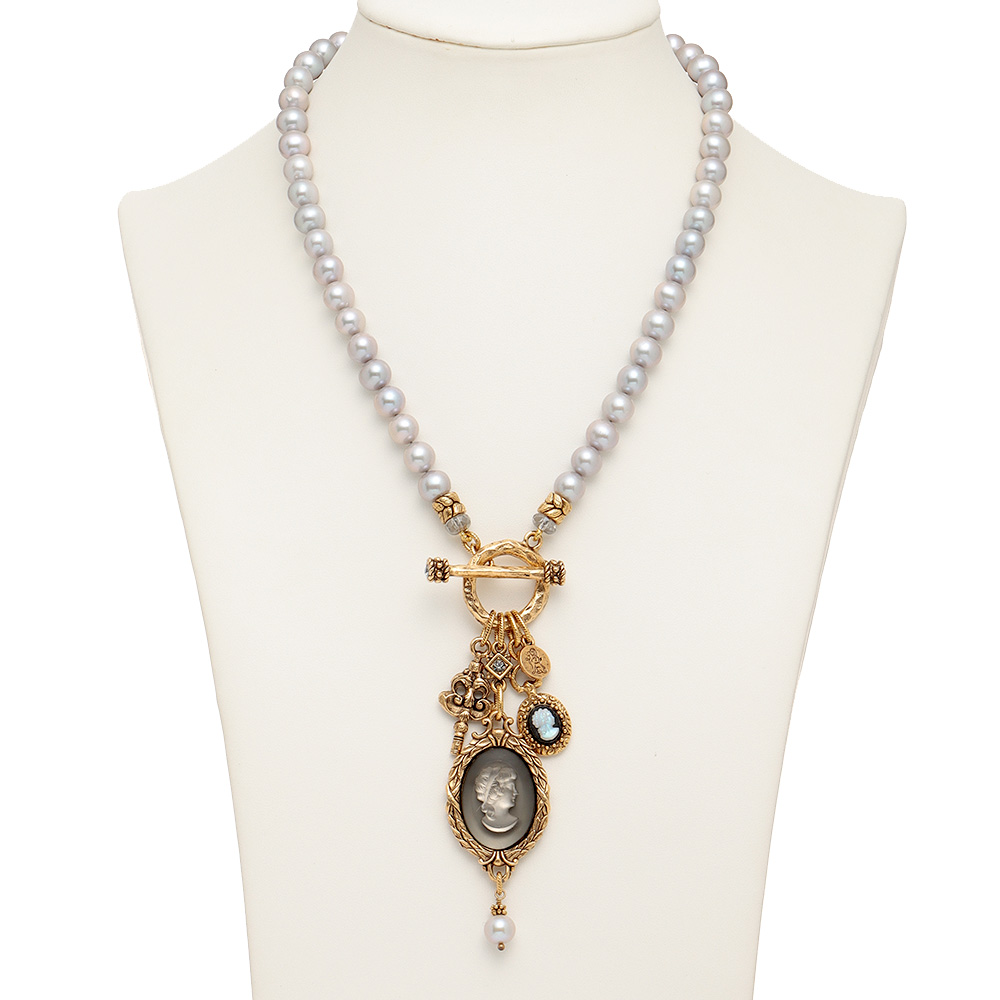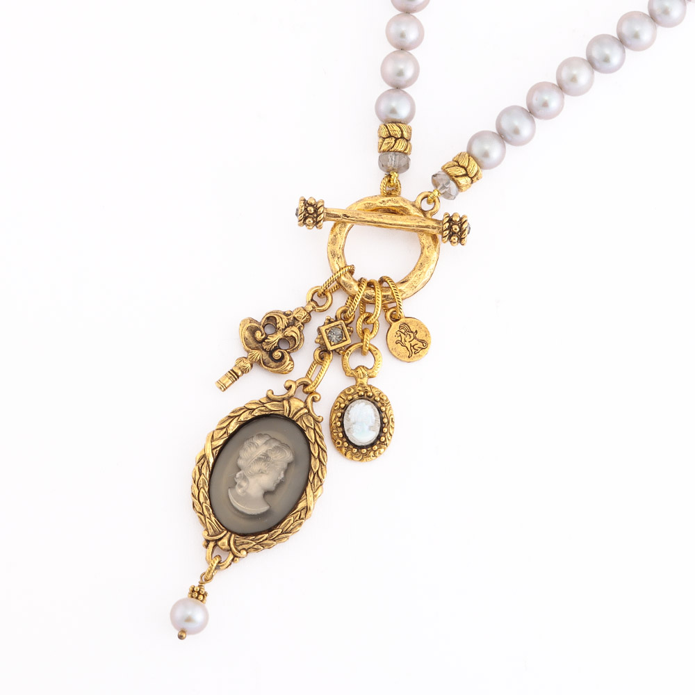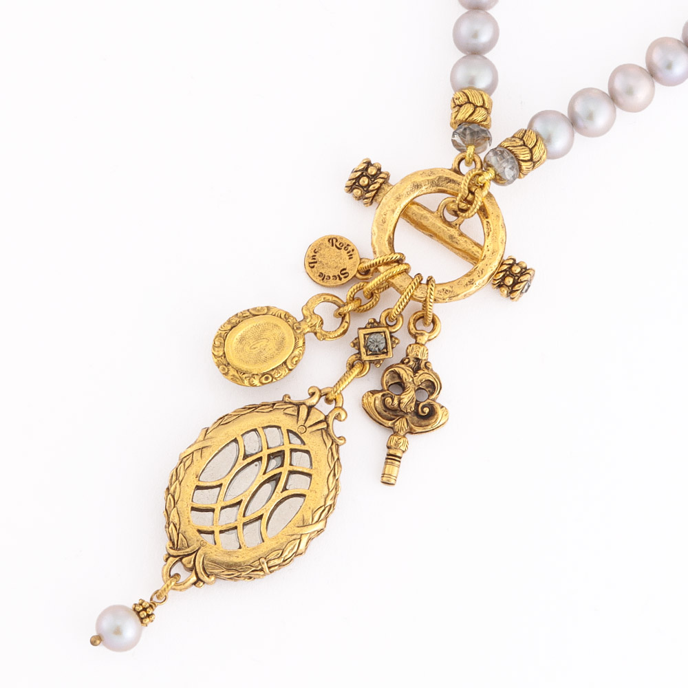Featured Accessoryアートなアクセサリーに熱視線!マテリアルのジャンルを問わない自由なクリエーションの世界へようこそ!アクセサリーで纏う、流行に左右されない洗練1920〜1940年代にヨーロッパで製造されたヴィンテージパーツを贅沢にあしらって。マットガラスの貴婦人のインタリオ(沈み彫り)と小さなカメオやキーチャームが揺れるグレーパールのネックレス。Robin Steele/ロビン・スティールニューヨークの工房で製作を続ける「ロビン・スティール」が久々に登場。「The old and the new」をテーマに、ヴィンテージパーツを使った重厚感がありつつ都会的センスを感じさせるアクセサリーを発信しています。