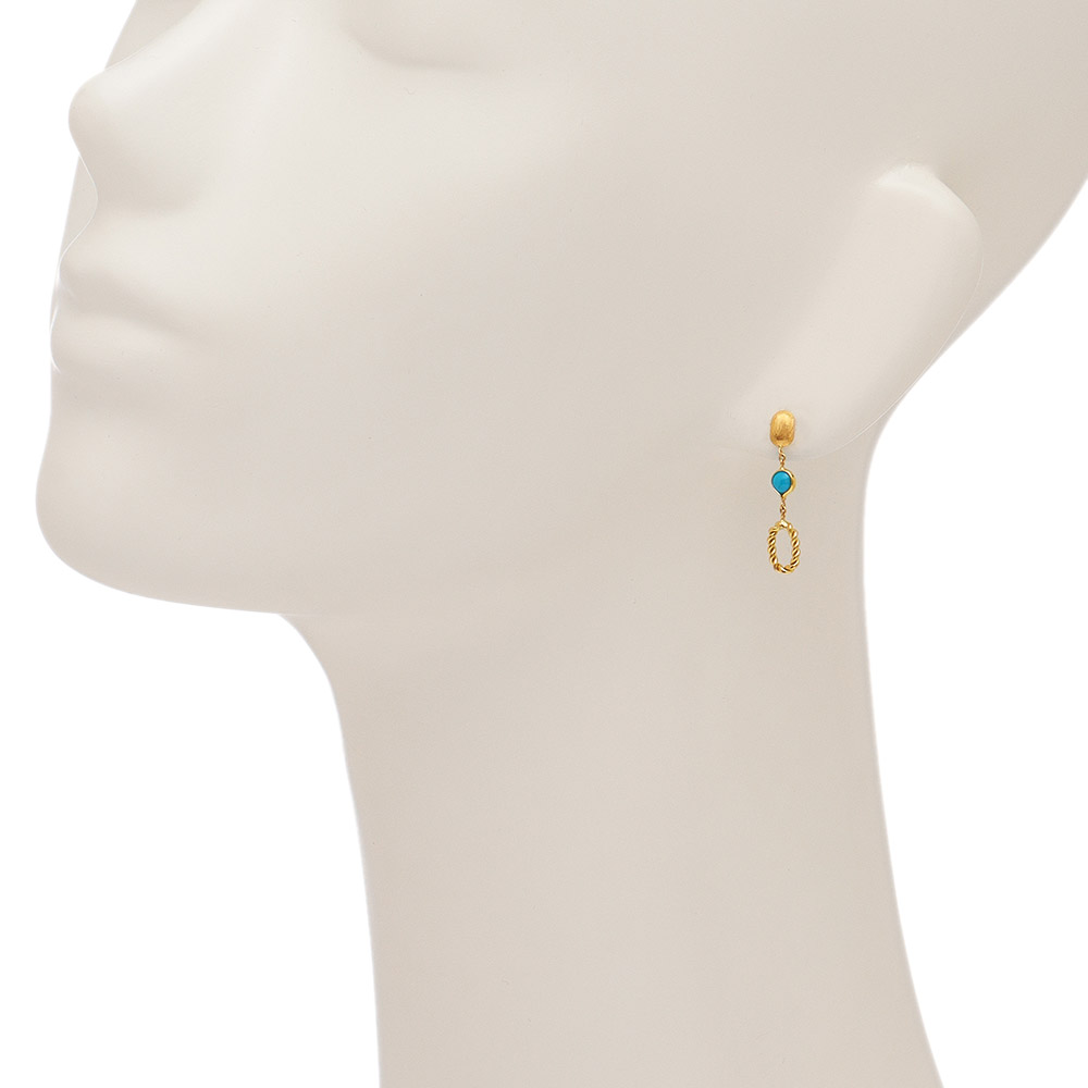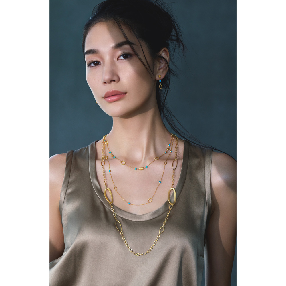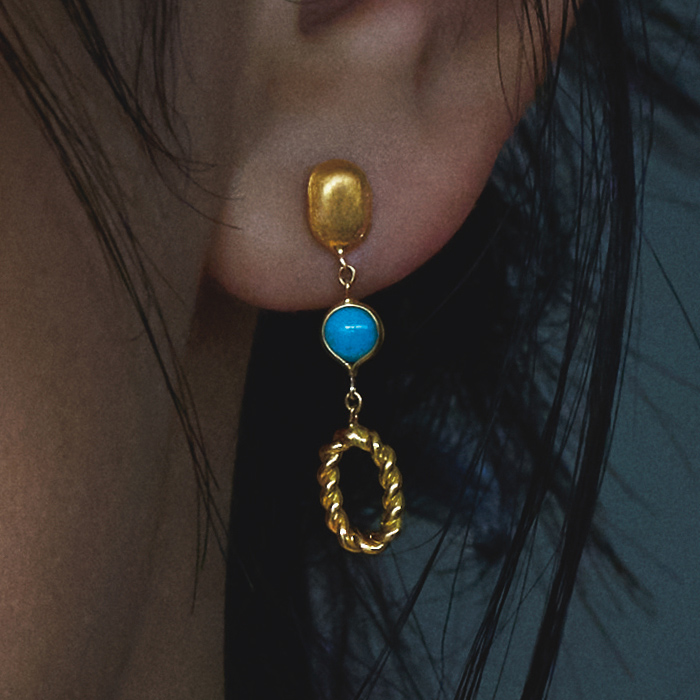 精緻な細工が織りなす構築美 イタリアン・ジュエリーカトリック教徒の一大行事、聖年(2025ジュビリー)を前に、世界の注目を集めるイタリアに思いを馳せて…。歴史と共に進化し続けるジュエリーの世界をご紹介します。大胆なだけでない精緻な細工も「ウノアエレ」らしさ。ディノスでしか手に入らないコラボアイテムを特別プライスでお届けします。質感も大きさも異なるオーバルエレメンツとターコイズをつなげたピアス。