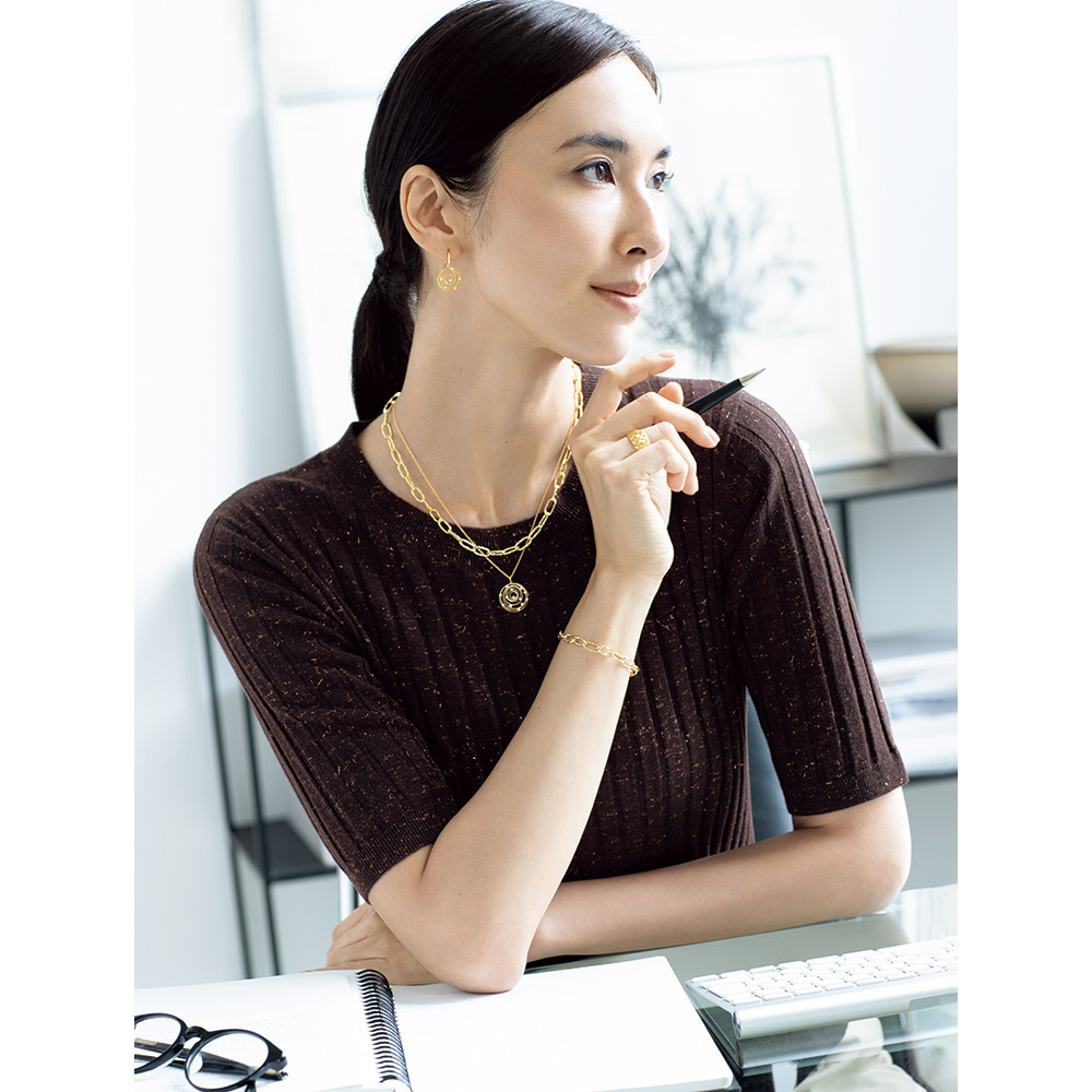 CAREER JEWELRYキャリアに寄り添う輝き。働く女性にとってジュエリーは、仕事への意欲や自信を高めてくれる存在。技を凝らした洗練ゴールド「ウノアエレ」との大好評コラボジュエリーを、今回特別価格でご紹介します。まだまだ人気のクリップチェーンの新作は、煌めくテクスチャーが華やか。中空構造で軽く、ネックレスとブレスレット(商品番号:107602)を繋げばロングネックレスにもなるコンバーチブル仕様。