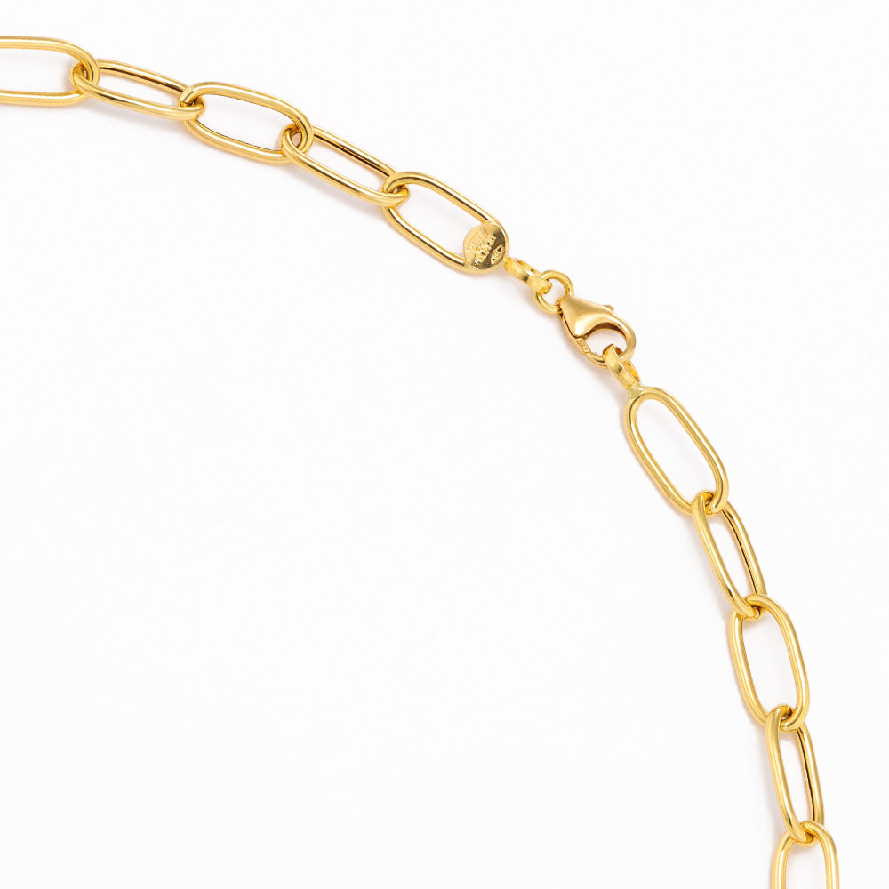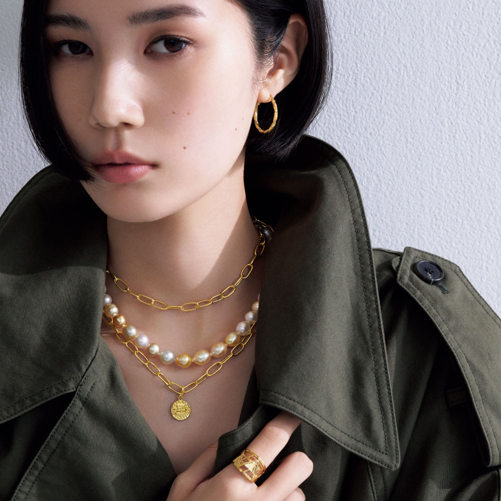 イタリア伝統の技術が冴えるゴールドジュエリーを特別価格で金細工の歴史と共に歩んできたイタリア「ウノアエレ」。高度な技術を要する中空のクリップチェーンは、軽快な着け心地。刻み模様(商品番号:J00202)を重ねる、ブレスレット(商品番号:J00205)と連結するなど、リュクスで自由な着けこなしを。
