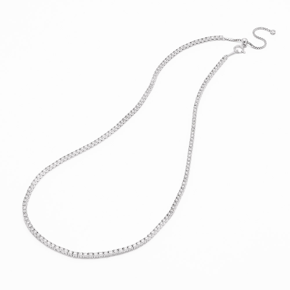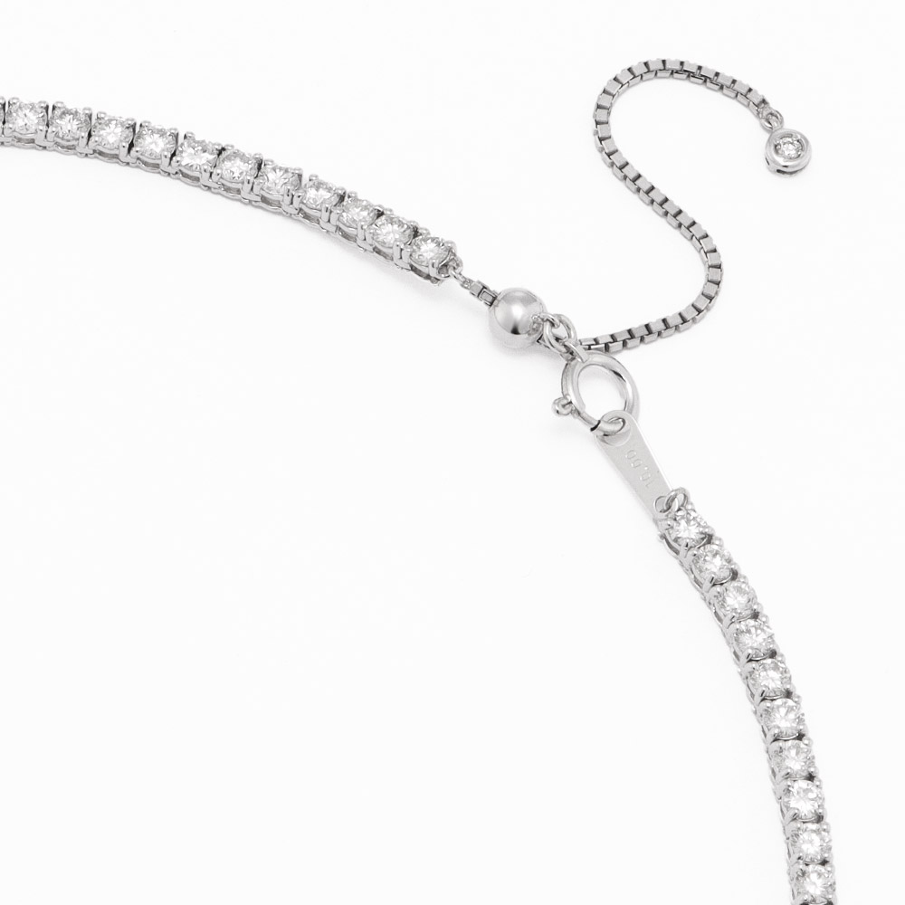 光の連なりが、滑らかにデコルテをなぞる、憧れのフルダイヤネックレス。上品な4本爪の石枠に留めることで、上質なダイヤの輝きがより強く瞬くデザインに仕立てました。スライドアジャスター式なので、装いに合わせて長さを自由にアレンジでき、レイヤードするときにも微調整が可能です。10ct、7ct、5ctの3種類をご用意しました。