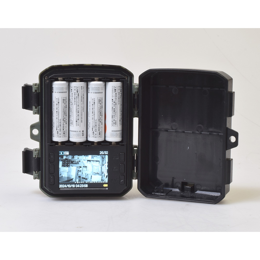 赤外線センサーが人や動物を感知し自動撮影します。昼間の撮影はもちろん、赤外線LED(4灯)により夜間の撮影も可能です。動画/静止画の撮影が可能で、動画時は音声も録音可能(ON/OFF設定)です。動画は最大4K(3840×2160P)、静止画は最大5000万画素(補間)で撮影可能です。撮影した動画や静止画は、すぐに本体搭載の2.0型液晶画面で再生が可能です。使用電源は単3電池×4本(別売)なので、コンセントが無い場所でもご使用いただけます。赤外線センサーが人や動物を感知した場合のみ撮影し、記録・保存(マイクロSDカード8GB〜256GB(別売))するので、不要な電池の消耗を軽減します。固定用バンドやブラケットが付属のため、木や柱等に取り付ける事も可能。三脚ネジ穴も装備しています。IP65規格なので、雨や粉塵から本体を保護します。