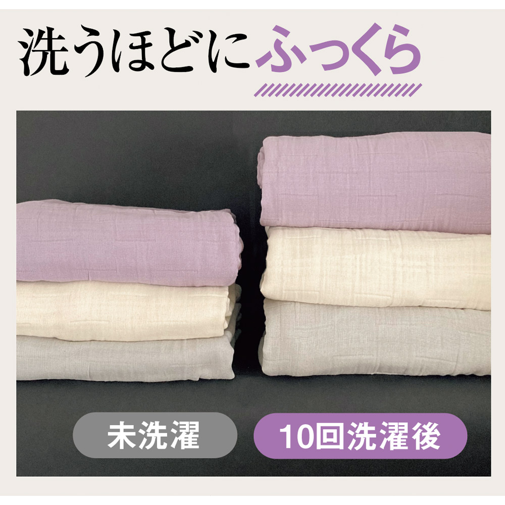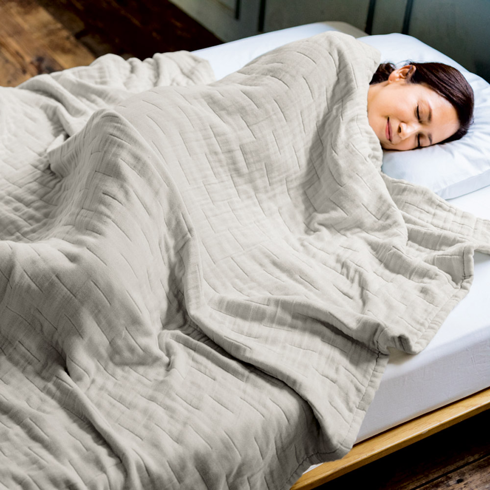 1年中ガーゼにくるまれていたい、そんなガーゼ好きの方必見!8重にも重ねたガーゼの軽やかな層と、ふんわりさらさらな肌ざわりがたまらないガーゼケットです。最先端技術から生まれた今注目の浅野撚糸の「スーパーゼロ(R)」を使い、驚きの軽さとボリュームと吸水性を叶えました。しかも洗うたびふんわりやわらかに!使うほどに育つ風合いにも癒されます。洗うほどふわっふわになる!最先端の糸で紡いだ8重ガーゼの幸せケット浅野撚糸の「スーパーゼロ(R)」は、糸の間に空気の隙間をつくる世界初の撚糸工法により生まれた今話題のオーガニックコットンの糸。その糸で織り上げたオーガニックコットンのガーゼ生地を肌面に使用し、8層にも重ねたケットです。もっちりとしたボリュームがありながら空気をたっぷり含んで軽く、吸水性も良いので肌ざわりはどこまでもサラふわ。洗うほどに繊維がほぐれてふっくら育つ風合いは、ガーゼ好きならずとも愛着が湧く一枚です。【ポイント】(1)とっても贅沢なガーゼの8重仕立て(2)サラふわの肌ざわりを生む優れた吸水性(3)洗うほどふっくら育つケット【ポイント1】とっても贅沢なガーゼの8重仕立てふんわり織り上げたガーゼ生地の層が空気を含むから、軽くてやわらかくてボリュームたっぷり。春秋の季節の変わり目はもちろん、夏のエアコンの冷え対策や冬に毛布代わりとしてもオールシーズンお使いいただけます。1年中包まれていたくなる心地よさです。【ポイント2】サラふわの肌ざわりを生む、優れた吸水性肌面にはスーパーゼロ(R)を使用しているので、汗や湿気などの水分もすばやくたっぷり吸収し、睡眠中の不快なムレを軽減します。季節を問わず、さらりとした肌ざわりが楽しめます。【ポイント3】洗うほどふっくら育つケットスーパーゼロ(R)は世界初の撚糸工法により、糸に空気の隙間をつくった糸。洗うほど繊維がほぐれ、空気を含み風合いが変化するのでふわふわに育ちます。