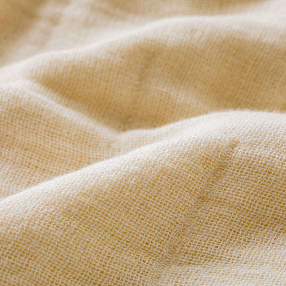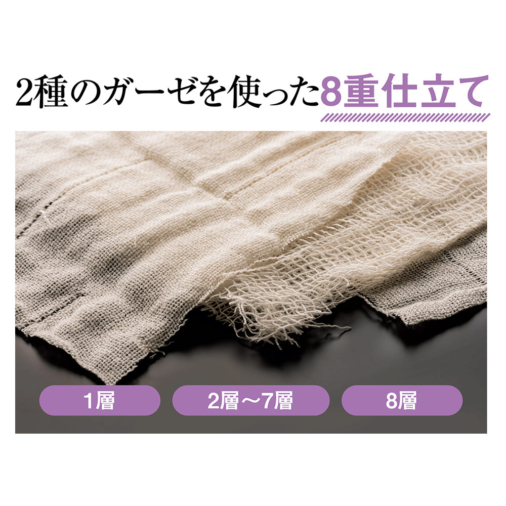 肌に触れる1層目と8層目は織りの詰まった「スーパーゼロ(R)」を、間の2層〜7層はざっくりとした異なるガーゼを重ねることで空気をたっぷり含み、軽くてやわらかい仕上がりに。