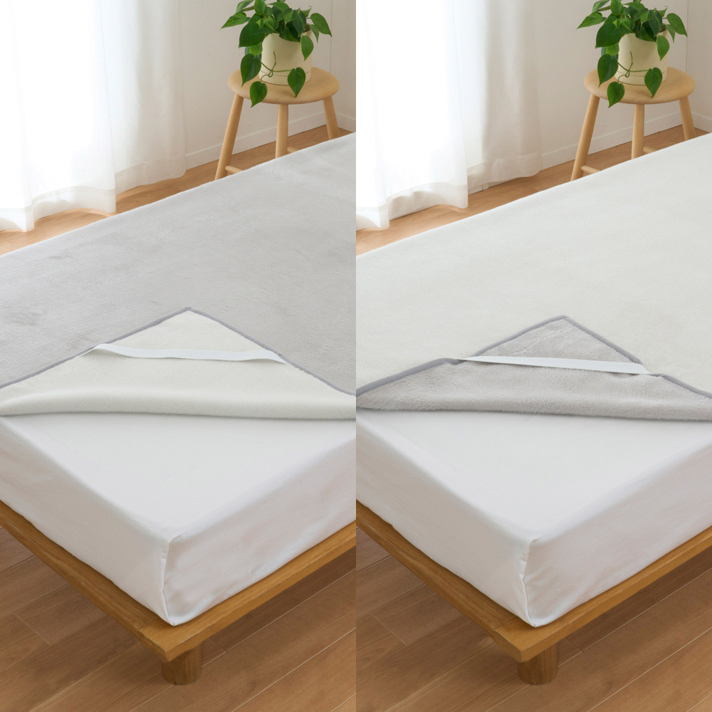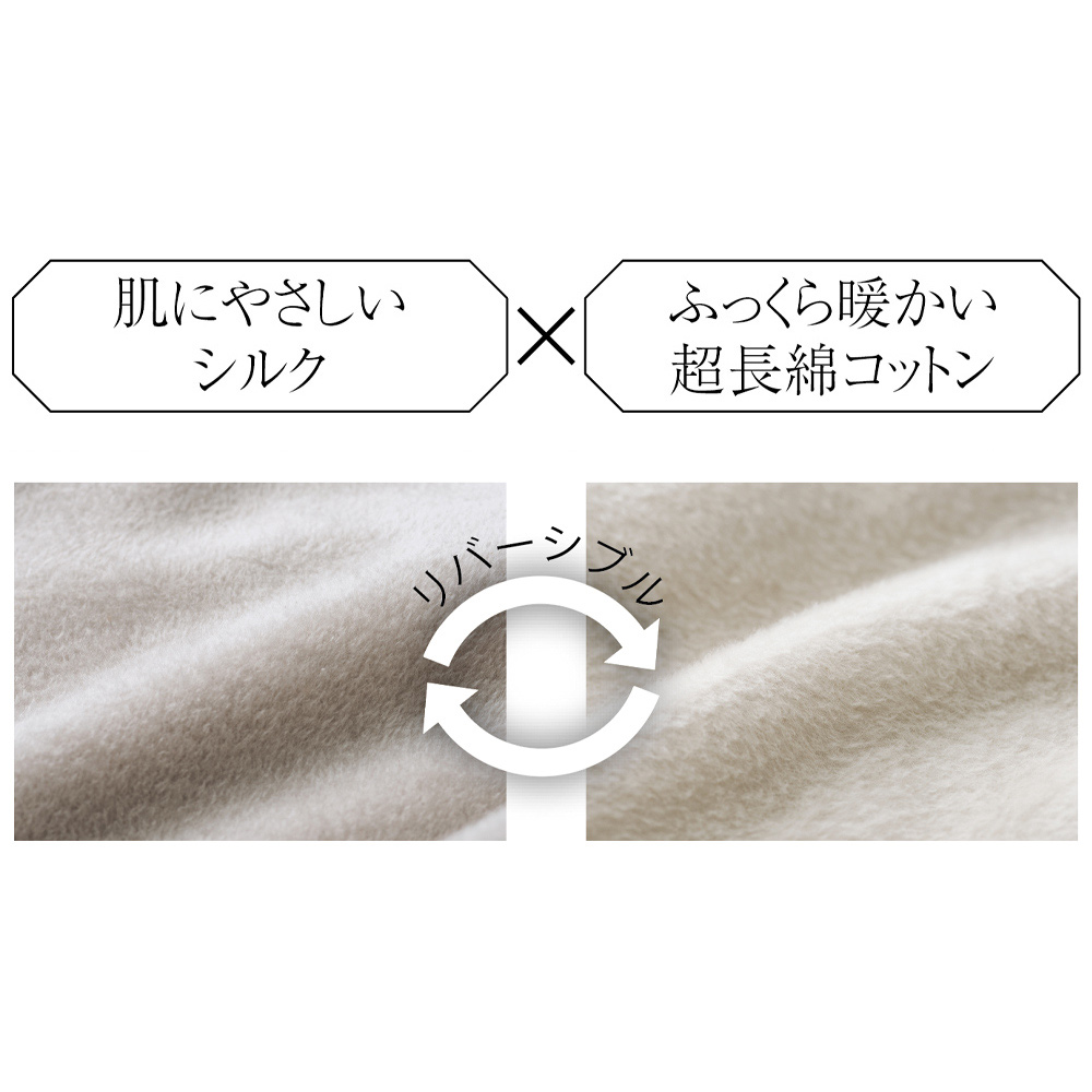 シルク面とコットン面をお好みや気分で使い分けられるリバーシブルの仕様の敷き毛布。(ウ)グレージュ×ホワイト