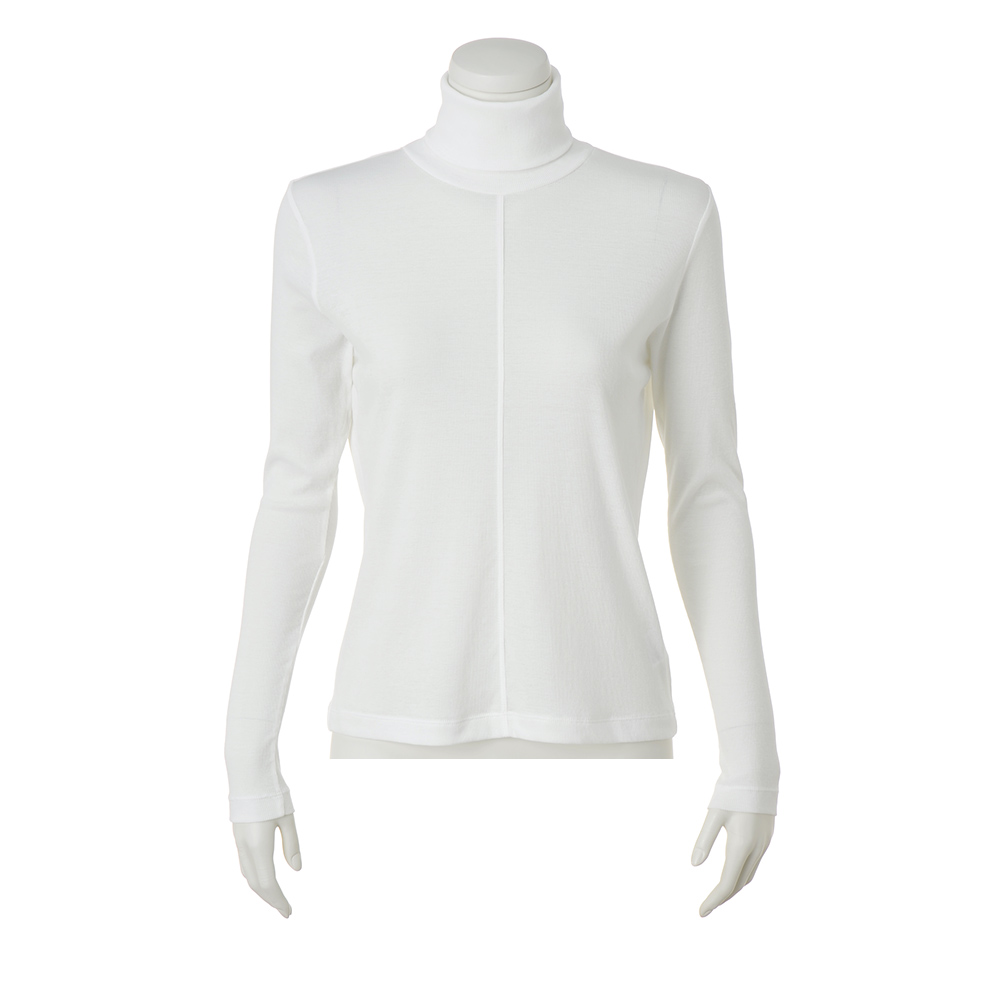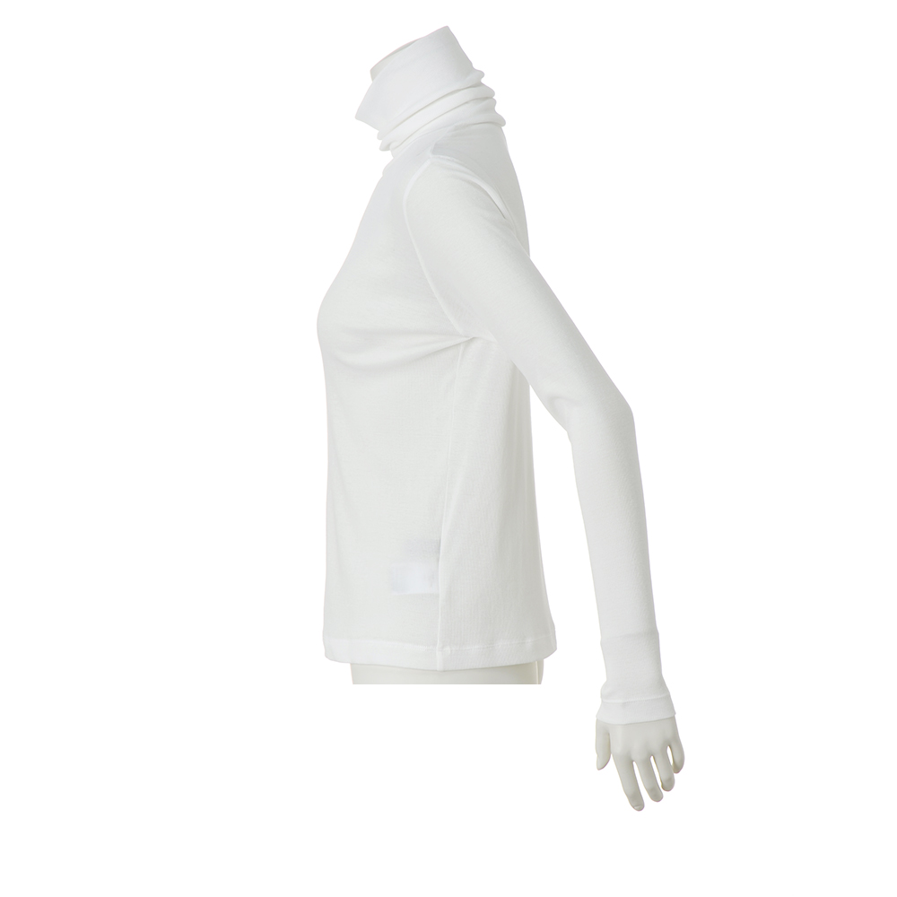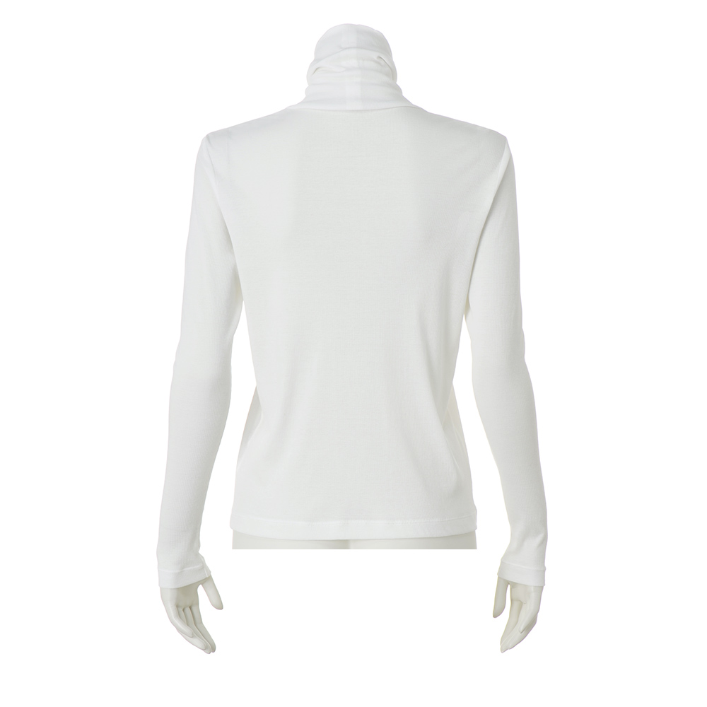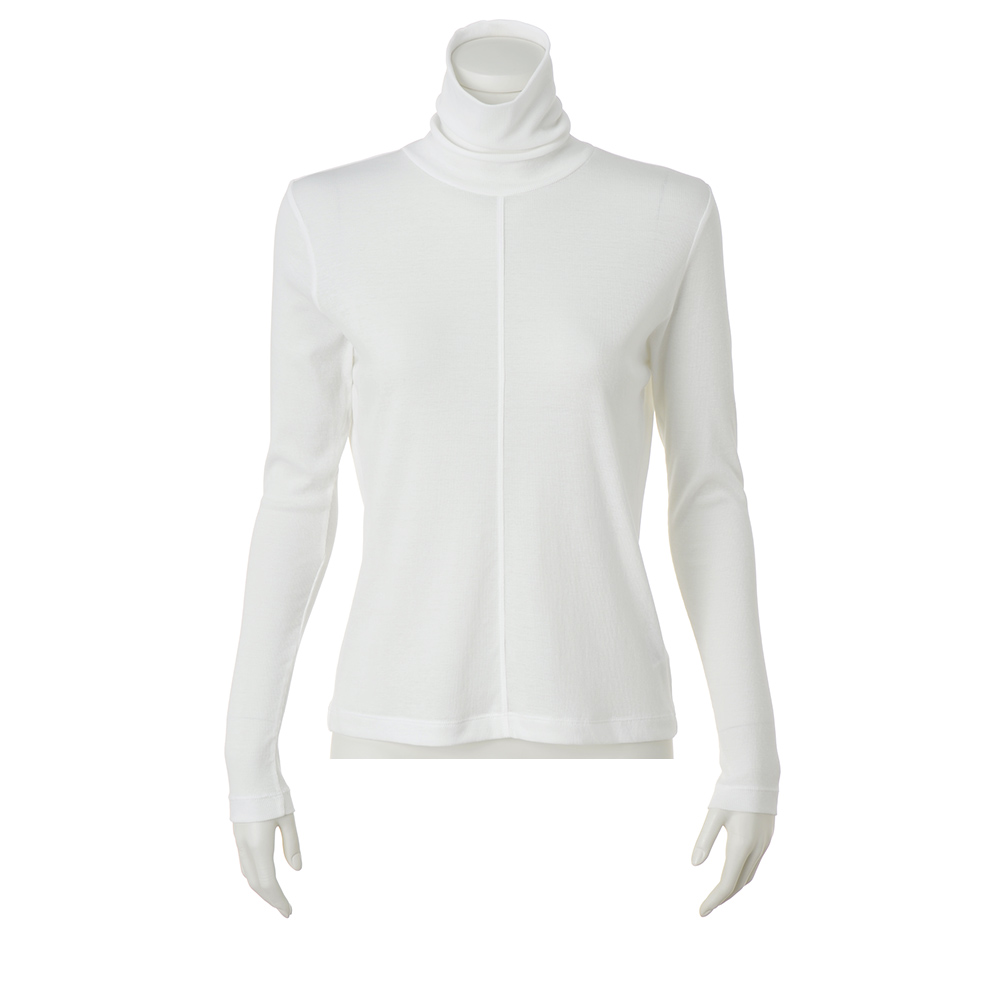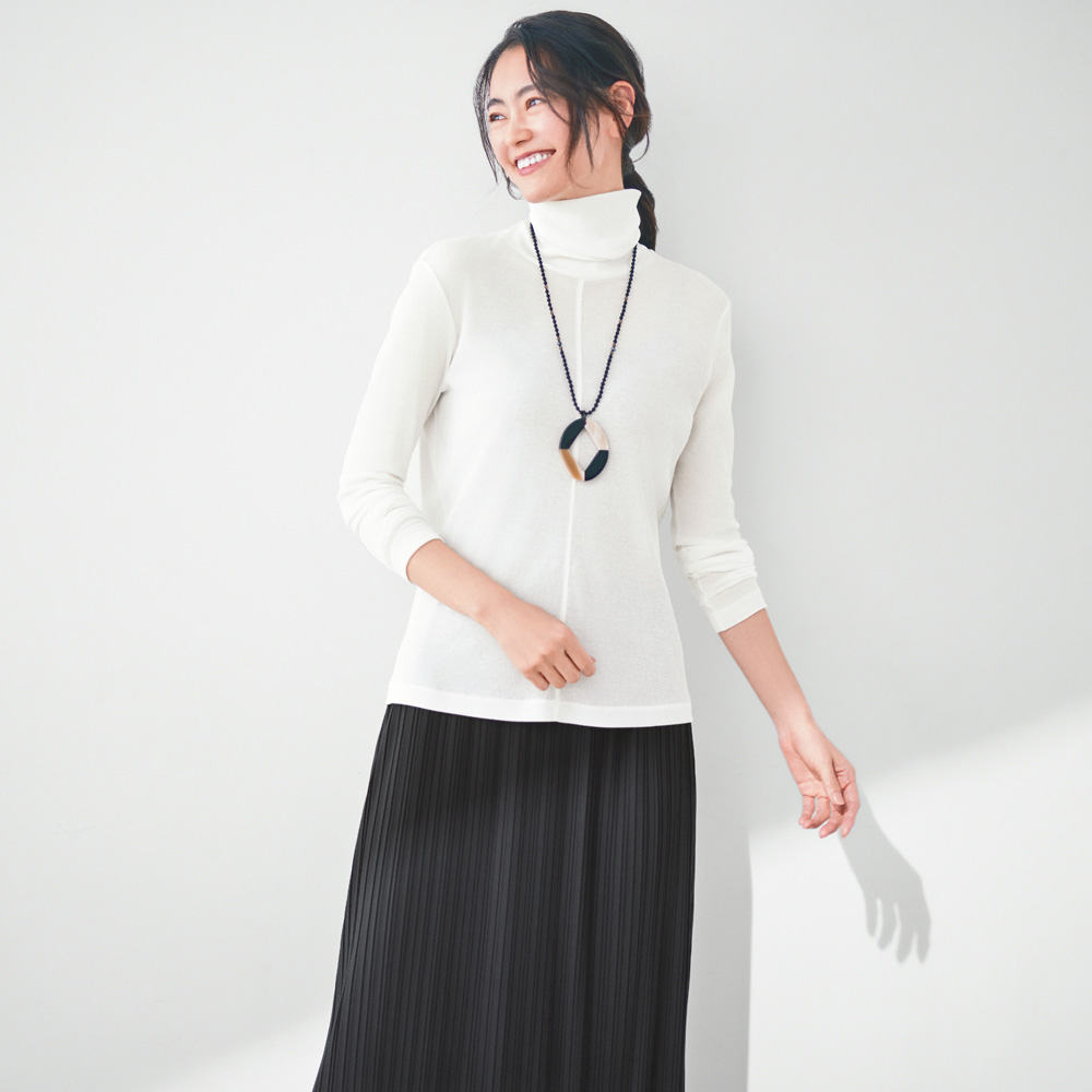 DAMA And 2025 Autumn BASIC COTTON ITEMSデイリーに爽やかさを贈る、贅沢仕立ての「ベーシック」コットン素肌に優しく、オールシーズンさらりと快適―。毎日でも着たい爽やかコットンで、上質な日常着をお作りしました。細部まで拘りを詰め込んだ大人目線のベーシックアイテムです。空気を纏うように心地いい、繊細なピュアコットンサラリとした強撚コットンが、身体を優しく包む人気のプルオーバー。繊細に編み立てたハイゲージジャージーは、ほんのりとした透け感と光沢感を持つ、肌離れのよい素材。それを付かず離れずのシルエットに仕立て、身頃センターの接ぎでスラリとした印象に引き立てました。タートルネックはダブルで柔らかな表情に。腰に掛かる着丈はパンツとも相性がよく、一枚で、またインナーとしてオールタイム活躍します。