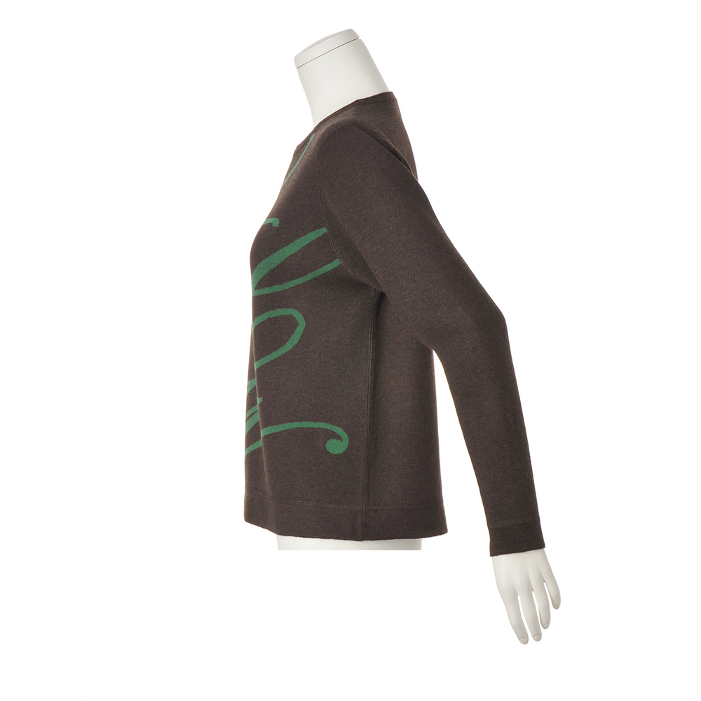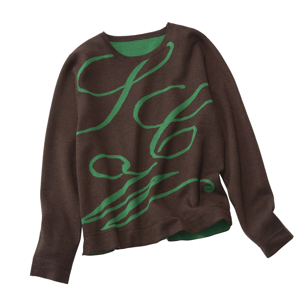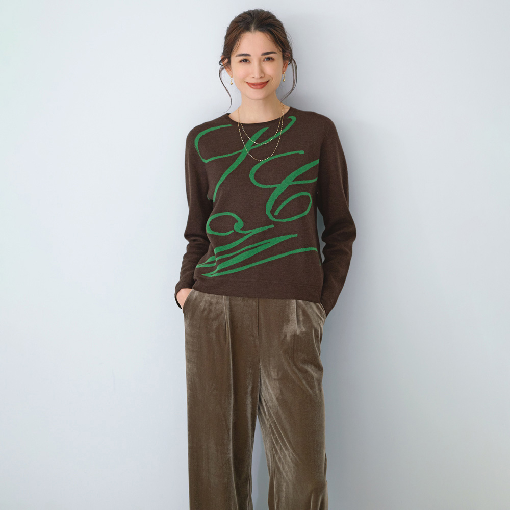 テクニックデザインニット目新しいものをお探しの方は必見!一着で主役になれる、デザインニットにクローズアップ。ベーシックなボトムに合わせるだけで、旬のコーディネートが即完成します。モードなカラーリングが魅力。大人のためのリバーシブルニット流れるような筆記体のアルファベットが女性らしい繊細さを表現。リバーシブルで着用でき、ダークブラウンとグリーンの配色が絶妙。ダークブラウン面は落ち着いたシックな印象、グリーン面は顔映りよく華やかな雰囲気に。