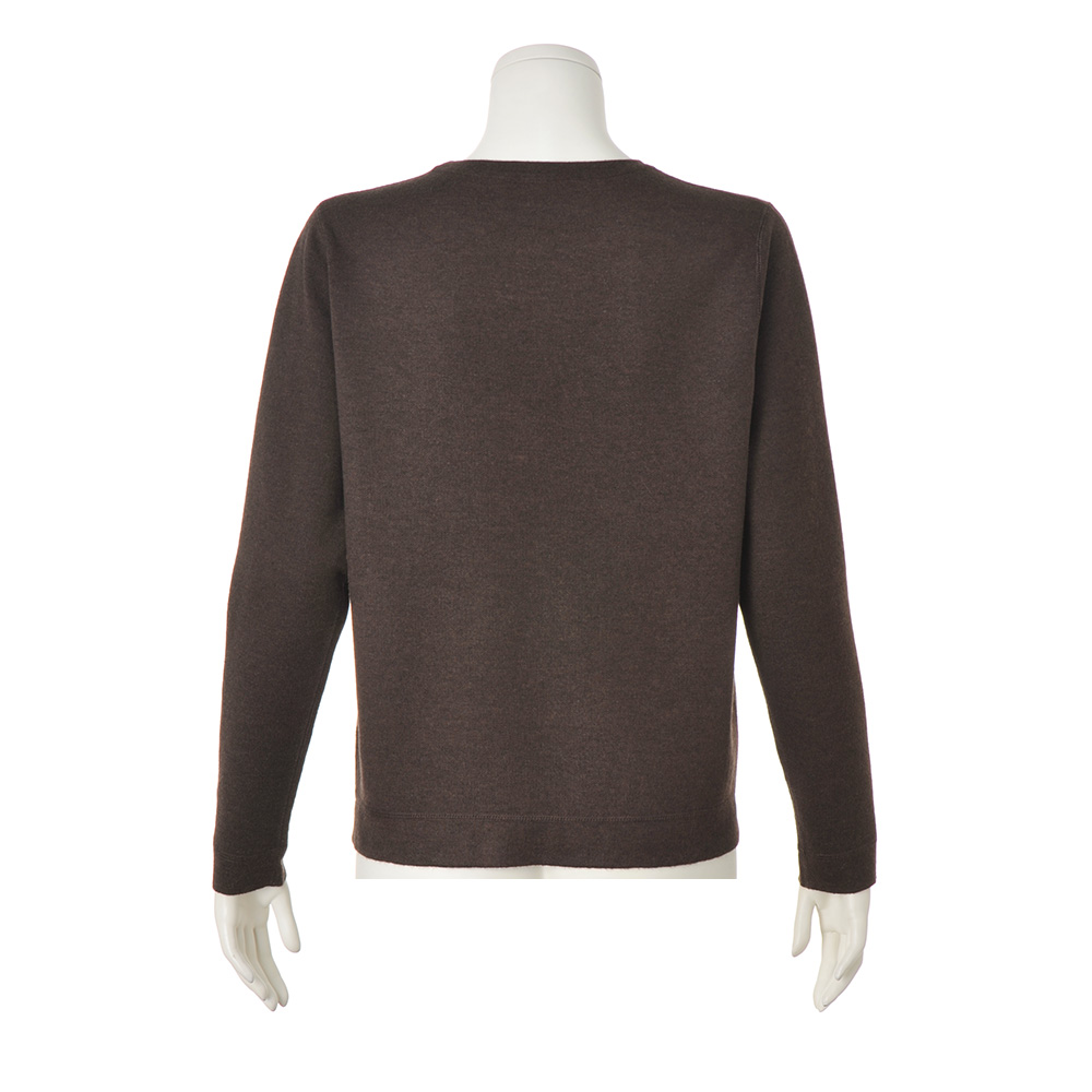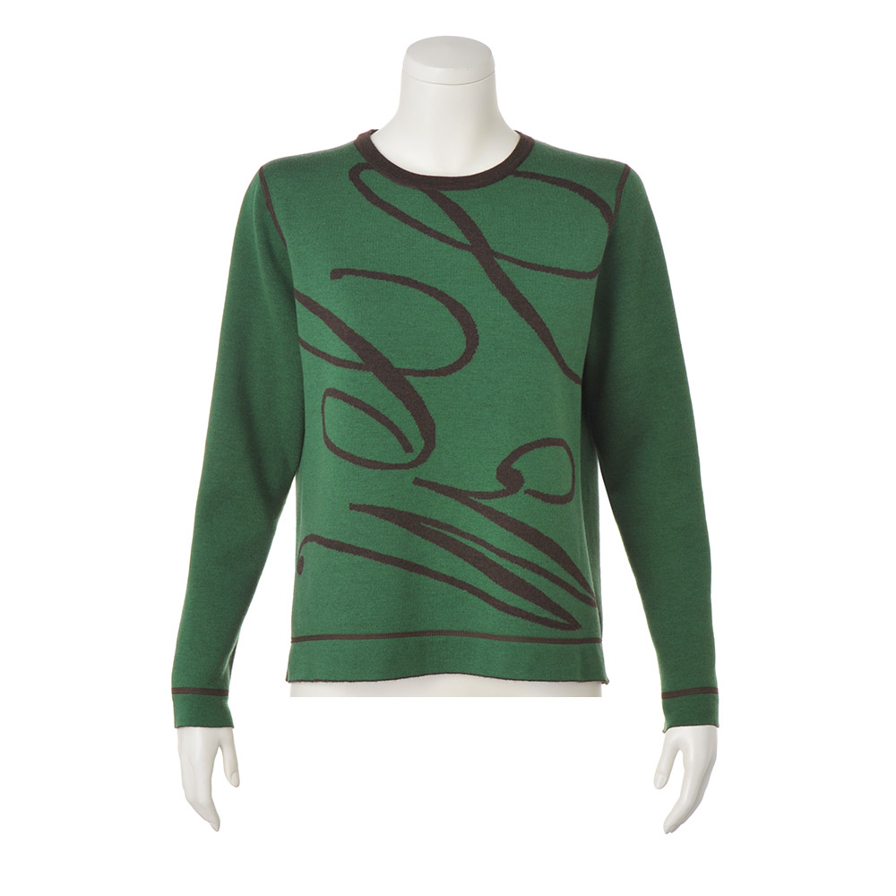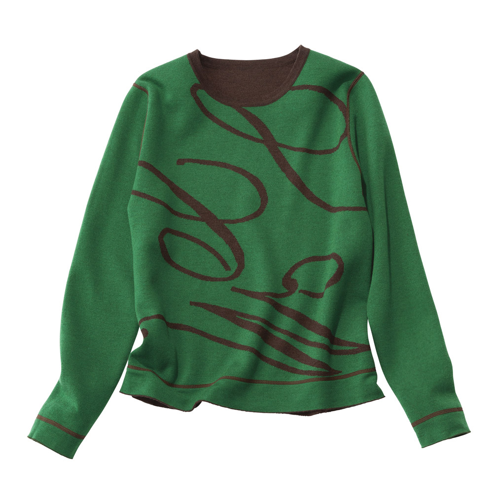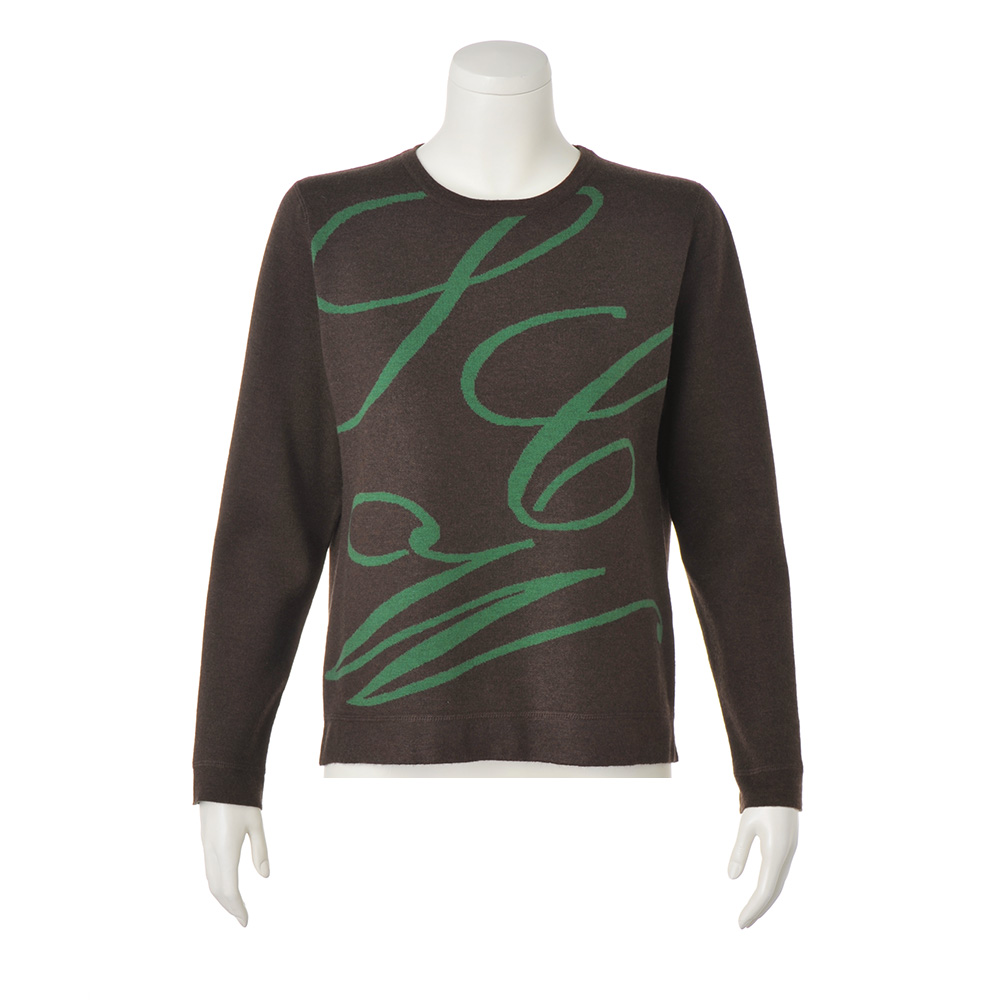 テクニックデザインニット目新しいものをお探しの方は必見!一着で主役になれる、デザインニットにクローズアップ。ベーシックなボトムに合わせるだけで、旬のコーディネートが即完成します。モードなカラーリングが魅力。大人のためのリバーシブルニット流れるような筆記体のアルファベットが女性らしい繊細さを表現。リバーシブルで着用でき、ダークブラウンとグリーンの配色が絶妙。ダークブラウン面は落ち着いたシックな印象、グリーン面は顔映りよく華やかな雰囲気に。