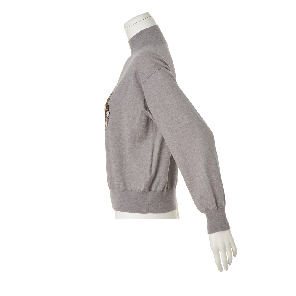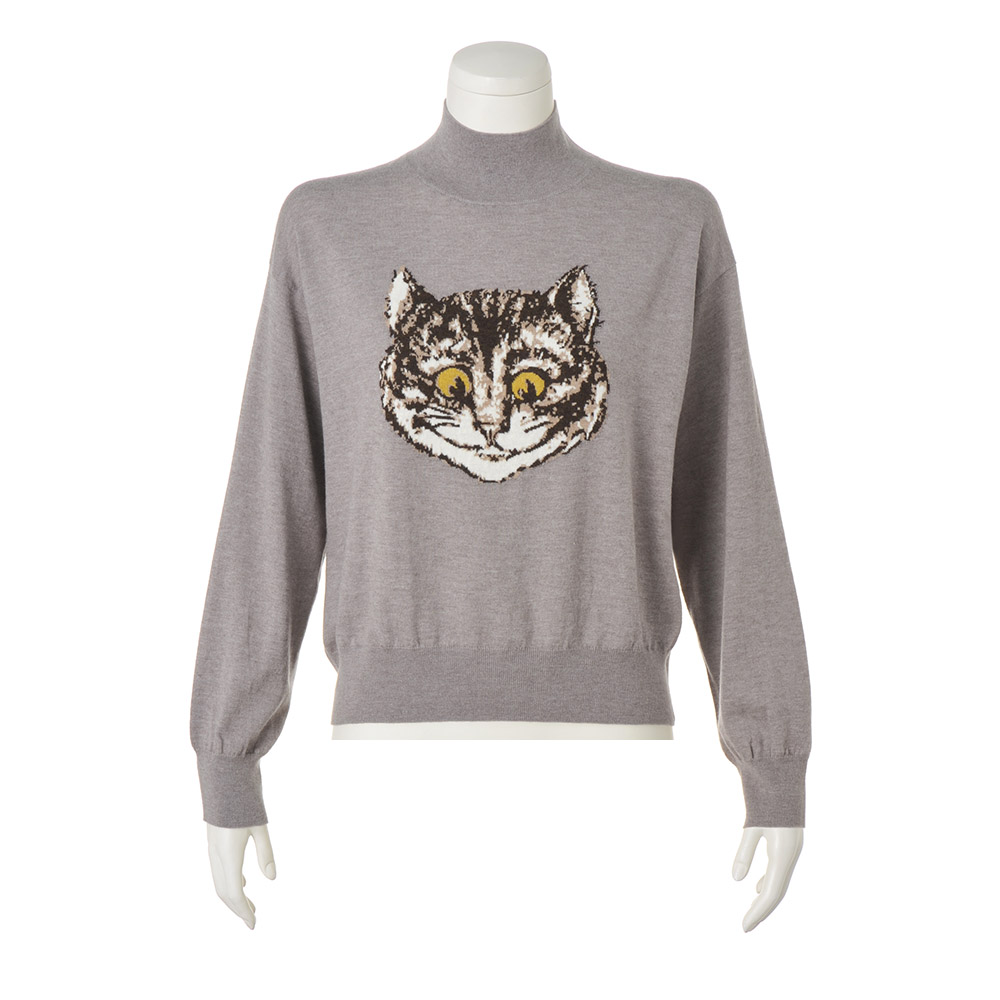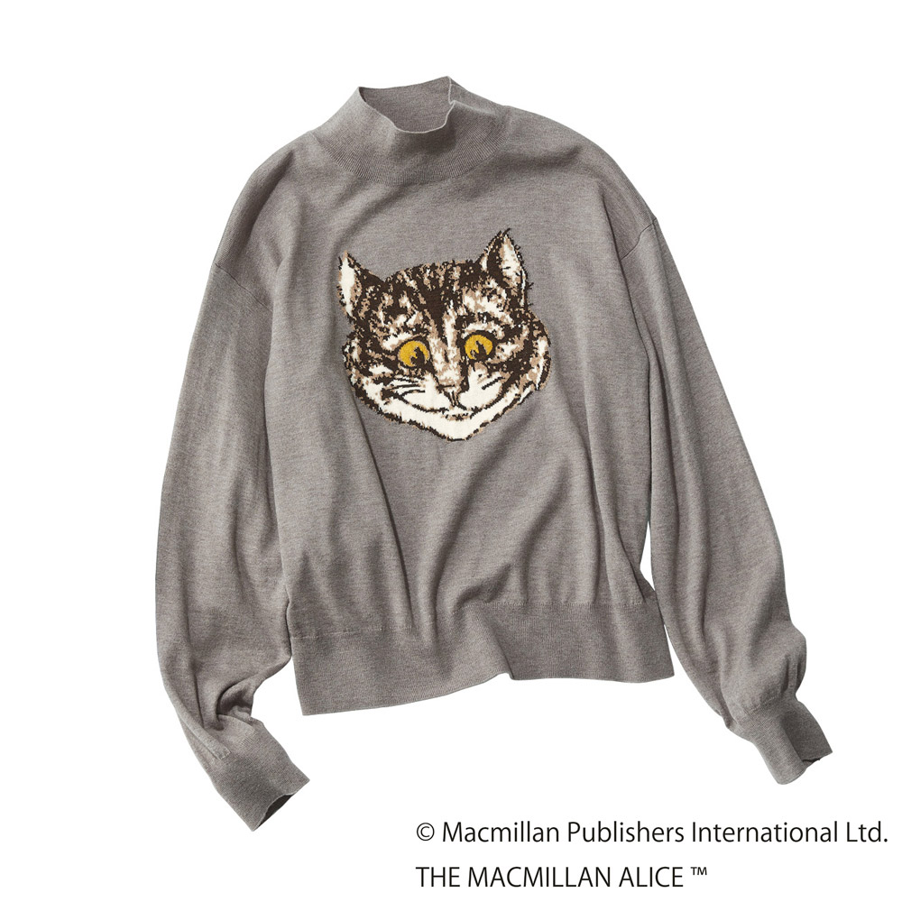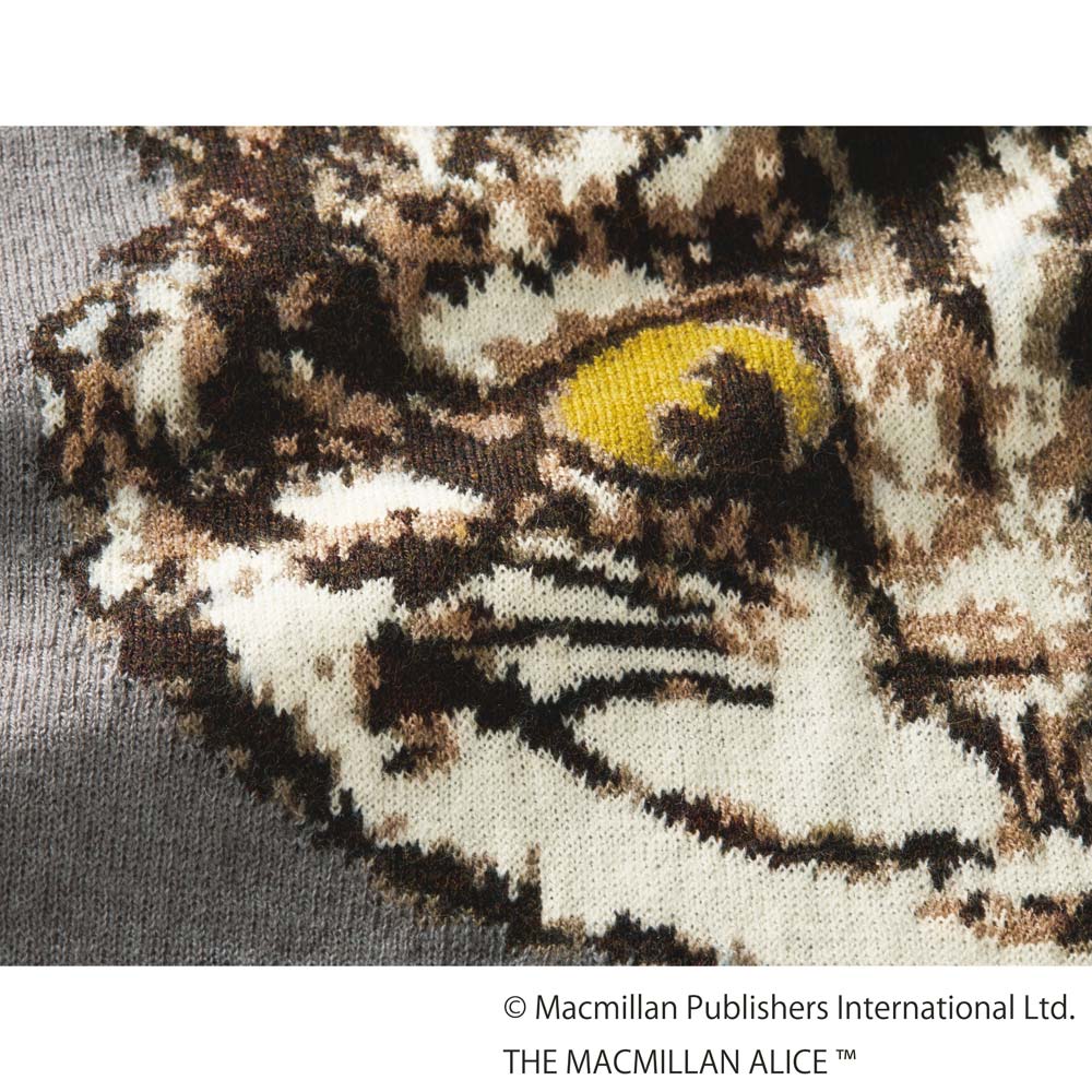 SPECIAL COLLECTION ITEMSこの冬のスペシャルコレクションは、英国の出版社「マクミラン」社が世に出したアリスの物語に登場するキャラクターたち=「マクミラン・アリス」。甘すぎない絵柄を、旬のデザインにのせてご提案します。大胆な「チェシャー・ネコ」の顔柄を繊細なハイゲージのジャカード編みで程よい高さのハイネック、ゆとりのある身幅、少し短めに設定した着丈で、ボトムを選ばずに着回せる一枚。ややグレーがかったライトブラウンのボディが、細やかなジャカード柄を品よく引き立てて。肉厚すぎないので長期間着られるのも嬉しい。