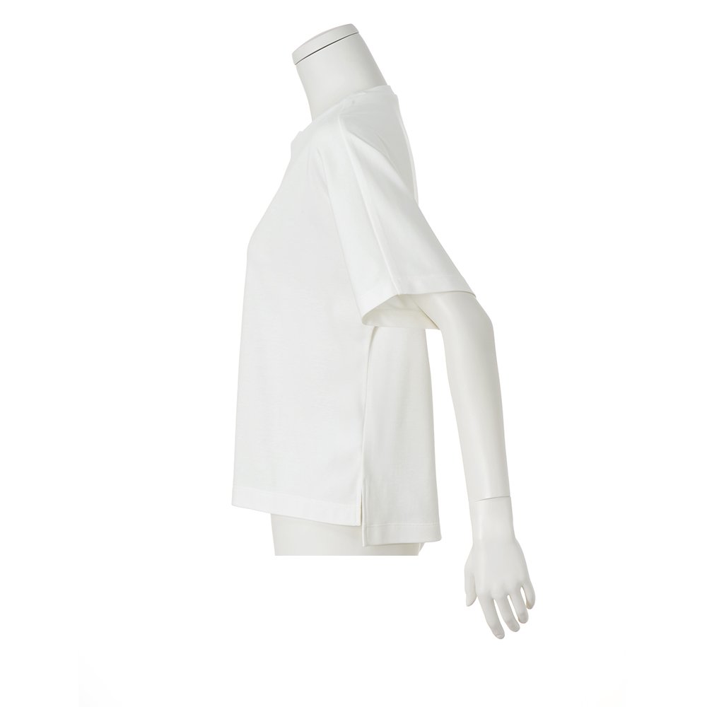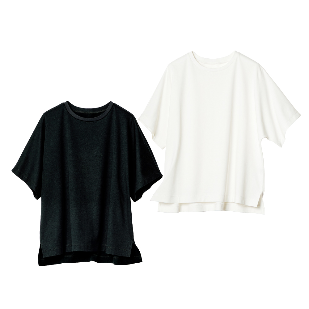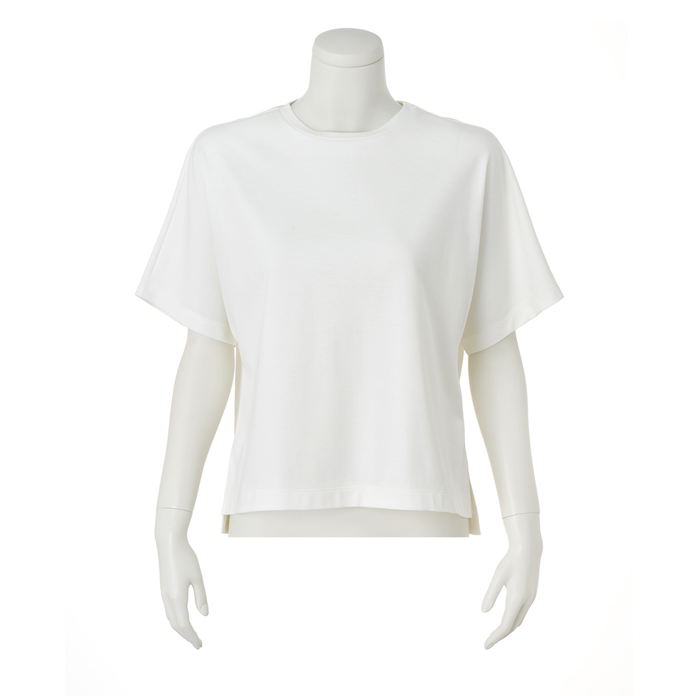 汗も紫外線も、しっかり対策。降り注ぐ紫外線を跳ね返し、汗による色変化も抑制。 ゆるっとオーバーサイズも短め丈とドルマン袖で今っぽく。一枚で「夏のお悩み」が軽減する機能性Tシャツを、どちらも活躍すること間違いなしの定番2色で。綿100%の生地は糸と編み地の2段階でダブルシルケット加工を施し、さらにUVカットと汗ジミ防止の機能性もプラスしました。シルクのような光沢感と心地よいふくらみがあり、安心の機能性で存分に夏のお洒落を楽しめます。さらっと肌離れのよい生地でも、身体にまとわりつかないようフォルムにも拘って。リラックス感のあるゆったりシルエットにドルマンスリーブをセット。両裾は前後差をつけてスリットを入れ、抜け感も忘れずに。コンパクトな短め丈はボトムスを選ばず、すっきりしたバランスで着こなせます。