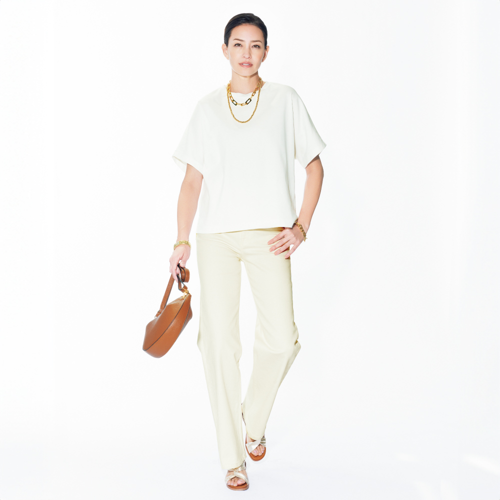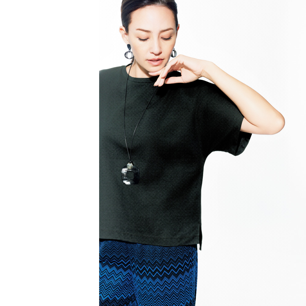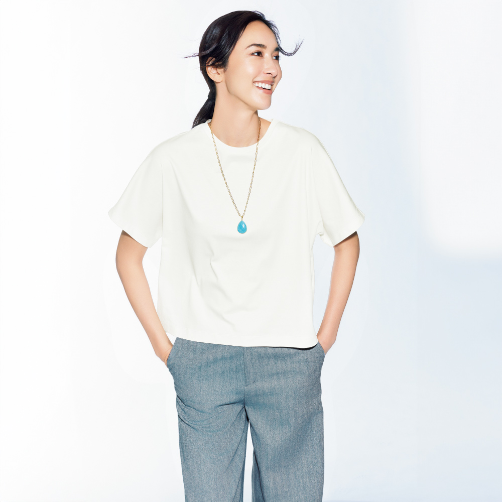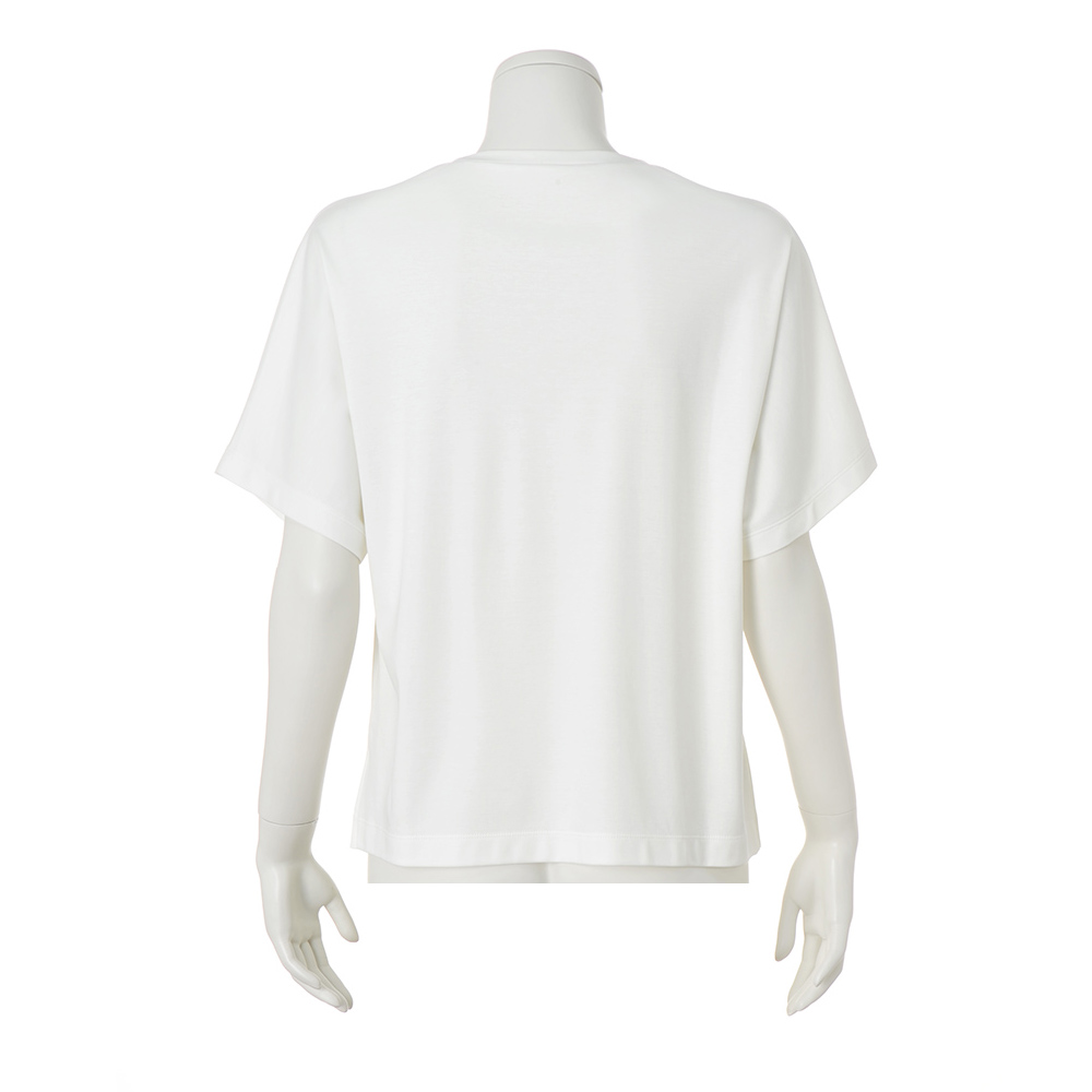 汗も紫外線も、しっかり対策。降り注ぐ紫外線を跳ね返し、汗による色変化も抑制。 ゆるっとオーバーサイズも短め丈とドルマン袖で今っぽく。一枚で「夏のお悩み」が軽減する機能性Tシャツを、どちらも活躍すること間違いなしの定番2色で。綿100%の生地は糸と編み地の2段階でダブルシルケット加工を施し、さらにUVカットと汗ジミ防止の機能性もプラスしました。シルクのような光沢感と心地よいふくらみがあり、安心の機能性で存分に夏のお洒落を楽しめます。さらっと肌離れのよい生地でも、身体にまとわりつかないようフォルムにも拘って。リラックス感のあるゆったりシルエットにドルマンスリーブをセット。両裾は前後差をつけてスリットを入れ、抜け感も忘れずに。コンパクトな短め丈はボトムスを選ばず、すっきりしたバランスで着こなせます。