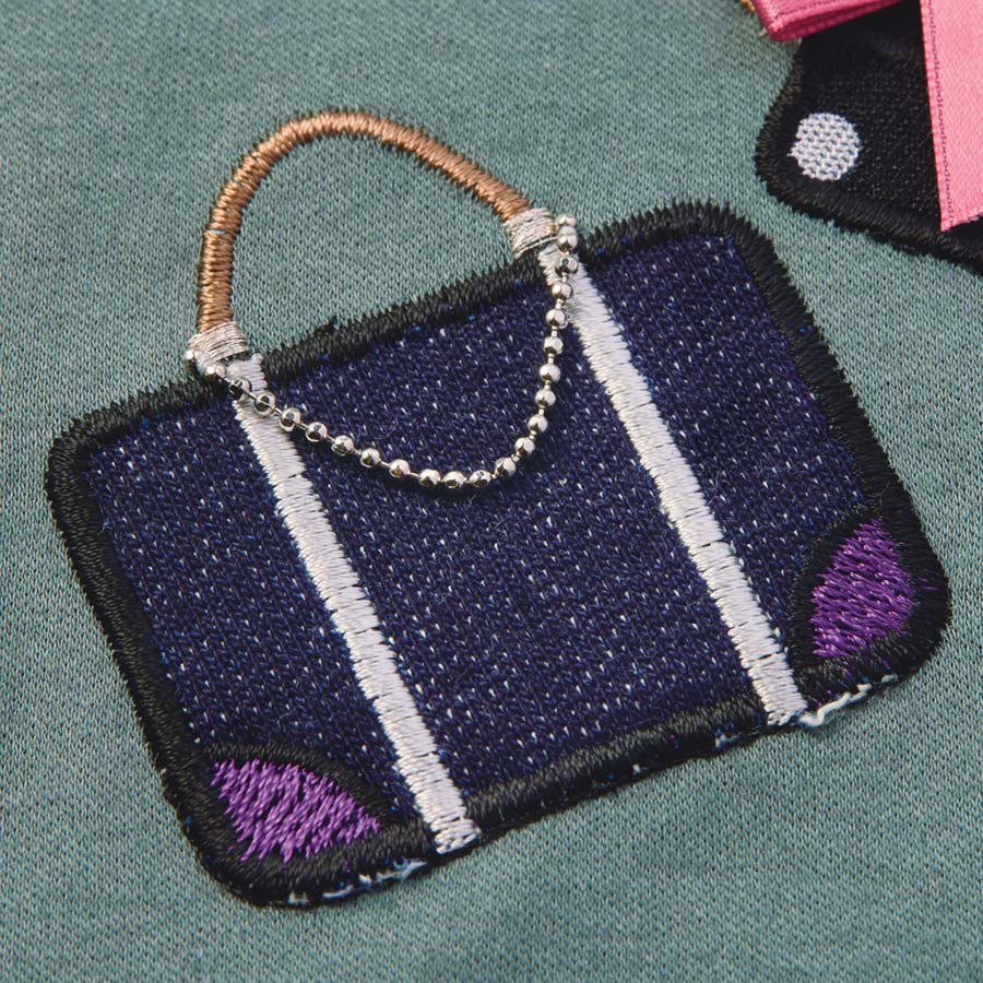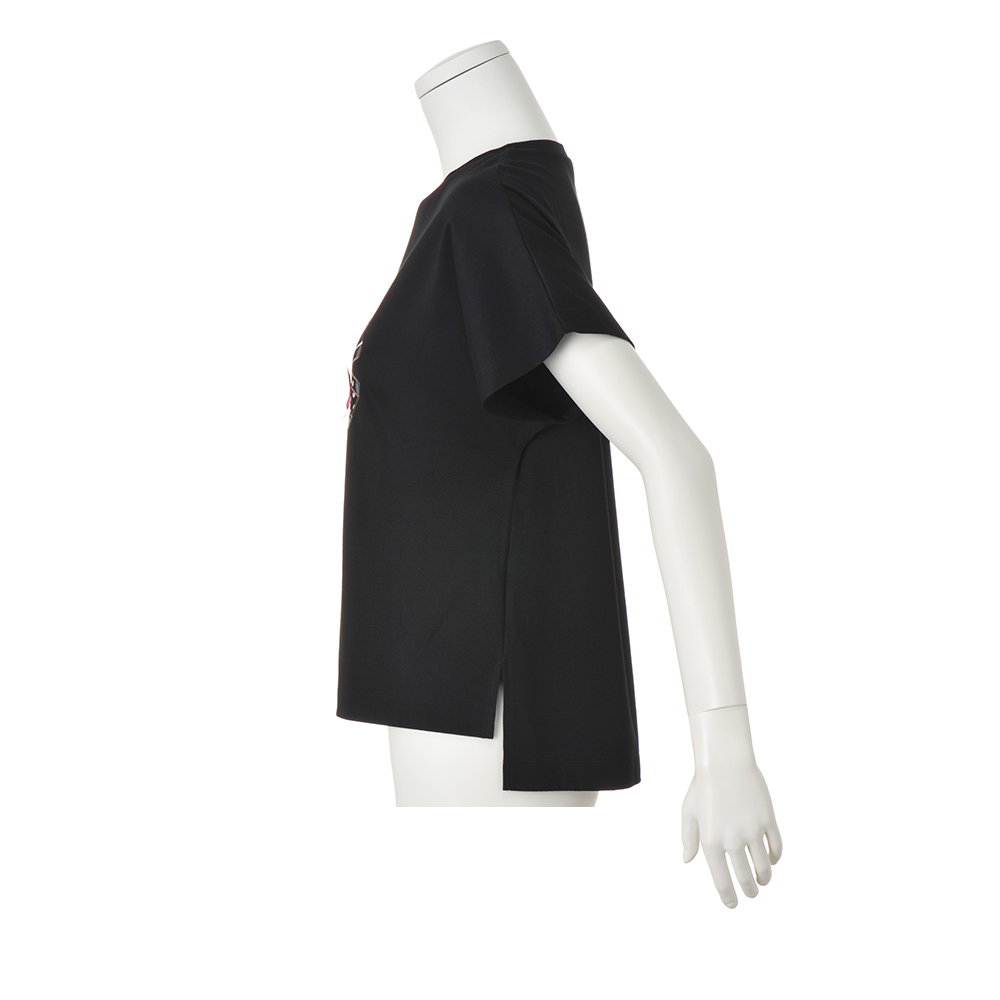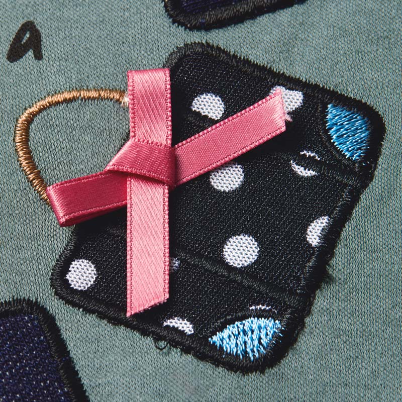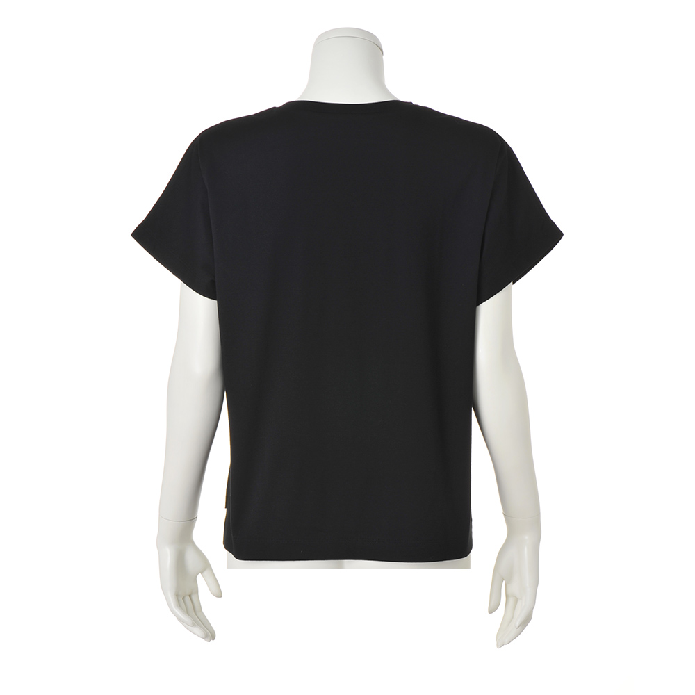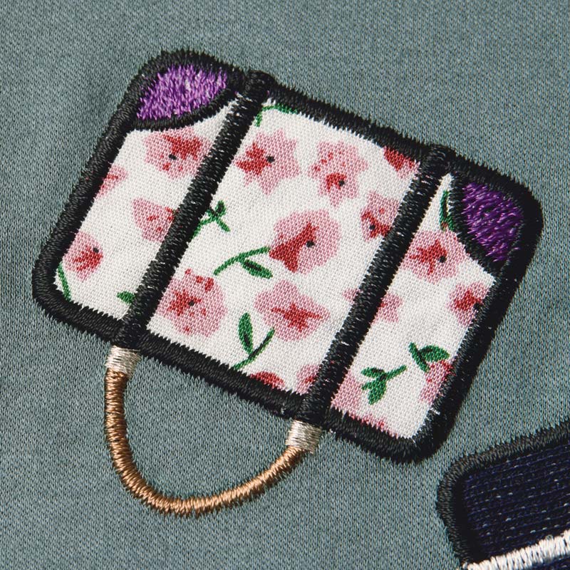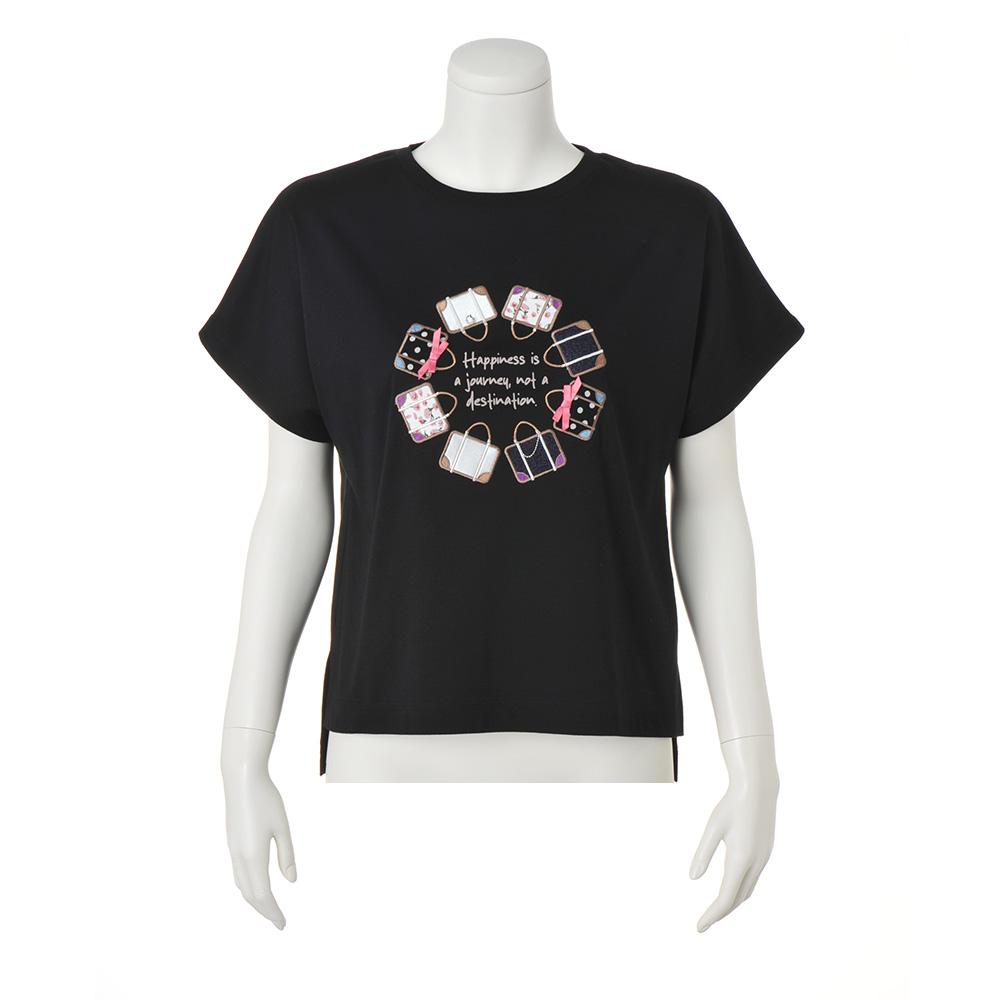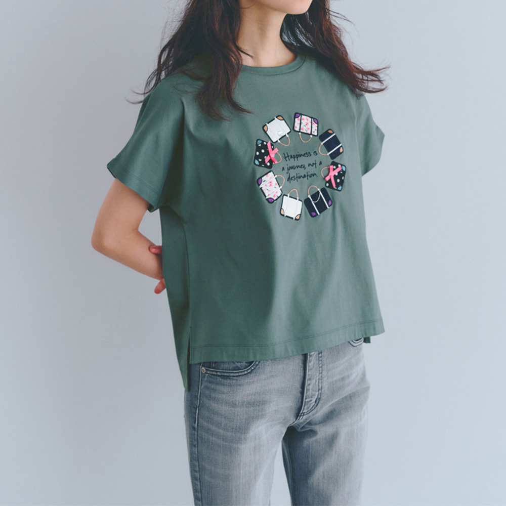 主役級Tシャツ柔らかいシルケットスムース生地を使用し、前後差のある丈と共布仕立ての襟でカジュアルすぎない印象に。バッグ部分は別布を使用し、パッチワーク刺しゅうをほどこしています。中央には筆記体で「幸福は目的地にあるのではなく、そこへいたる道中の旅にある」とプリント。