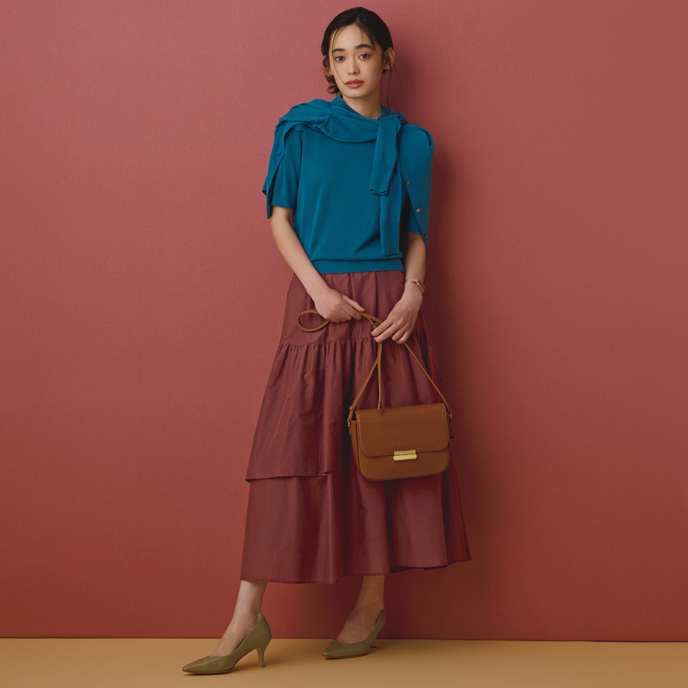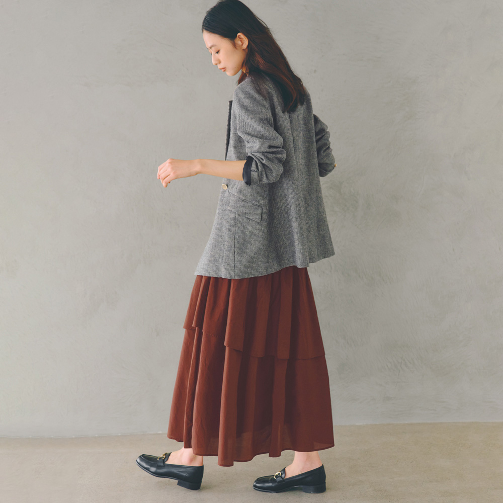 • コーディネート例 /ビターな甘さで魅せる、秋色レイヤード…フェミニンなティアードスカートに軽やかなジレをオン。足元はスニーカーでハズすと、今年らしいバランスが完成。