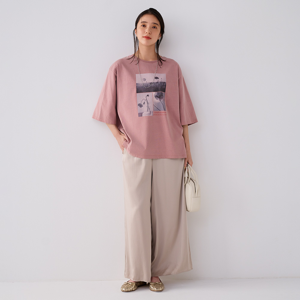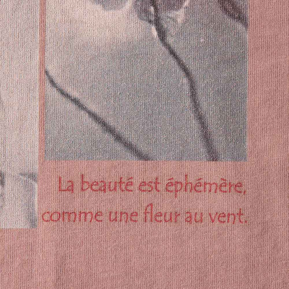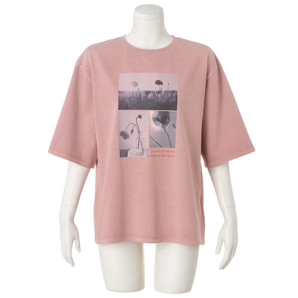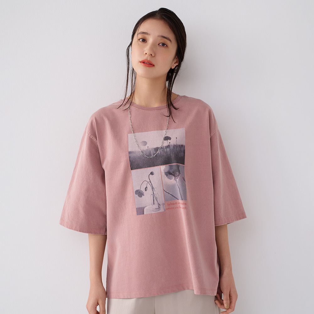 こなれた表情で、大人の余裕を映す*フォトプリントTシャツ*ピグメント加工を施すことで、ほんのりとムラ感のあるヴィンテージライクな色合いに仕上げました。着込んだような柔らかさと、ニュアンスのある発色が、装いに自然な奥行きをもたらします。胸元には、何気ない一瞬を切り取ったフォトプリントを配置。モチーフとなっているのは、フランス語で「コクリコ(coquelicot)」と呼ばれるひなげしの花。ひなげしは、儚さや美しさ、自由、そして一瞬の輝きを象徴する花として、詩や文学の世界でも愛され続けています。フランス国旗の「赤」をひなげしの色にたとえる、詩的な解釈があるほど、感性豊かな存在です。プリントには、ひなげしをイメージした詩の一節を添えて。「美しさは儚い、風に揺れる花のように」静かなメッセージが、大人の装いにさりげない物語性をプラスします。≫POINTルーズなボックスシルエットと長めの袖丈で、一枚で着ても様になり、ジャケットやカーディガンのインナーとしても上品に映える一着。日常に溶け込みながら、感性と品格をそっと引き立ててくれるTシャツです。
