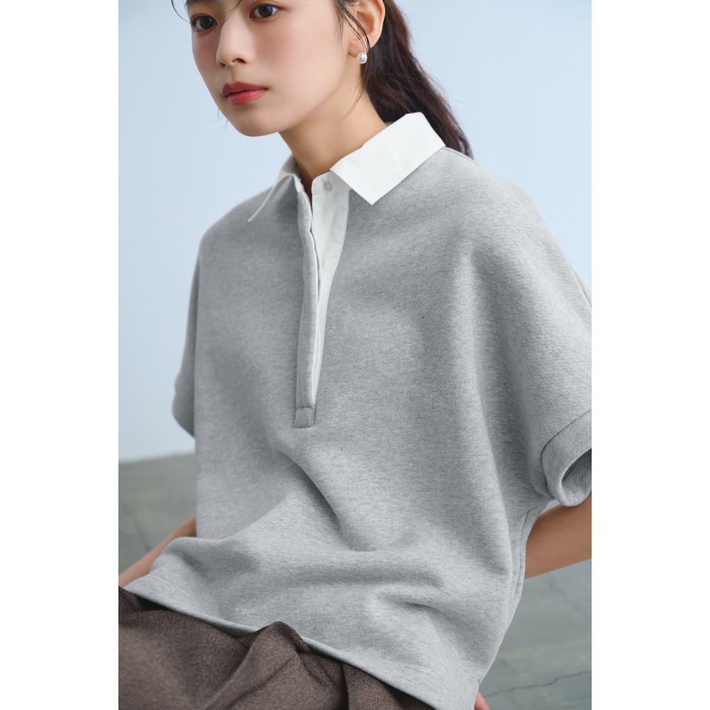 MONO TONE夏の装いが少し気恥ずかしくなってくる晩夏に、シックなモノトーンはうってつけ。フェミニンモードなイメージづくりもお手のもの。取り入れるだけで、魅力的な秋が始まります。綿100%の裏毛カットソーのボディに対し、襟と比翼仕立ての前立ては布帛生地で切り替えてきちんと感を演出。淡いグレーと白のカラーリングもクリーンな印象をかもします。ドルマンスリーブや両脇スリット、前後差のある着丈など、リラックスして着られる一枚。