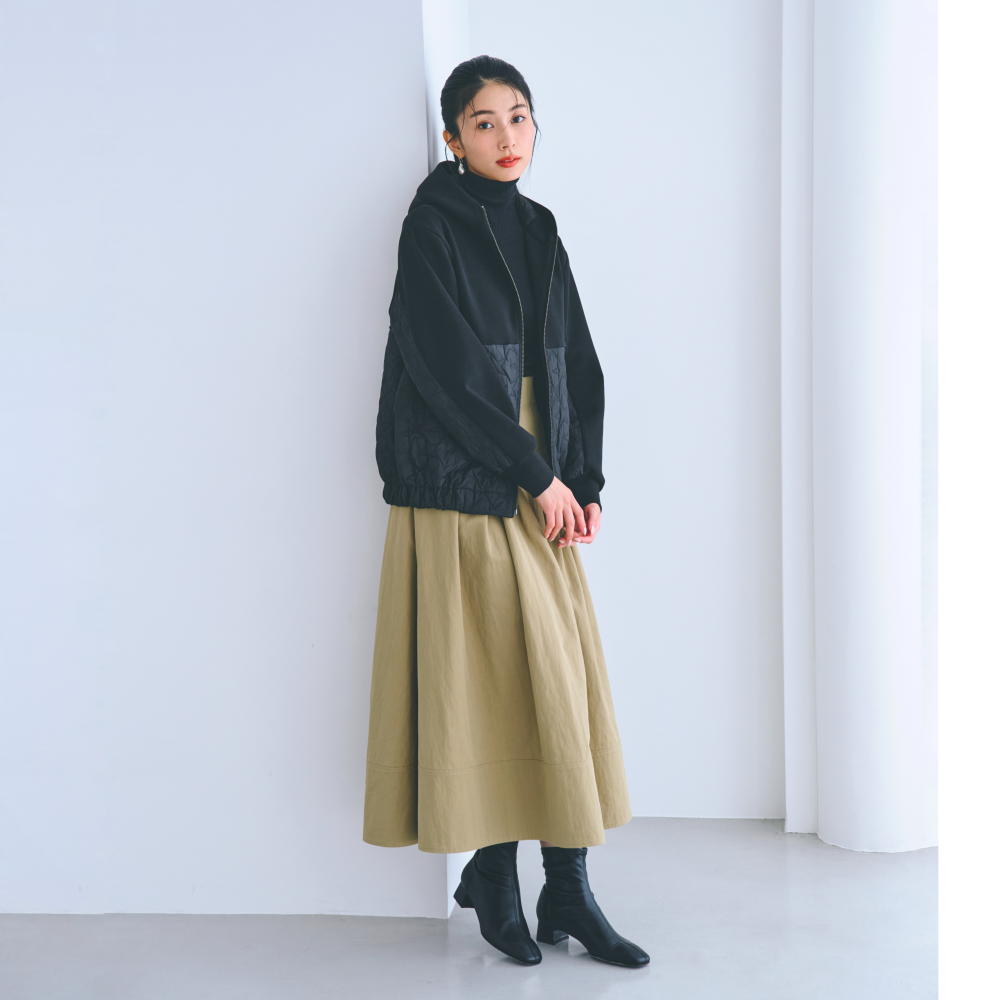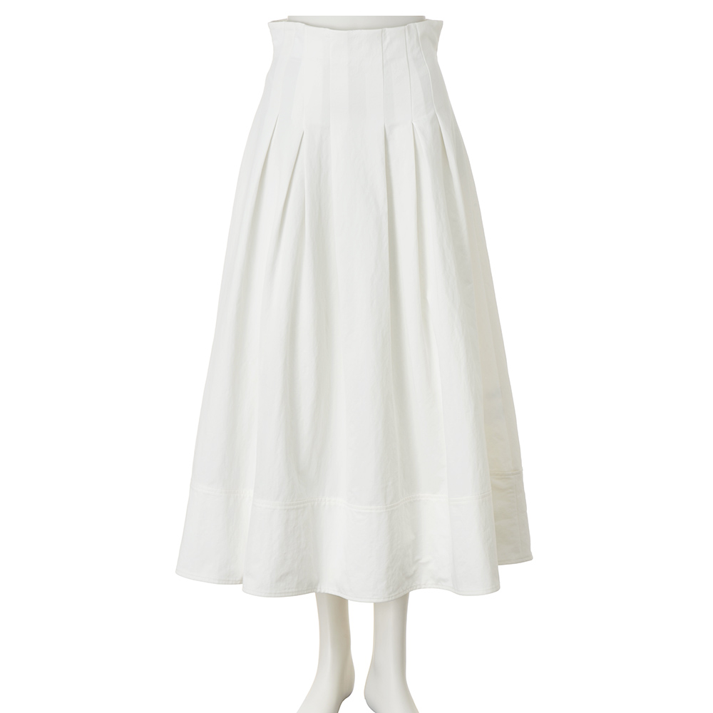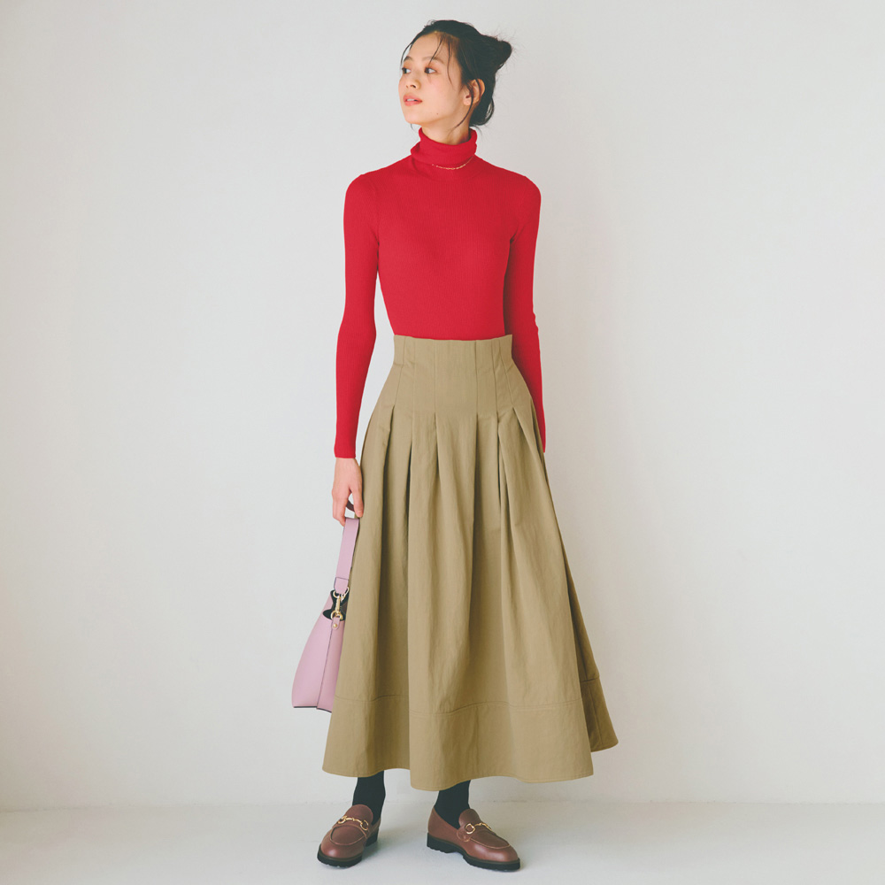 My FAVORITE ITEMS人気の名品にトレンドの要素を加えて、“この冬”仕様にアップデート。ベーシックだけど盛れるアイテムが、いつもの日常をクラスアップしてくれます。レディな気分を高める構築的フォルムのスカートナチュラルなシボ感が魅力的なスカートは、適度にハリのある素材が立体感のある美フォルムをアシスト。ぐるりとタックを入れたハイウエストで、気になるお腹まわりをカモフラージュ。後ろ中心のファスナー開きも、すっきり見せに貢献します。幅広な裾の切り替え部分は、贅沢に生地を二重使いすることで重さを出して、広がりすぎないよう落ち着かせつつ、華やかな仕上がりに。2パターンの丈とウエスト6サイズ展開からしっくりくるシルエットを選べます。