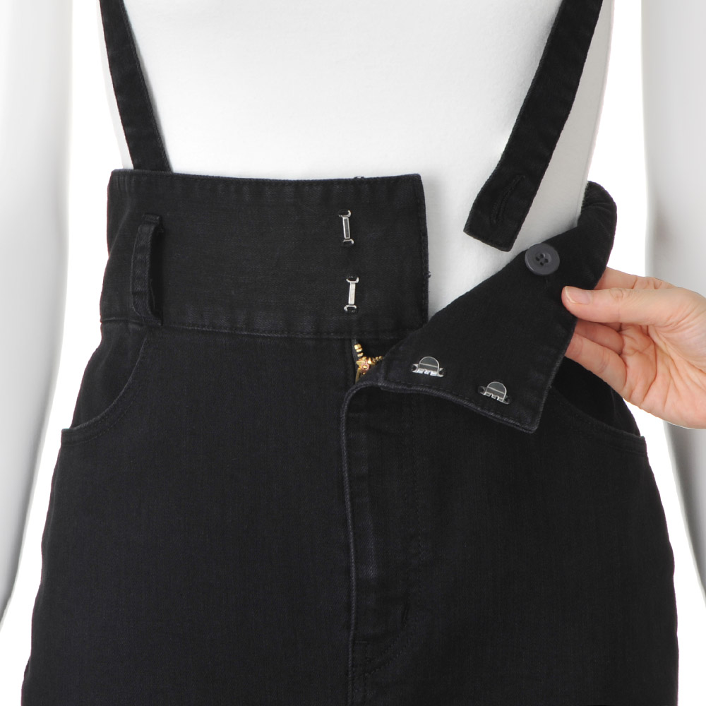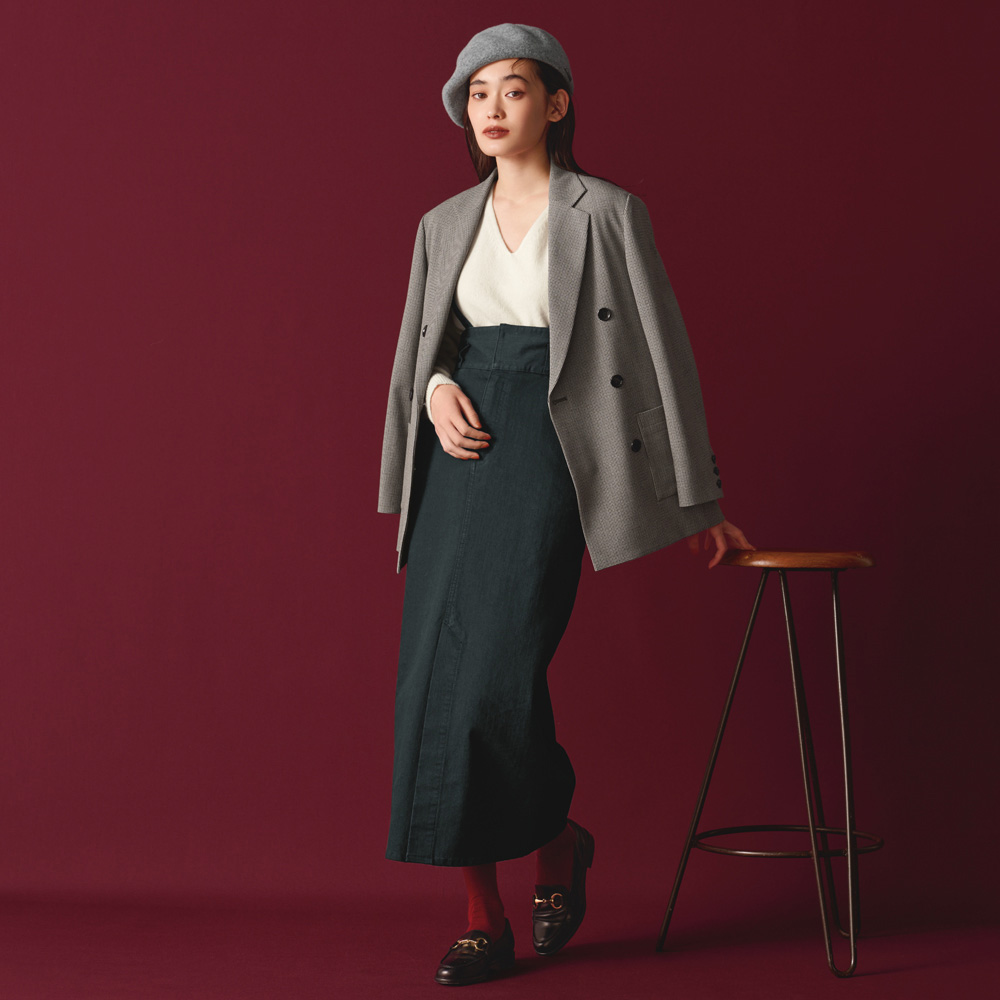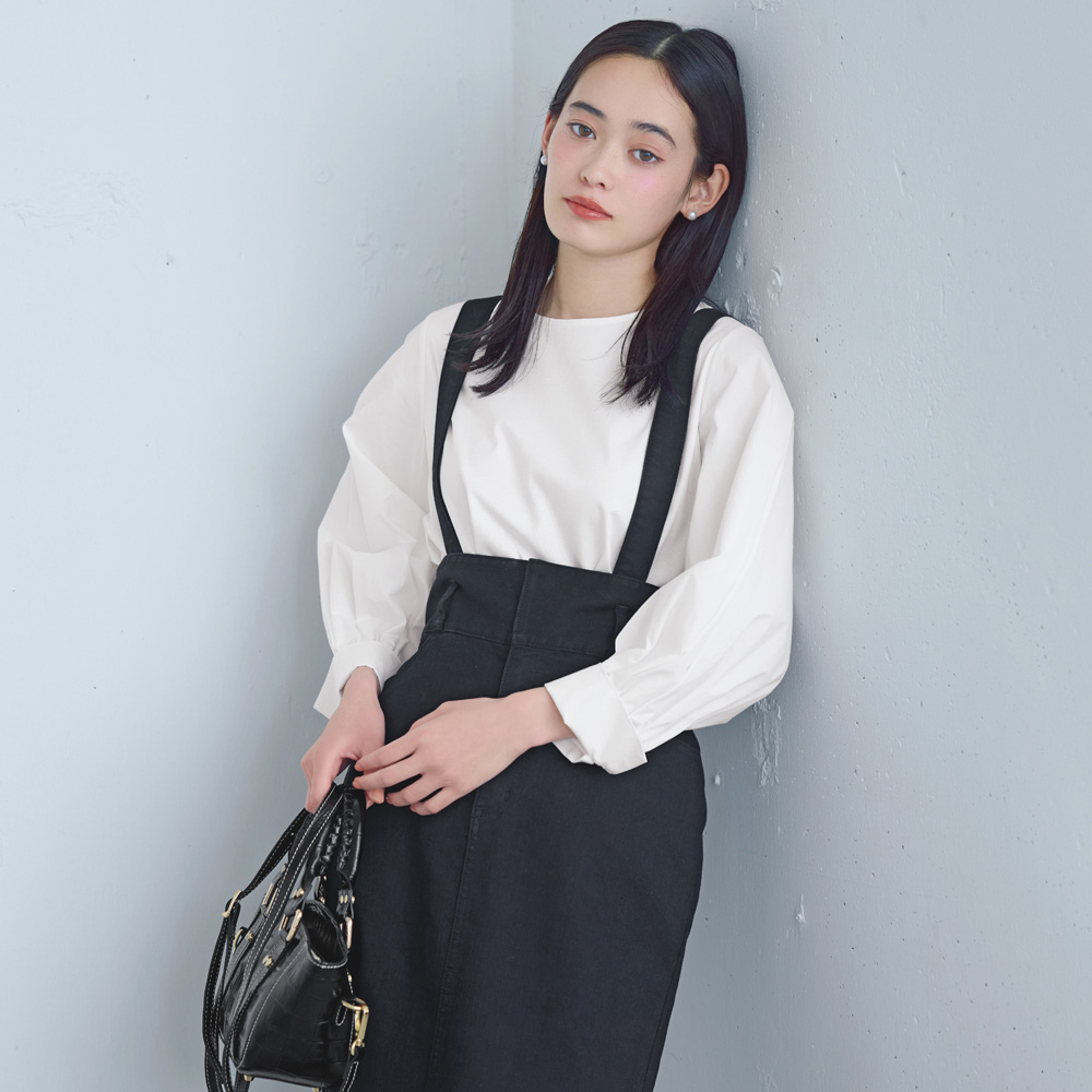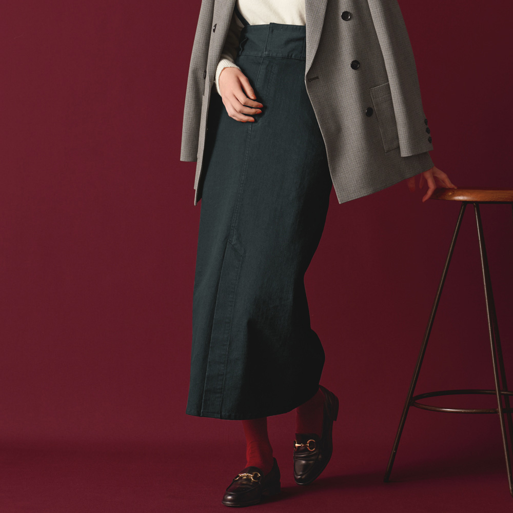 冬のカジュアルスタイル毎日を支える着こなしは、「がんばりすぎずに女性らしくきまる」そんなカジュアルが理想。旬のエッセンスを効かせた扱いやすいアイテムで、冬の装いの洗練度を高めて。 シーズンレスで着用できるIラインシルエットのデニムスカート。ハイウエストで引き締めつつ、ストレートシルエットでスタイルアップをねらえます。横ストレッチが効いていて、フロントのベントスリットが足さばきをフォロー。長さ調節が可能なサスペンダーは取り外しが出来、着回しの幅が広がる一着です。