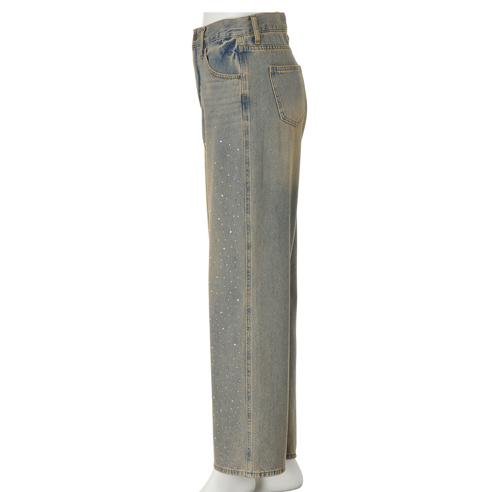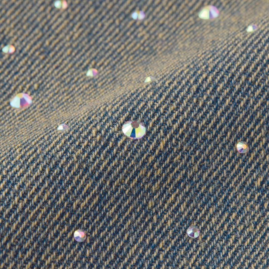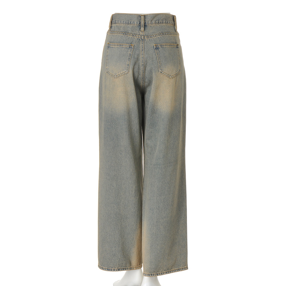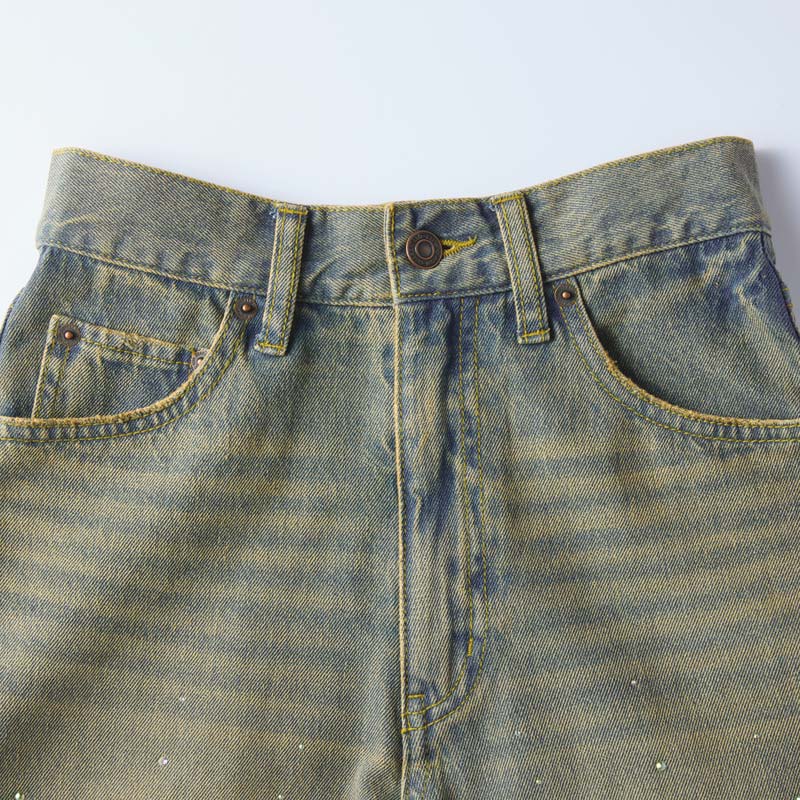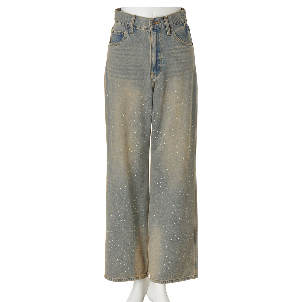 ベージュがかったオーバーダイのインディゴカラーは、ヴィンテージな雰囲気たっぷり。フロントのみにバランスよく配された大小のラインストーンは、光があたるとキラキラと輝きます。適度にゆるさのあるストレートシルエットは、きれいめからカジュアルまで幅広く使えます。