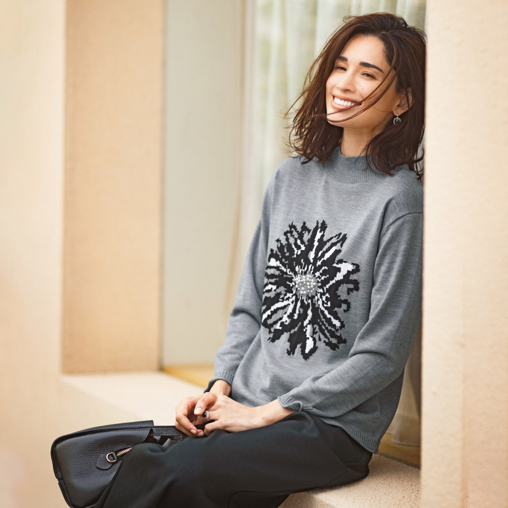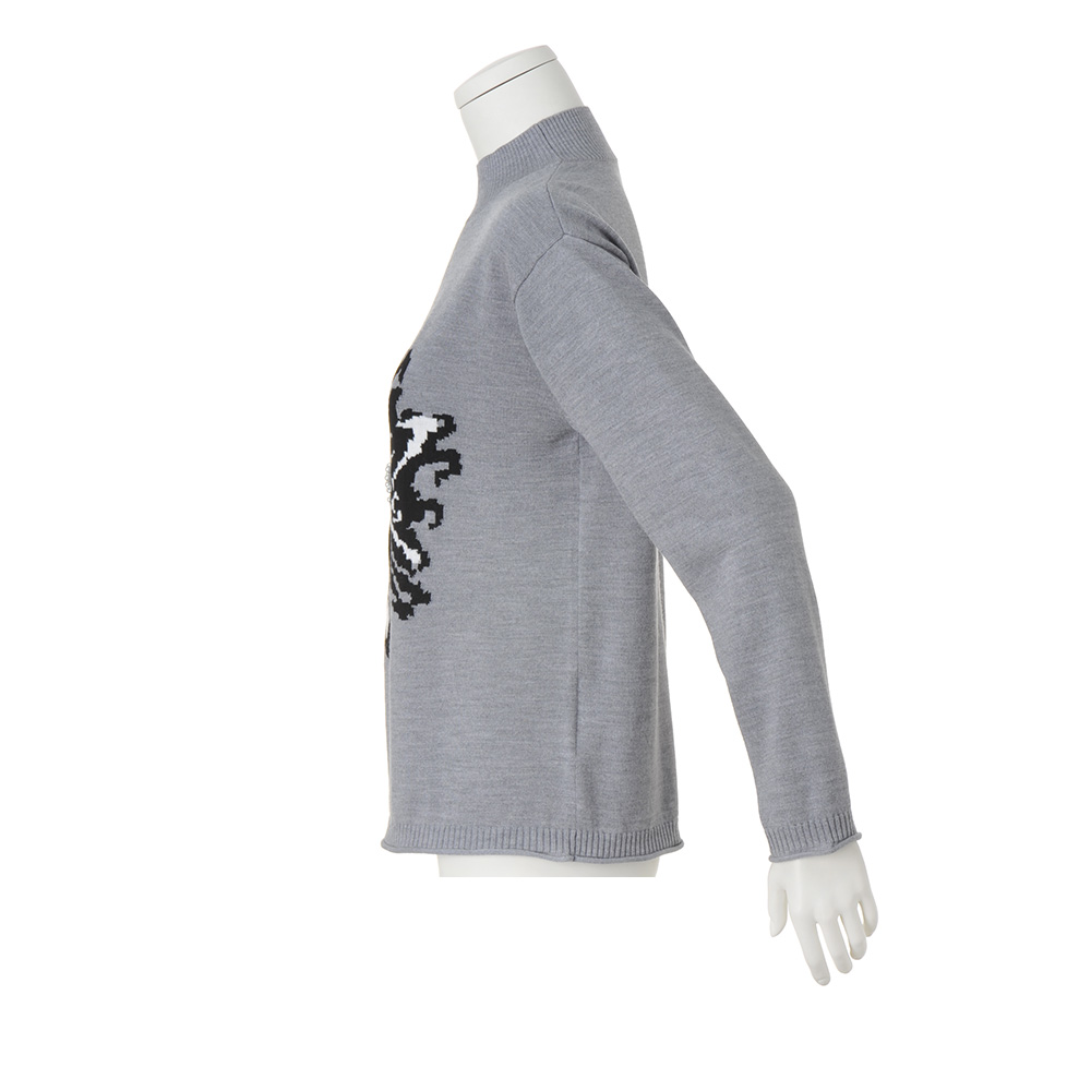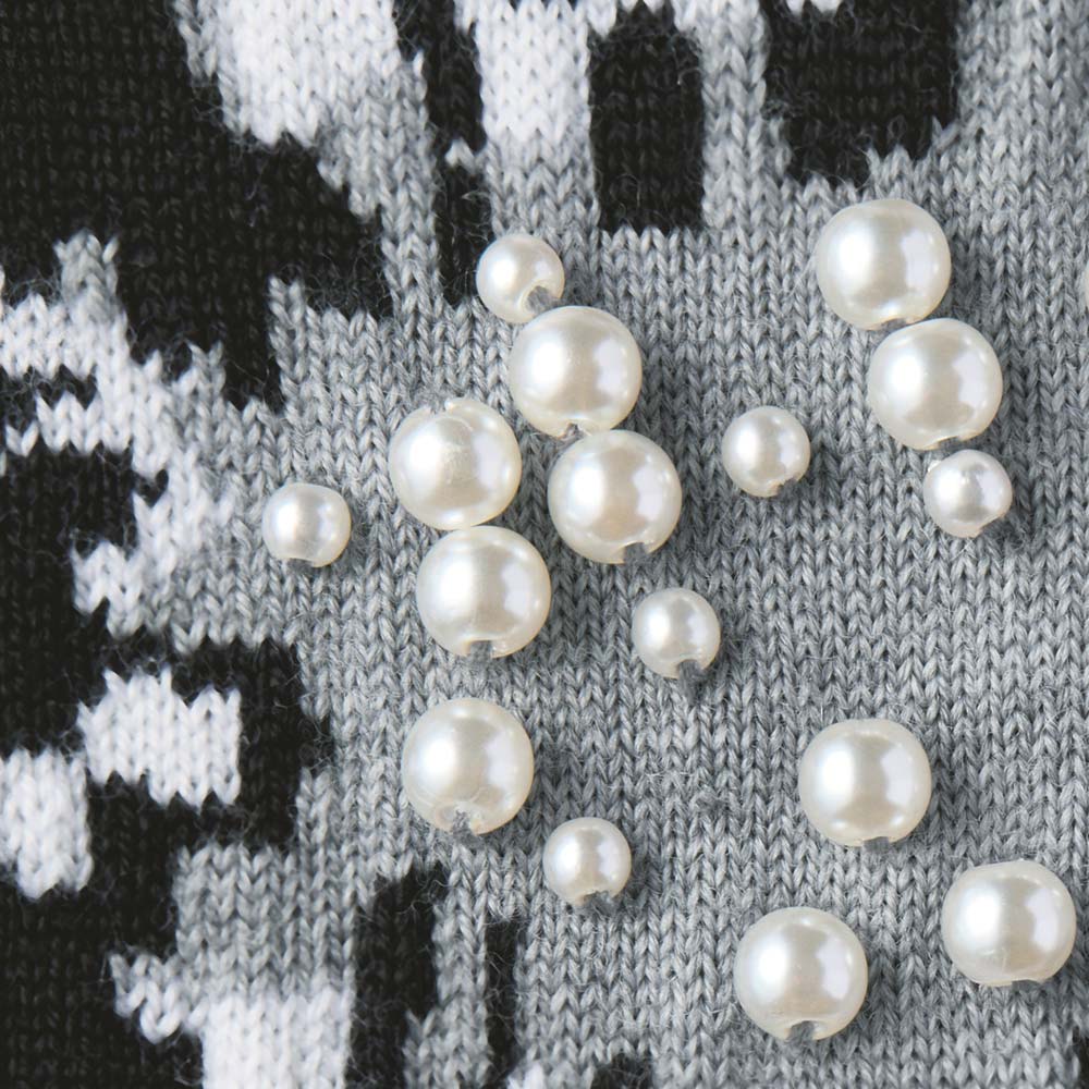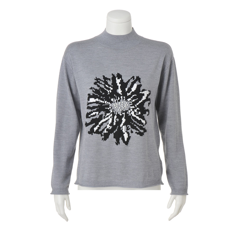 DAILY WARDROBE暮らしに寄り添うデイリークロースをご提案。カジュアルすぎない上品さで、オンオフ着回せるワードローブに。程よいきちんと感で、デイリーコーデを格上げします。モノトーンのモードカジュアルで大人の余裕を感じさせる雰囲気にジャカードの柄が繊細に映えるハイゲージのウール100%糸を使用。インパクトのあるフロントの花柄は、黒とオフホワイトの2配色で柄を表現し、奥行きのある仕上がりに。花の中心部には大小のパールビーズを装飾しました。裾と袖にはナチュラルな天竺カールでニットの柔らかさを表現。一着で主役級の存在感を放ちます。