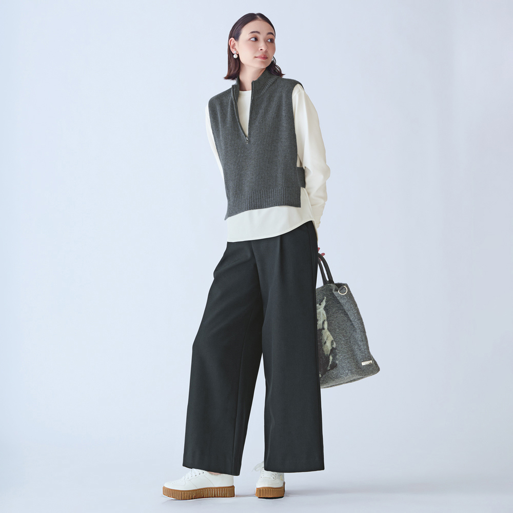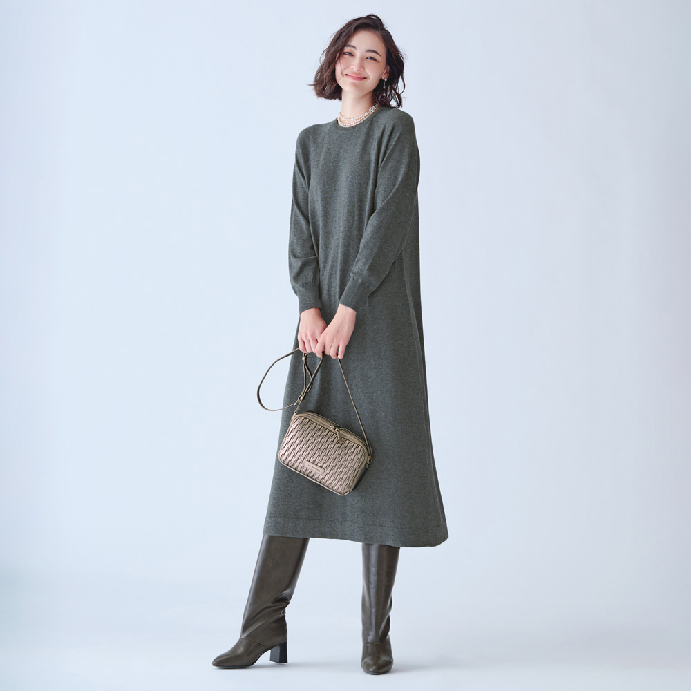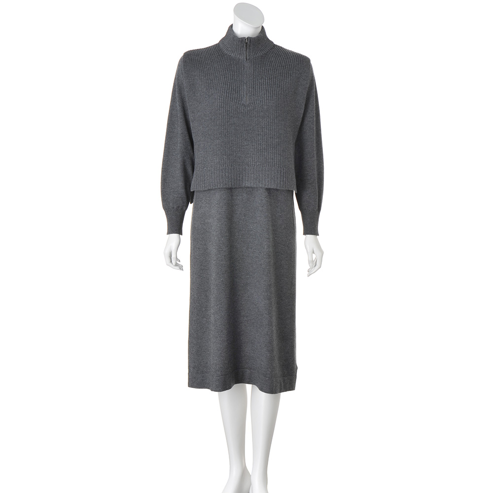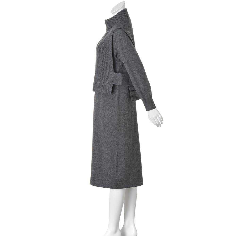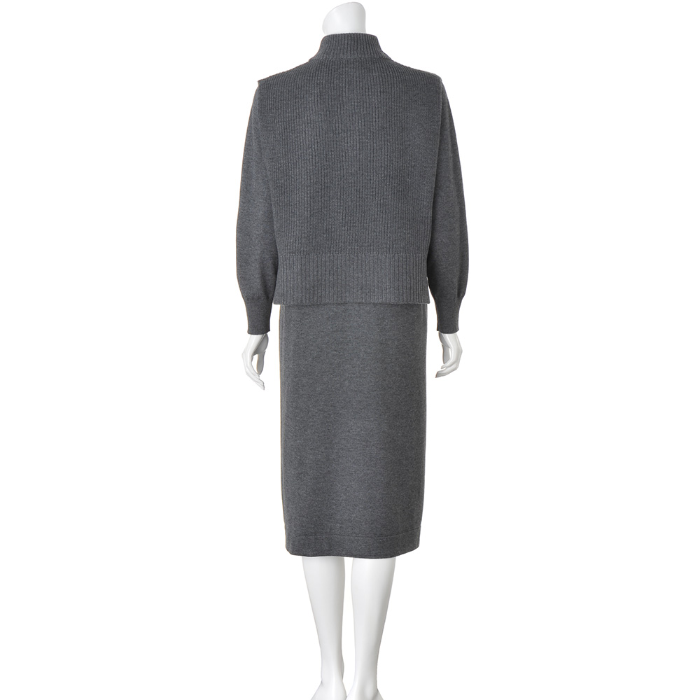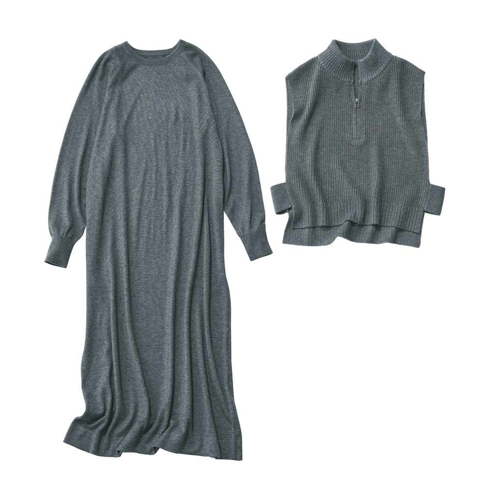 “私の定番”を、今年らしくアップデート。異なる編み地が表情を与えるしゃれ見えセットアップウール混の糸で仕立てたワンピースとベストのニットセットアップ。異なる編み地を取り入れることで、レイヤードしても奥行きのある表情に。ワンピースは、からだのラインを拾いにくいゆとりのあるややAラインのシルエット。ベストは、トレンド感のあるハーフジップ。ワンピースと重ねてもバランスよく決まる短め丈に。