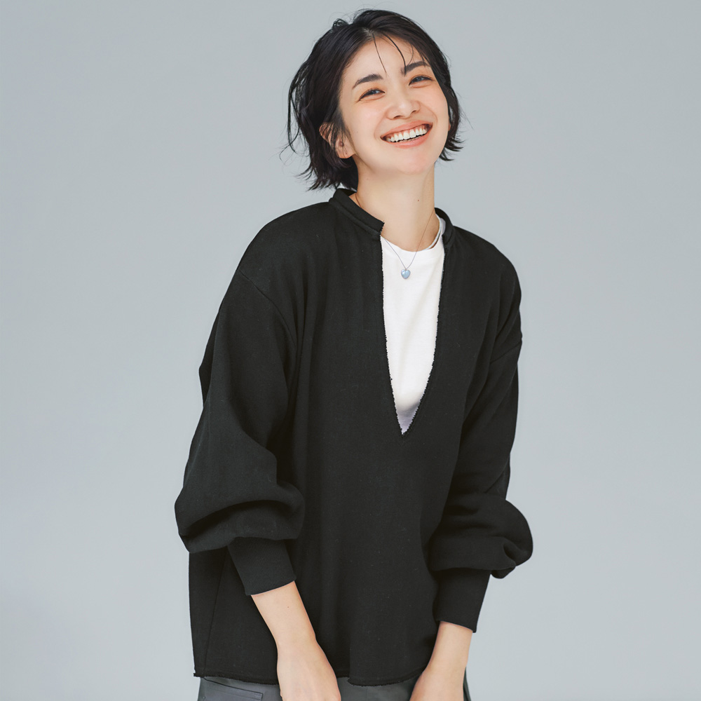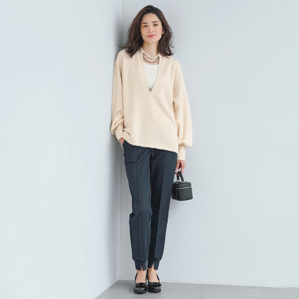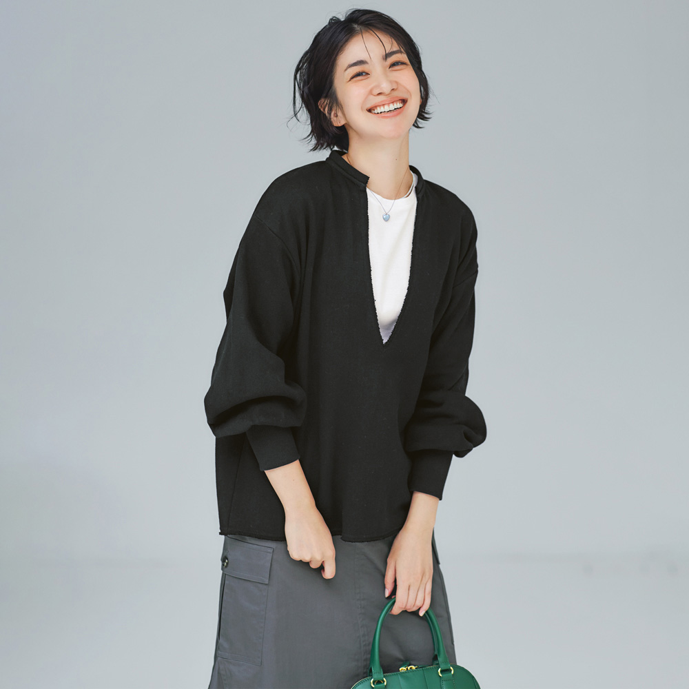 (ア)ブラック コーディネート例 /抜け感のある深Vネックはインナー次第で着こなし印象自在