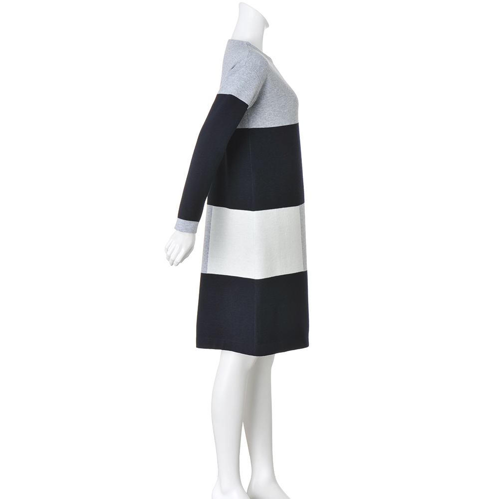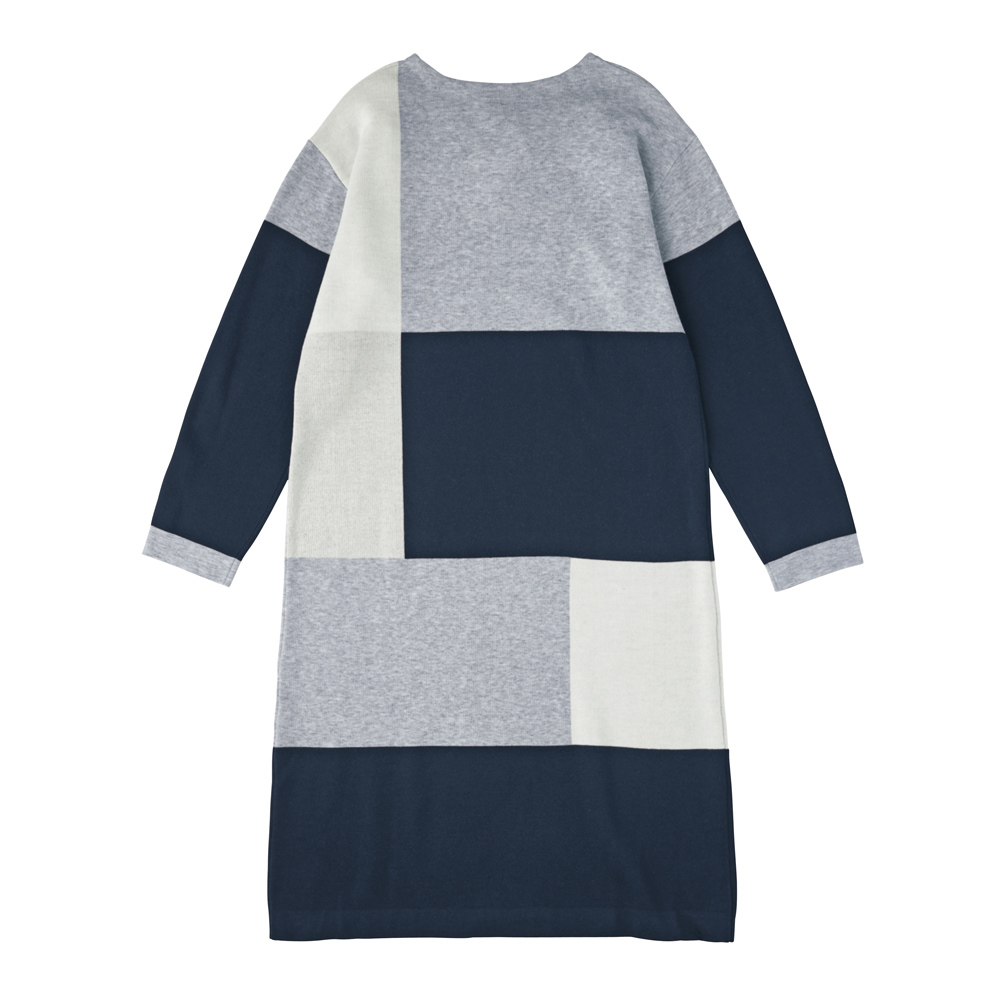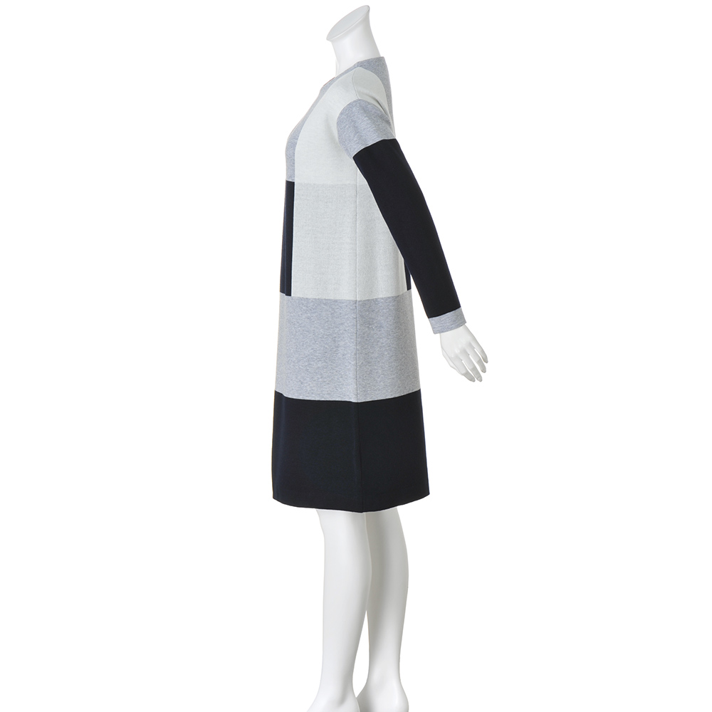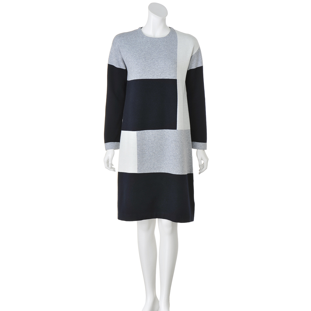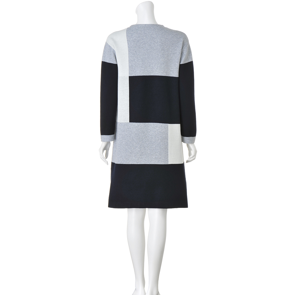 計算し尽くされたカラーブロックでスタイリッシュな印象を授けて冬の装いにちょっと飽きてきた今こそ、気分の上がる色柄で心を弾ませて。一枚で着映えし、主役になれる存在感のあるワンピースが、春へのスイッチをさりげなく後押ししてくれます。大胆な配色デザインが目を引くニットワンピース。ストンとしたストレートシルエットと、ダブルジャカード編みによる程よい肉厚感でからだのラインを拾いにくく、スタイルを立体的に見せてくれます。一枚ではもちろん、パンツなどのボトム合わせもスマート。自宅で洗えるのも嬉しいポイント。