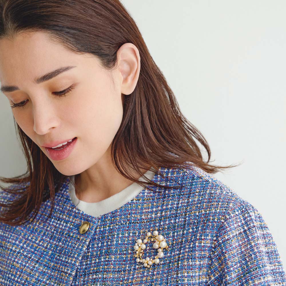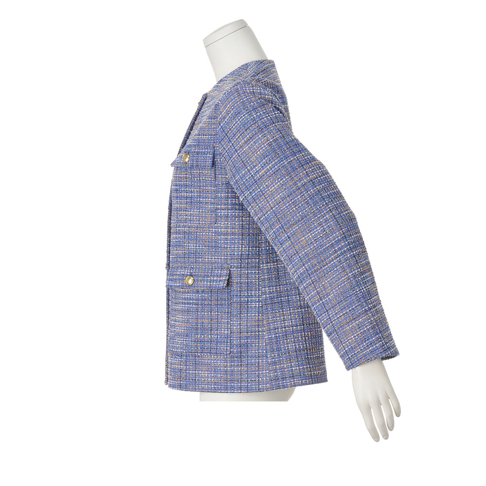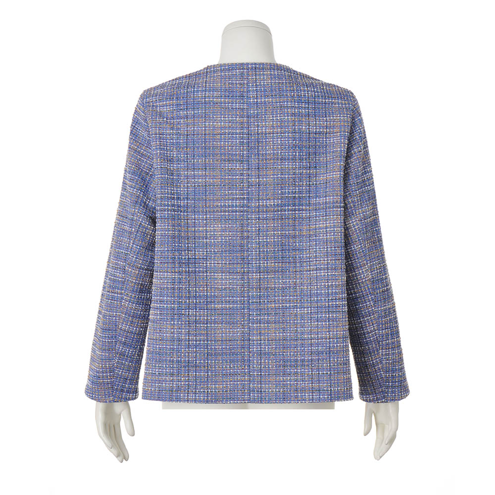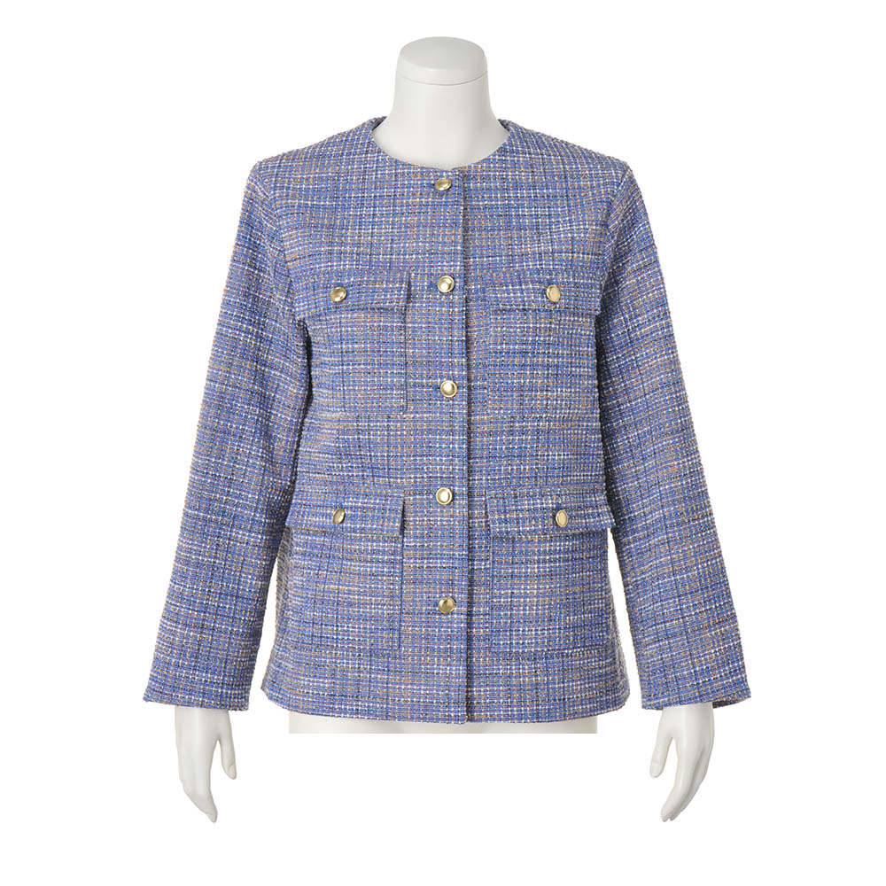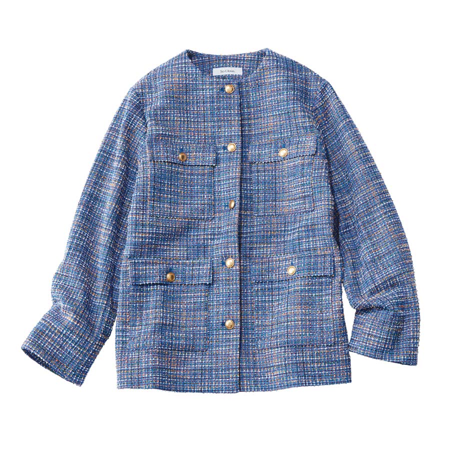 「上品ツイード」を、ラフに楽しむクラシカルなツイードジャケットは、あえて力を抜いた着こなしで鮮度を高めて。きちんと感と抜け感の絶妙なバランスが、今のムードに映える大人の洗練カジュアルをつくります。定番ツイードジャケットを、大人のしゃれ感漂うブルートーンで仕上げました。ボックスシルエット×長め丈が体型を自然にカバー、軽やかな伸縮ジャージー素材が程よい抜け感をプラス。多色使いだから合わせる色を選ばず、着回しやすいのも魅力です。