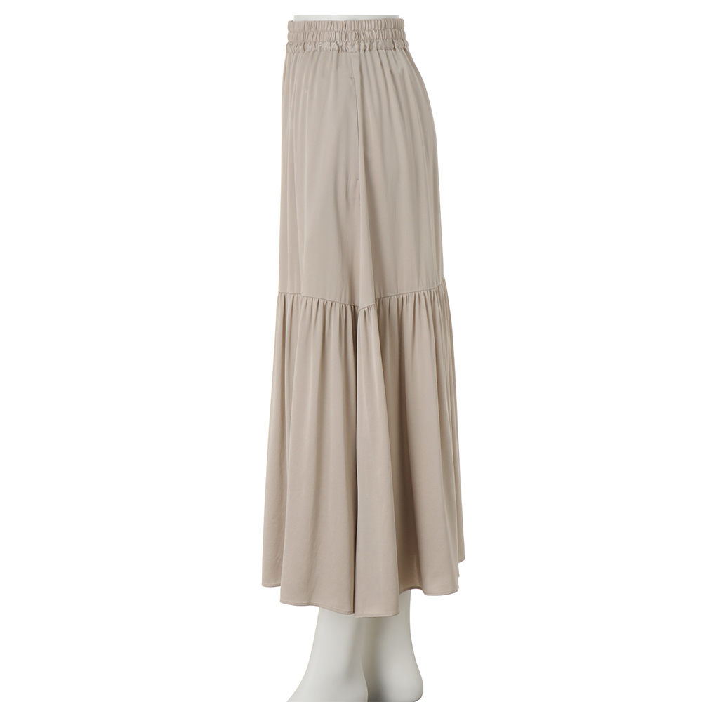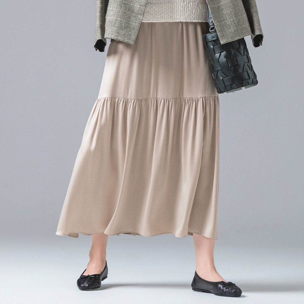 返品送料無料キャンペーン実施中!3/31(火)まで 対象商品ただのシルクとは一線を画すリュクスとコンフォートの理想形シルクの上品な光沢を落ち着いた艶へと整えたサンドウォッシュシルク。さらに、コンフォートな機能性も両立し、上質素材を特別な日だけで終わらせない“日常のワードローブ”へ昇華させました。シルク生地を砂でやさしく洗う独自加工から生まれた「サンドウォッシュシルク」。本来の気品ある光沢を残しながら、ぎらつきを抑えた上品な艶へと仕上げ、光と影の両方に美しさが宿る奥行きのある陰影を描きます。シルクは「扱いが難しそう」「特別な日の素材」という印象を覆し、気負わず長く楽しめるのも魅力。UVカットと横ストレッチを兼ね備え、手洗いで自宅ケアができ、乾きやすく扱いやすい点も嬉しいポイントです。ストレッチ性を備え、見た目は端正なのに袖を通すと軽やかで快適。しなやかで肌離れがよく素肌に心地よい質感は、暑い季節にもおすすめです。希少な天然シルクを高度な技術で仕上げ、強すぎず弱すぎない絶妙な艶を実現。洗練、心地よさ、長く愛せる価値を備えた一着です。肌に張りつきにくい特殊加工と、程よいストレッチ性が叶えるのは、裏地をあえてなくしたからこそ宿る軽やかな落ち感。裾にはティアードのニュアンスを沿わせつつ、腰まわりは広がりを抑えてすっきり見えるよう緻密に計算しました。[UVカット|ウォッシャブル|横ストレッチ]