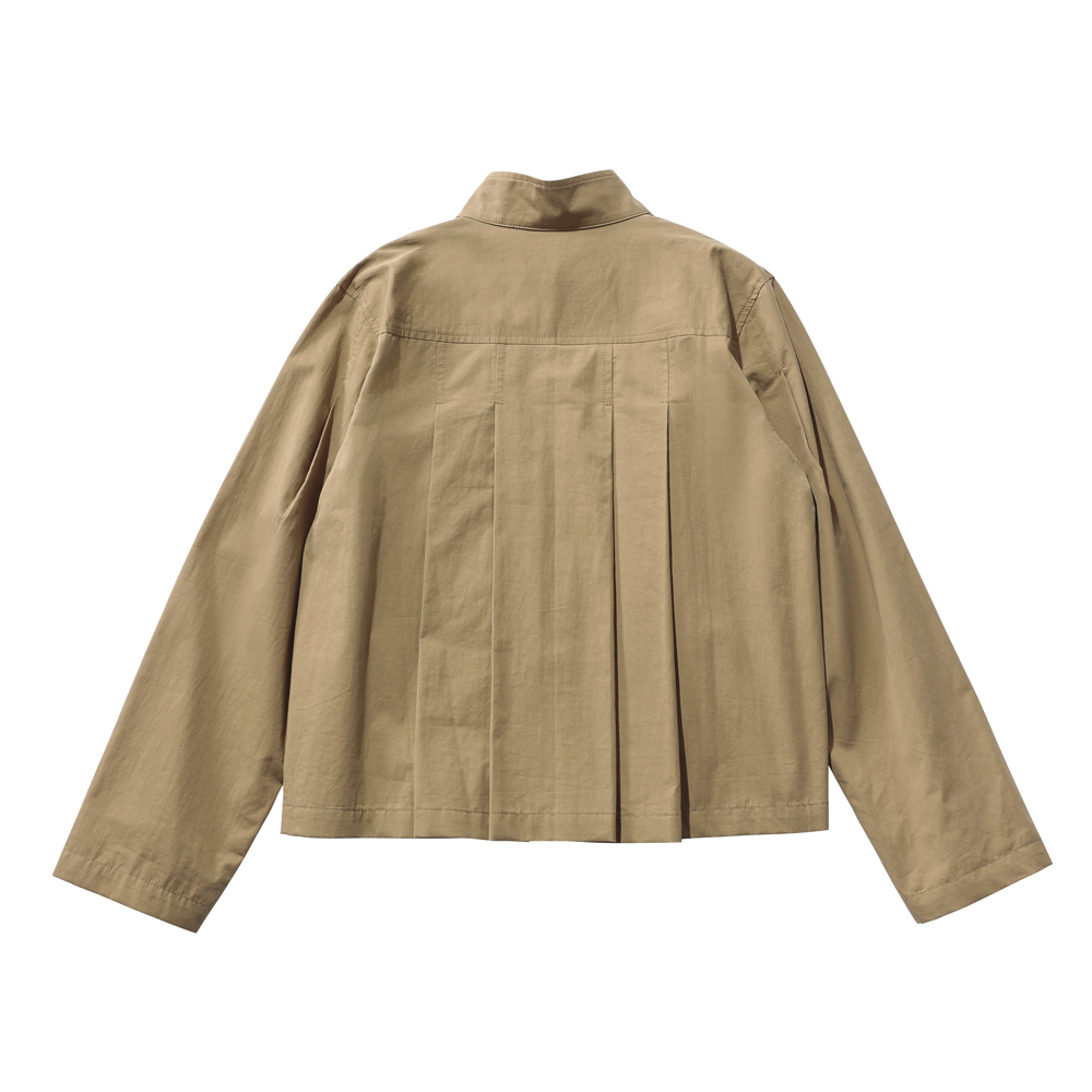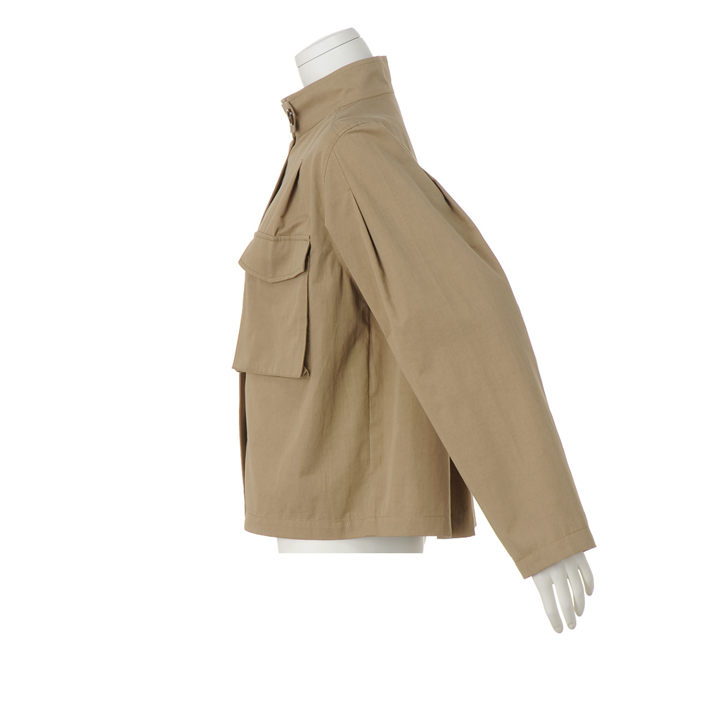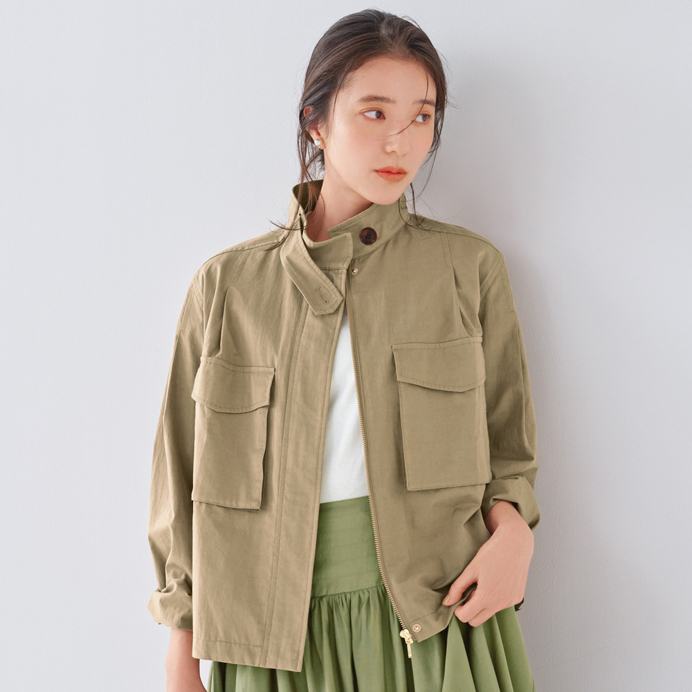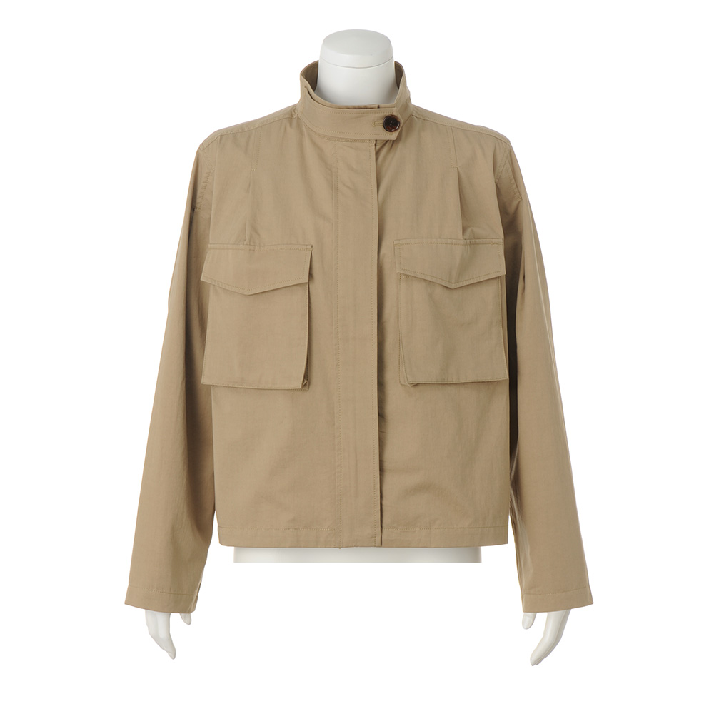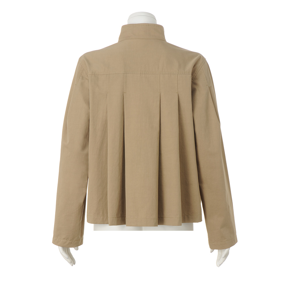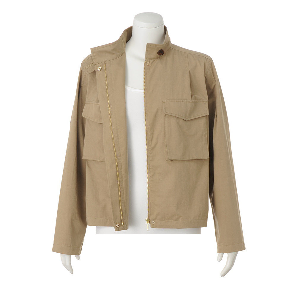 オーガニックコットンの確かなトレーサビリティを持つ生地に、特殊加工でヴィンテージの風合いを纏わせたスタンドカラーブルゾン。マニッシュになりすぎないよう、背中にタックを入れ、ほんのりプリーツのように立体的なフォルムへ。ジップには女性らしさを添えるゴールドを選び、開けて羽織った瞬間も品よく輝きます。フロントには立体的なボックスポケットを配し、実用性とデザイン性を両立。