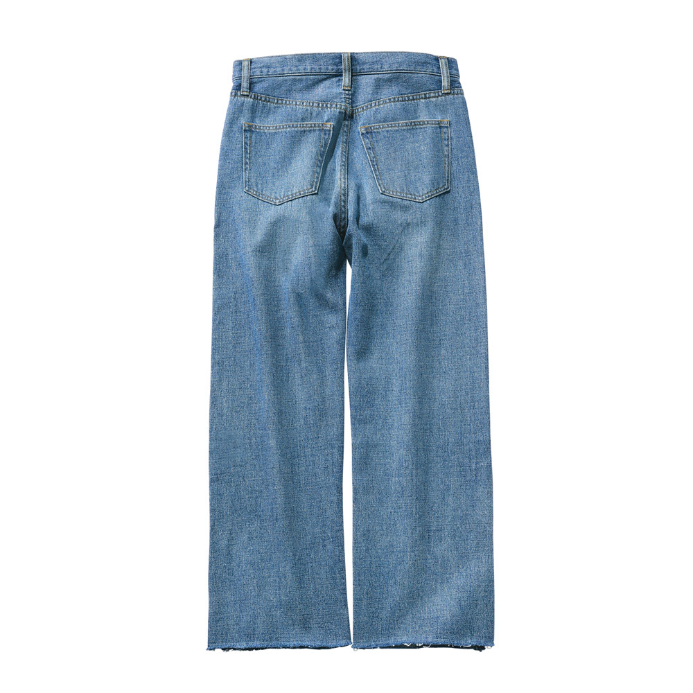 デニムづくりで問題視される染色工程にも配慮したエコテックス認証の綿100%デニム。はいた瞬間から「これ、本当にデニム?」と思うほど柔らかく、軽いのが魅力です。通常より甘く織ることで生まれるふんわりとした軽さが夏の肌にも心地よく、裾のスリットが足首の細さを際立たせ、シューズ合わせの幅も広がります。デニムは重い・暑いという常識を軽やかに裏切る夏の相棒です。