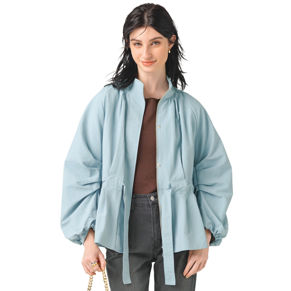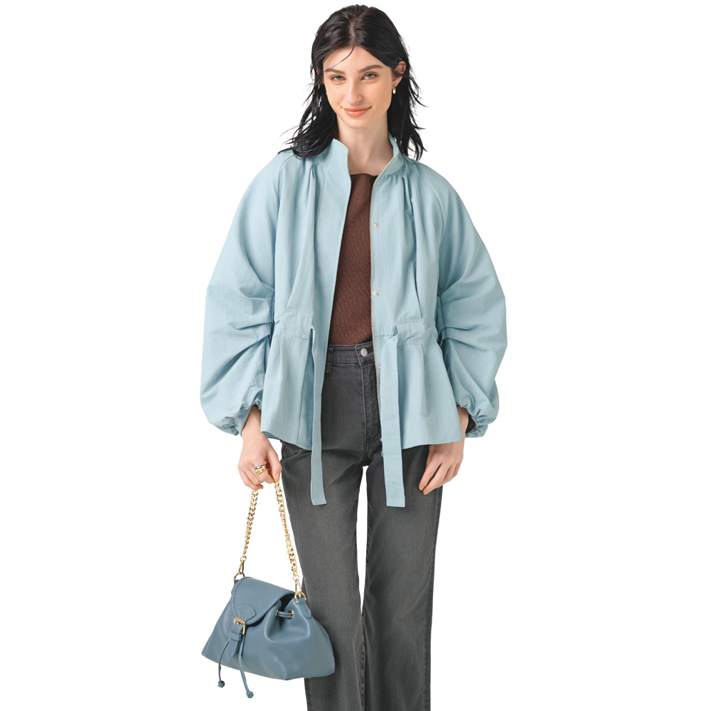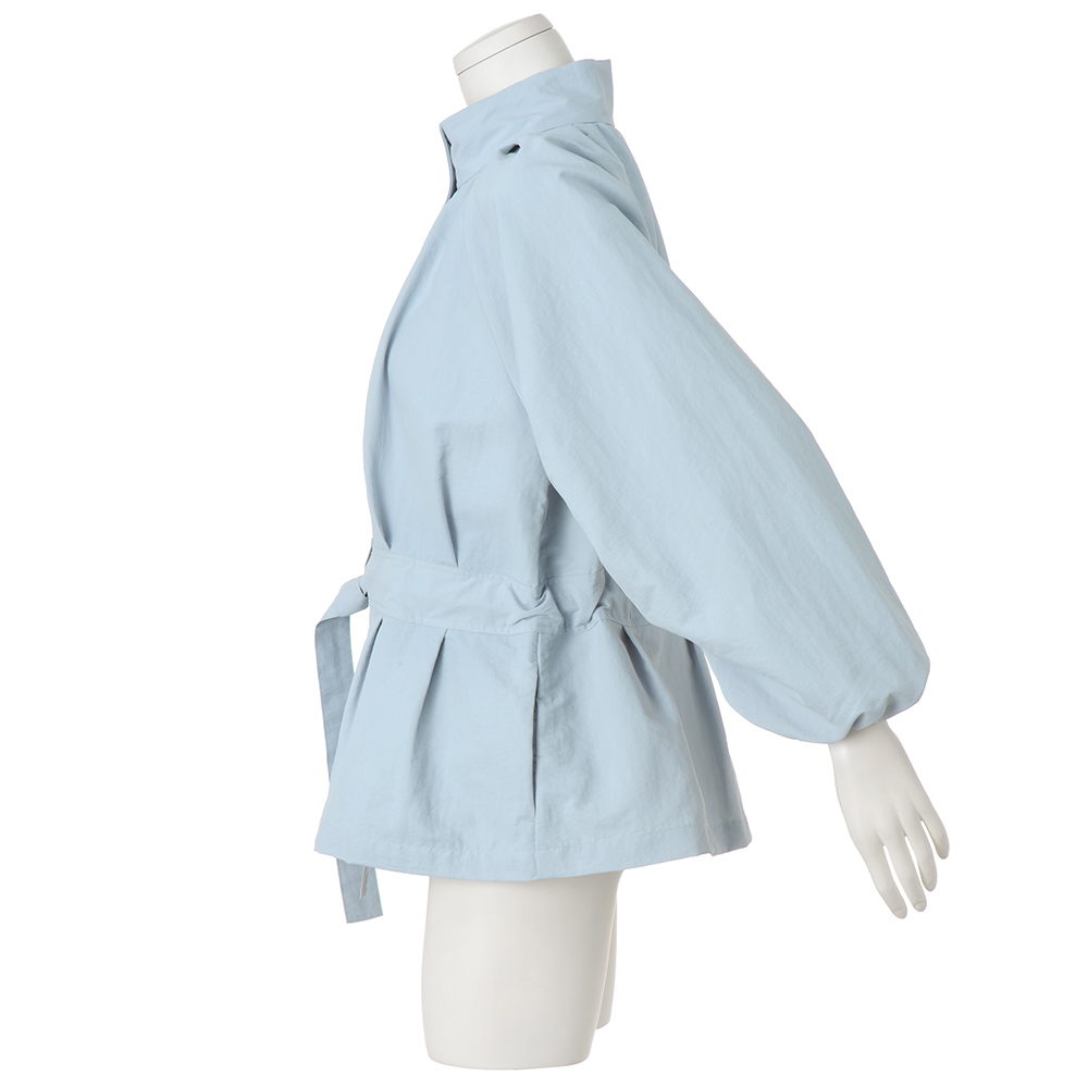 春夏に嬉しい機能服防花粉とはっ水加工をほどこした、ナイロン100%のグログラン生地を使用。ボリュームのあるシルエットながら、軽やかな着心地が魅力で、春夏の羽織りにぴったり。心が浮き立つきれい色が、シーズンムードを高めてくれます。ボディや袖にギャザーを入れた、ぽわんとしたシルエットのショートコート。高めのウエスト位置に配した共布リボンが、さりげなく脚長見せをアシストし、絞っても垂らしてもサマになるデザインです。フロントをボタン&ファスナーの両使いで閉められるため、防寒もばっちり。両脇にスラッシュポケットつき。[防花粉|はっ水]