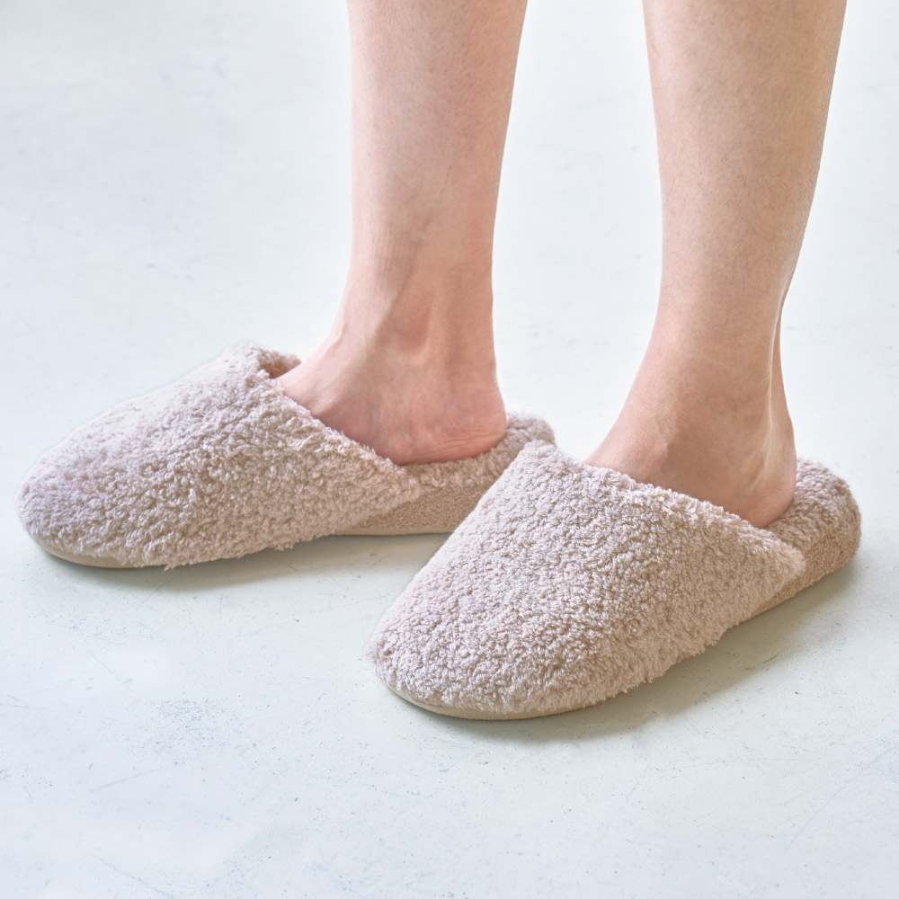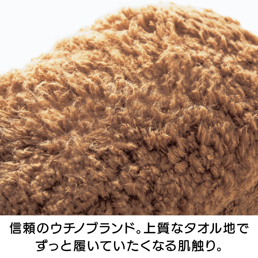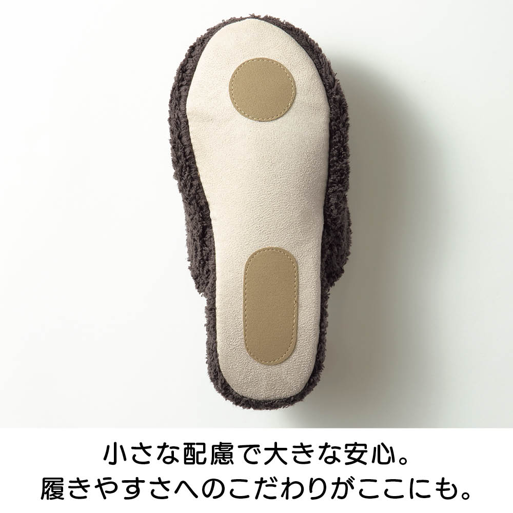 老舗タオルメーカー「ウチノ」のスリッパは、冬でも素足で履きたいごくふわのタオル素材でできています。甲の内側までまるごとタオル素材なので、お風呂上がりに履いてもさらっとした履き心地で足裏はいつも快適。インソールは足にしっかりフィットする立体形状で、つま先と足裏の内側を低くすることで着用時の足圧バランスが整い、歩きやすいのが特長。抗菌・防臭加工が施され、おうちで洗える清潔仕様です。UCHINO(ウチノ)ごくふわスリッパ「ユニティ」は、素足で履くことを前提に開発されたタオルスリッパです。まるで大きなマシュマロに足を包み込まれるような、ふんわりとした極上の履き心地を実現。足の専門家と共同で足圧分布や重心バランスを徹底検証し、疲れにくく歩きやすい設計に仕上げました。寒い季節でも素足でさらっと快適に過ごせる、ウチノならではの高品質な綿100%タオル地をぜひ体感してください。足の専門家と共同開発した独自インソール設計つま先から足裏の内側が凹んだように低くデザインされているので、履いた時に足指と足底部でぐっとつかむような感触があります。足にぴったりとフィットする形状で、適度なボリュームのあるインソールは、まるでマシュマロに包まれているような履き心地。ウチノのベストセラー「ごくふわ」タオル素材を使用吸水性に優れ、さらっとした肌触りが続く綿100%のタオル地を全面に使用。甲の内側までタオル素材で包み込むため、お風呂上がりにも快適です。ふんわりマシュマロのようなインソールのボリューム感適度な厚みの低反発ウレタンをインソールに採用し、足をやさしく包み込む感触。まるでマシュマロに足を埋めているかのようなリラックス感が味わえます。抗菌・防臭加工でいつでも清潔に使える洗濯機で丸洗い可能なうえ、抗菌・防臭加工が施されているため、清潔さを保ちながら長く愛用いただけます。 底裏に滑り止め付きで安心の歩行サポート2か所に滑り止め加工を施し、室内での安全性を確保。安心して歩ける設計です。 UCHINOごくふわスリッパ「ユニティ」は、素足で過ごす心地よさを追求した一足。お風呂上がりやリラックスタイムに、足元からやさしく包み込む感触が日々の疲れを和らげてくれます。お風呂上りに素足で履いてもさらっと快適に過ごせるので、足元から豊かな暮らしの時間をお楽しみください。