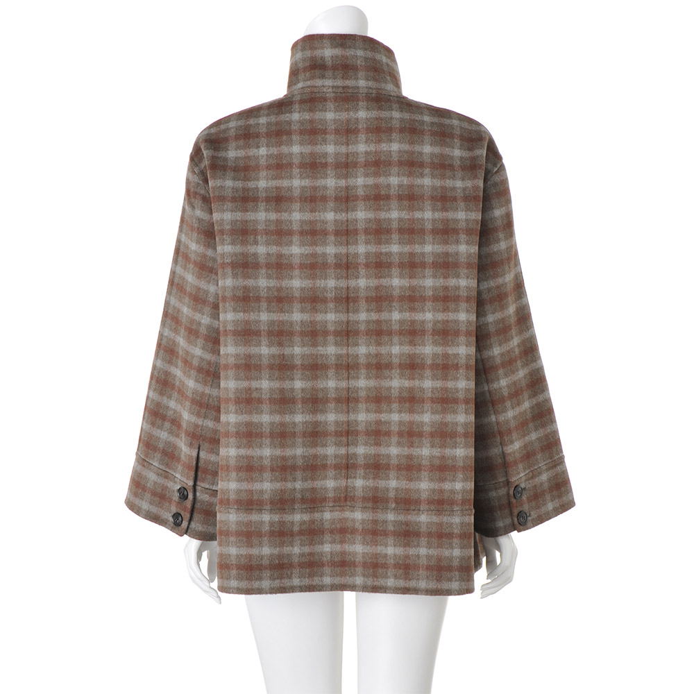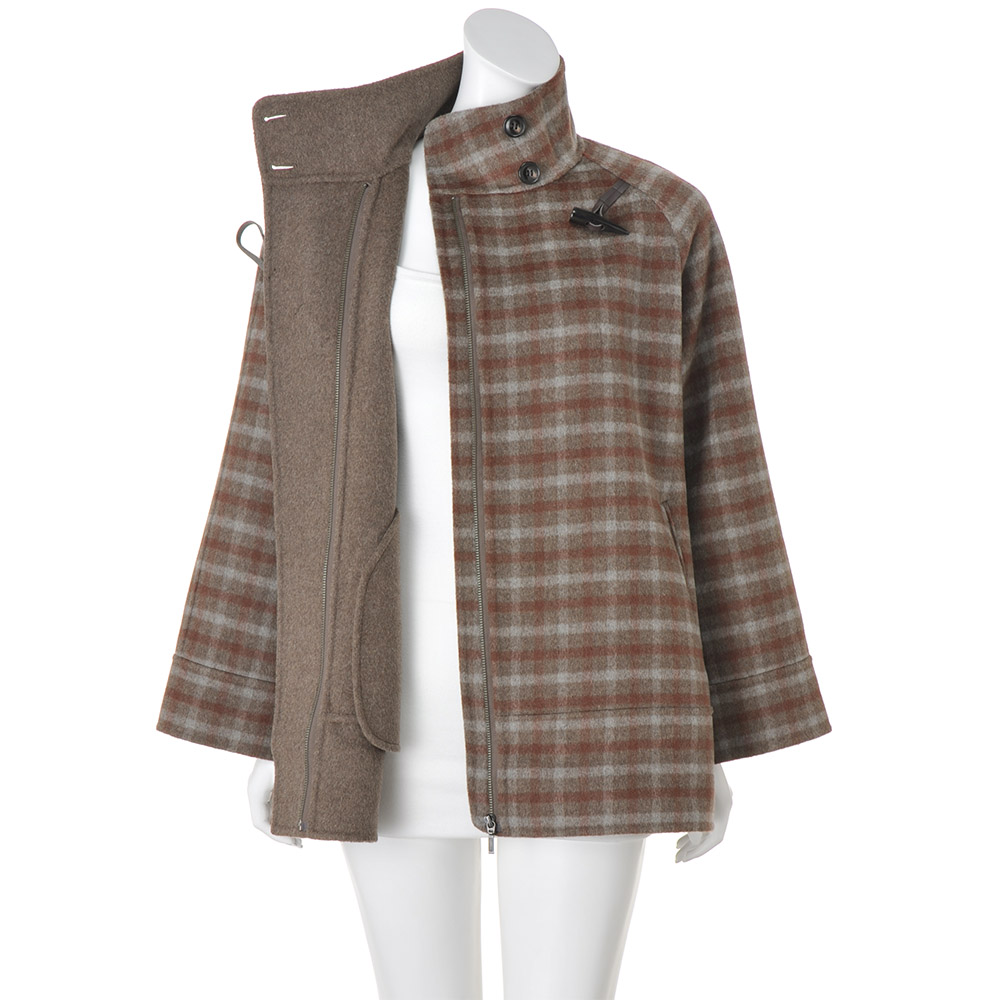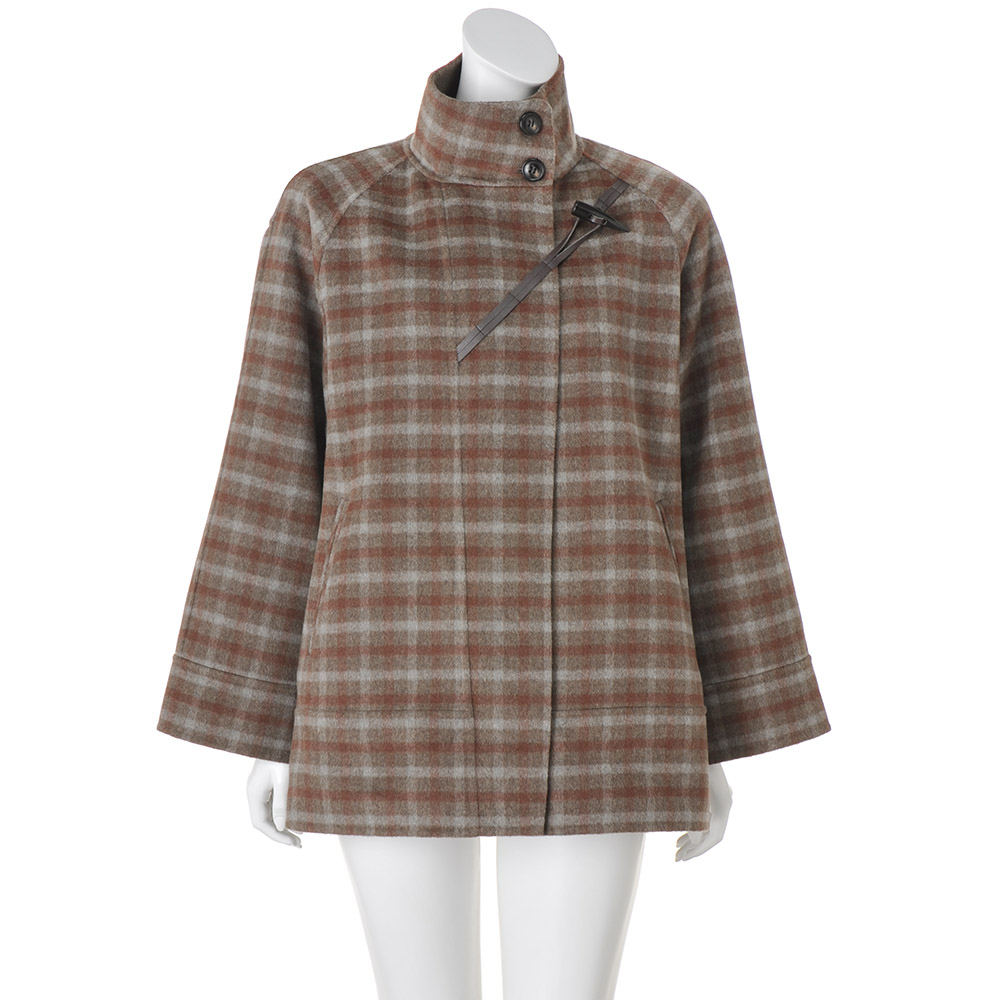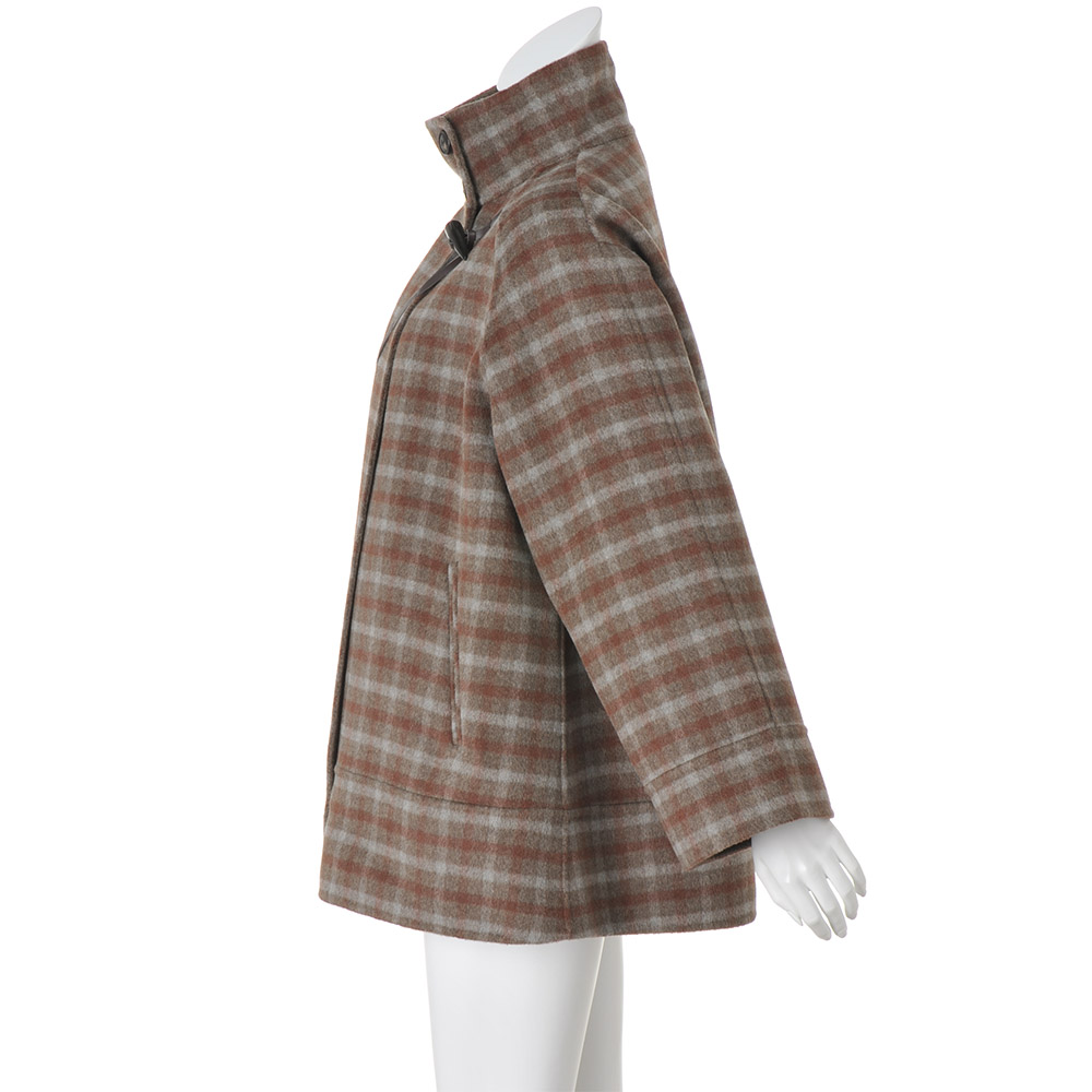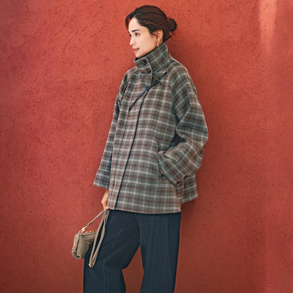 DAILY WARDROBE暮らしに寄り添うデイリークロースをご提案。カジュアルすぎない上品さで、オンオフ着回せるワードローブに。程よいきちんと感で、デイリーコーデを格上げします。一着でこなれる変形ダッフル。まわりと差がつくチェック柄表はトラッドなチェック、裏は落ち着きのあるブラウン。職人の手作業によるリバー縫製で仕立てたコートは、纏うだけで日常に特別感を添えてくれます。レザー調のトグルループを斜めに配置した変形デザインもポイントです。首元を覆う高めの襟で、冬のおしゃれをあたたかに。