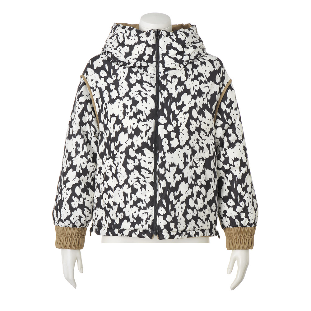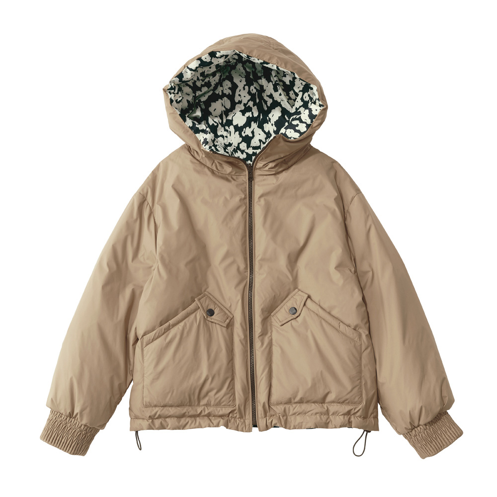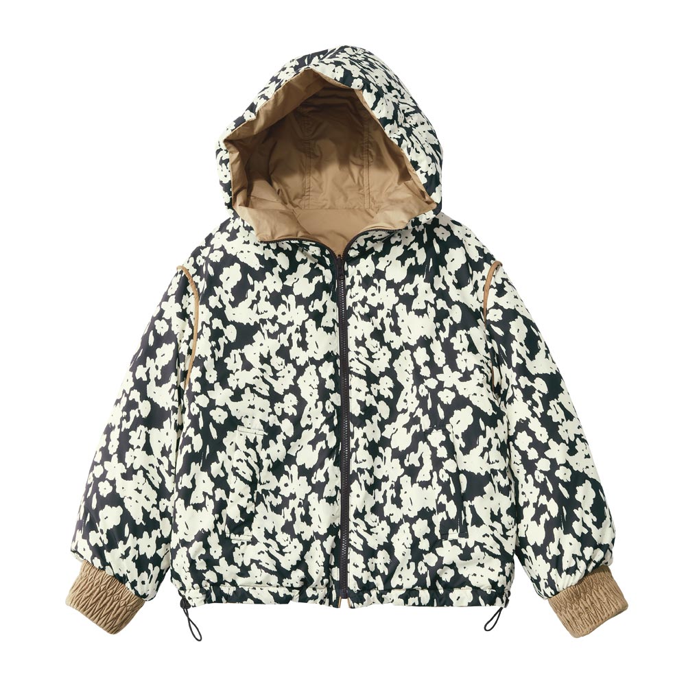 SPORTY MIX春の始まりにぴったり!カジュアルファッションに、アクティブなムードを添えた“スポーティミックス”を提案。軽快なおしゃれを楽しもう。気分やシーンに合わせてアレンジ着こなしの幅が広がる春アウター無地面はベージュ、柄面はモノトーンの花柄をプリントしたリバーシブルダウンジャケット。オーバーサイズでフードつき、裾はドローストリング仕様で絞ることもできます。無地面はデザイン性があるポケットがポイント。柄面はベージュを差し色にしたパイピング使いや袖口がアクセントとなり、遊び心満載です。