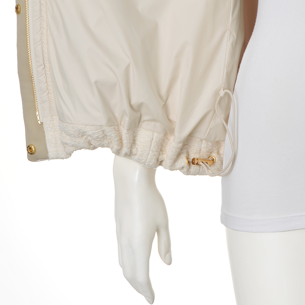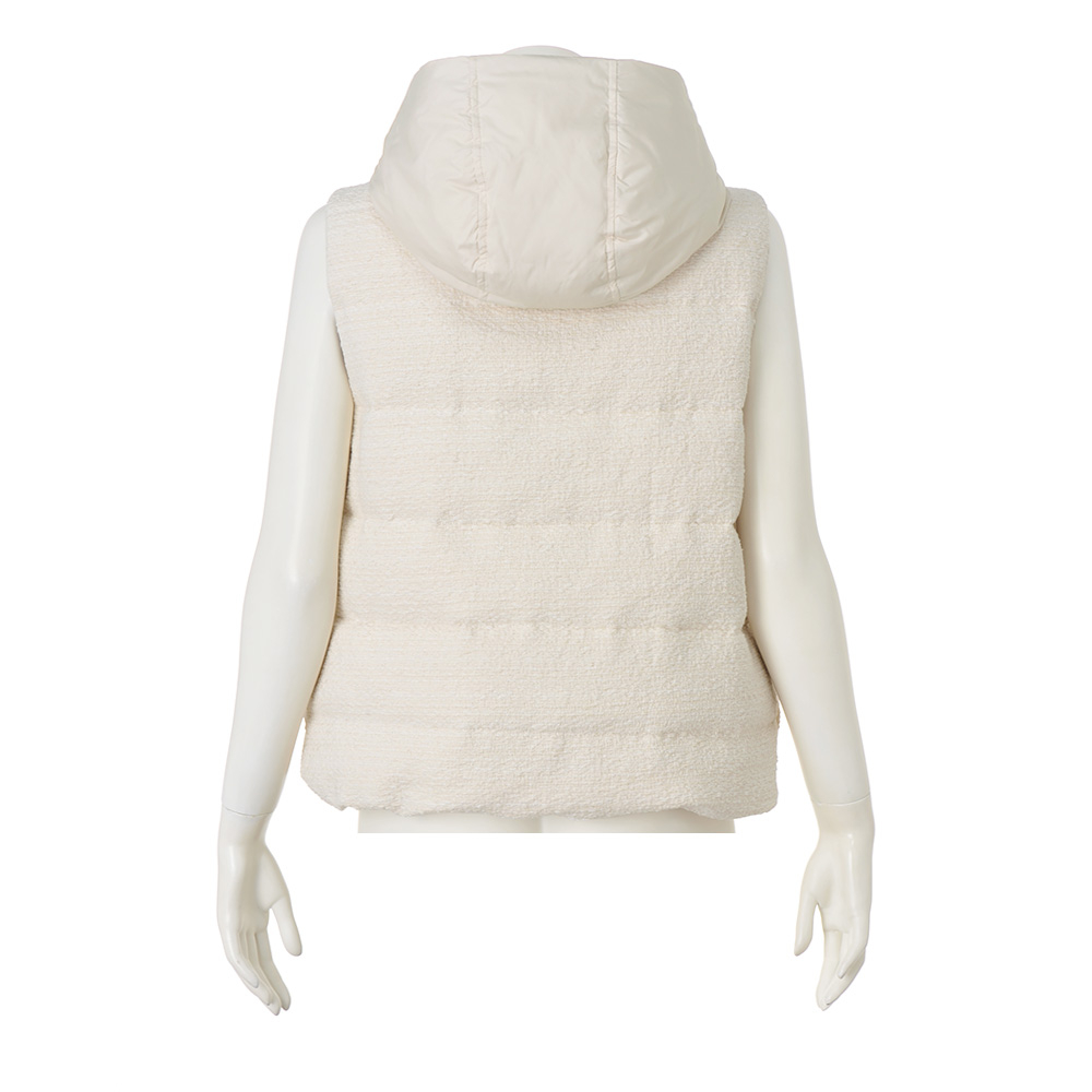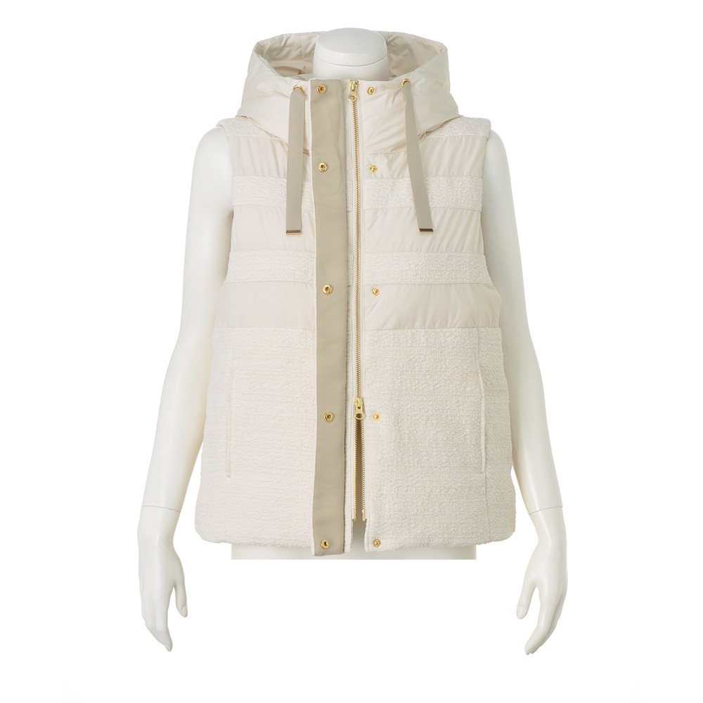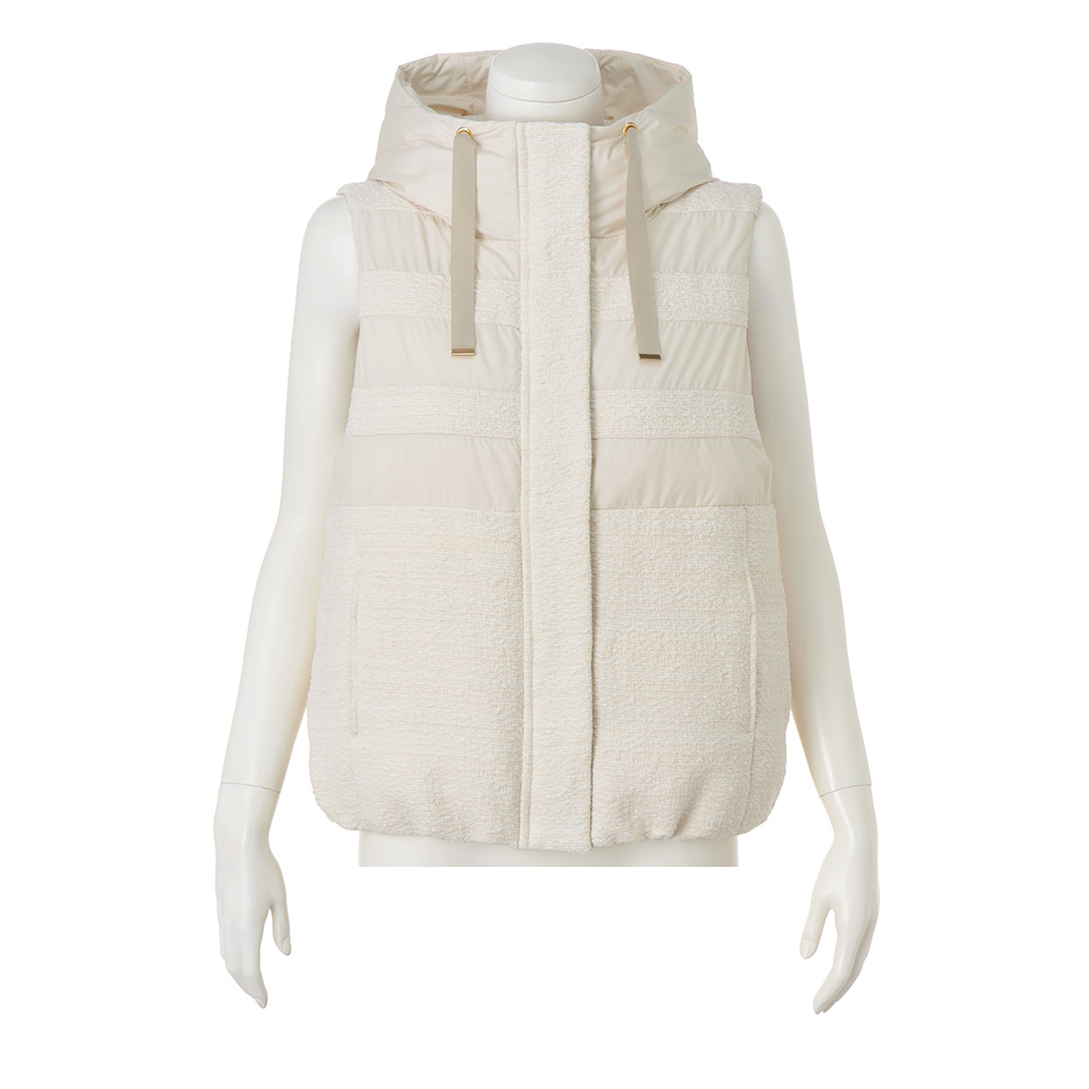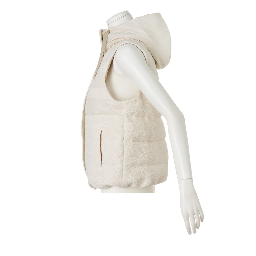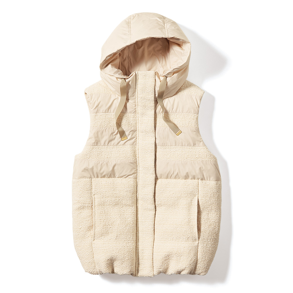 軽やかに華やぐエクリュのダウンベスト。「Pink&White」の配色コーディネートをクリーンかつモードに仕上げるなら、エクリュカラーのアウターに注目!ラグジュアリー感にも拘って、イタリア製のツイードとタフタをボーダー状に切り替えたダウンベストを完成しました。前立ての裏面やフード端にベージュのグログランテープを配したり、ゴールドのメタルパーツを効かせたり…細部まで上品さと高級感を追求。パンツにもスカートにも合う着丈なので様々な着回しを楽しめるうえに、身頃だけでなく首元を包み込むようなフードにもダウンを入れているから軽やかさと暖かさが見事に両立。オンからオフまで、長い期間、賢く素敵にお洒落を支えてくれるのです。≫ POINT裾の内側に隠しドローストリングを配しているので、ボトムに合わせてシルエットや着丈を調節できます。