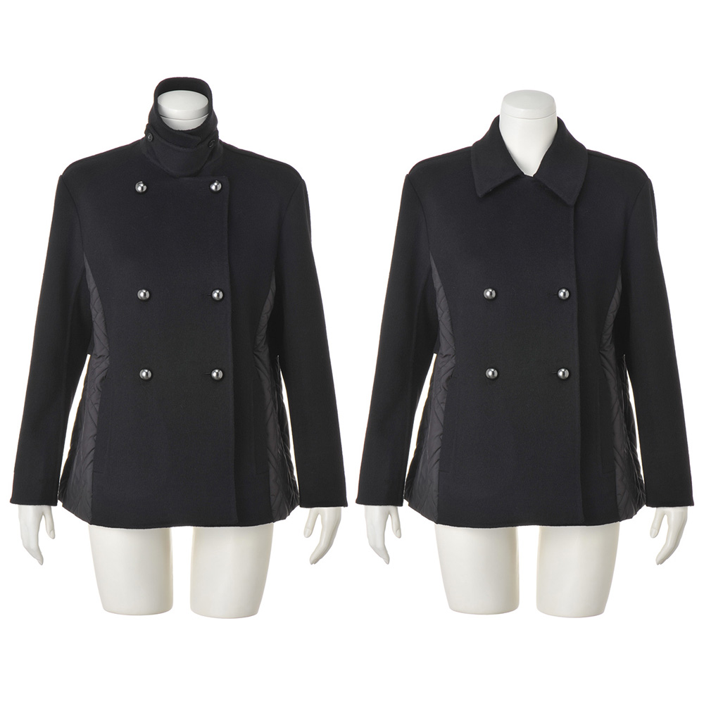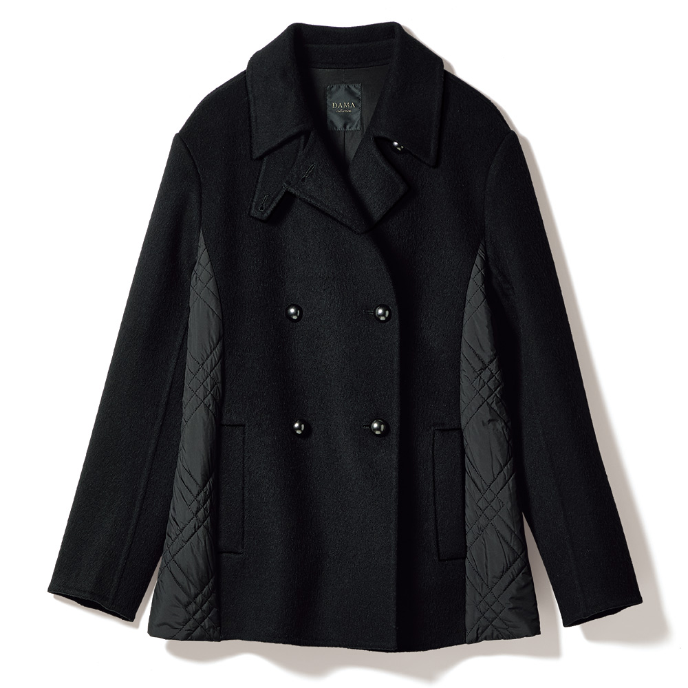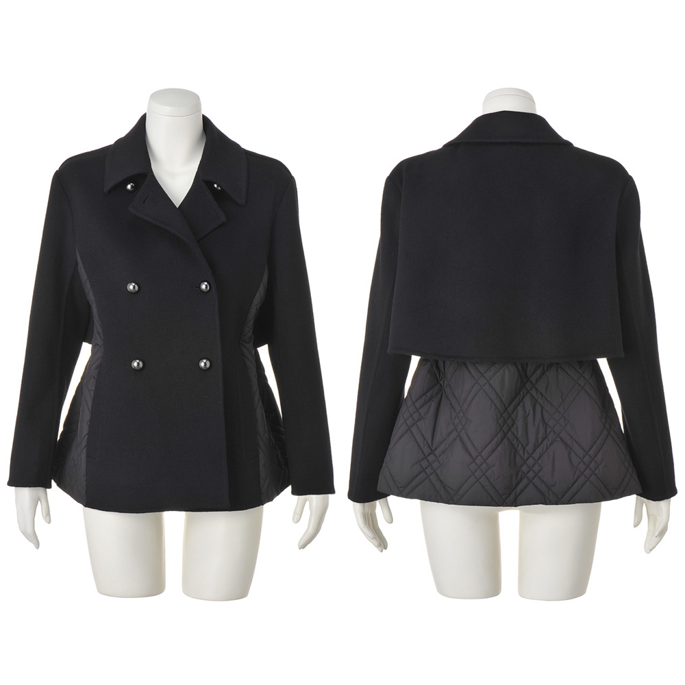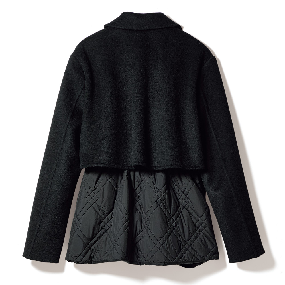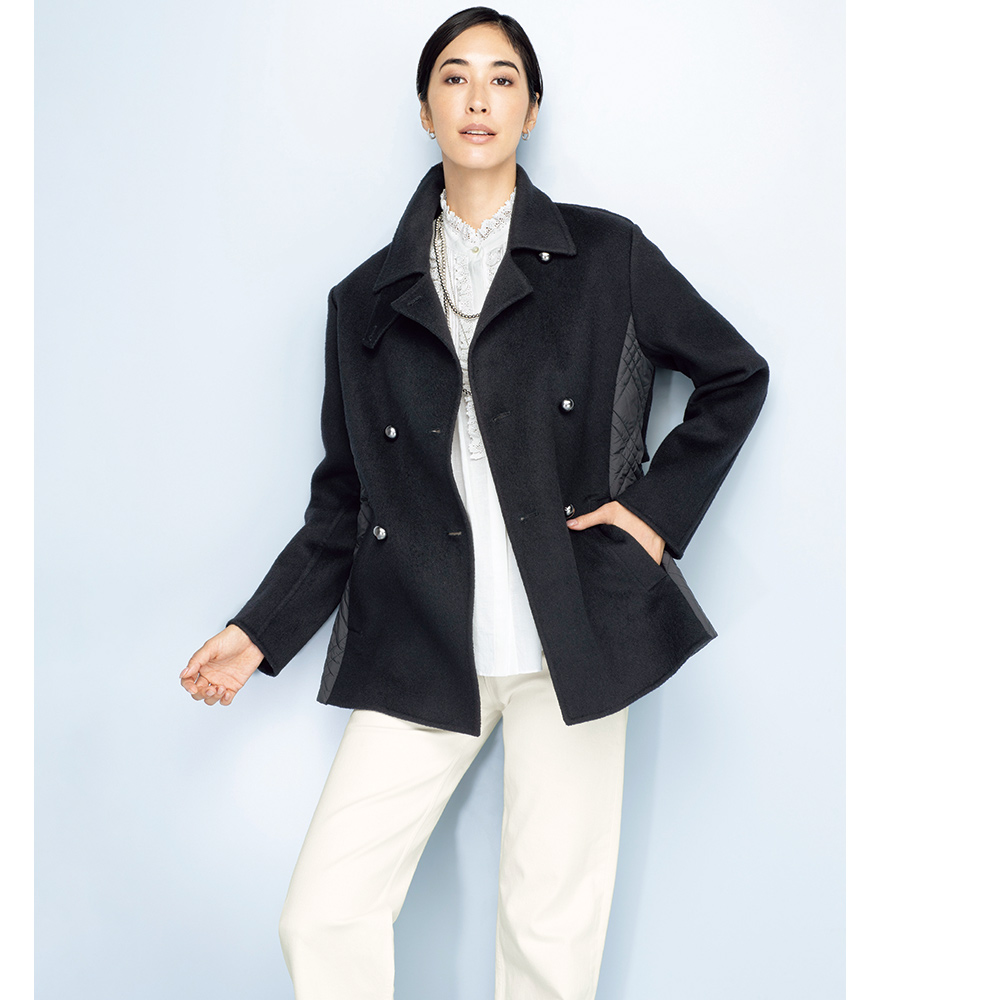 端正なピーコートに異素材を重ね、軽さと温もりを添えて寒の戻りなど、まだまだアウターが手放せない季節。2つの素材を大胆にドッキングして、軽やかな着心地と暖かさが魅力のアウターに。ピーコート風の前身頃と袖、ヨークには、ふっくらと柔らかなカシミヤをブレンドし、しなやかな風合いを表現したウール混ダブルフェイス素材を使用。脇と後ろ身頃は中わた入りのキルト生地で仕立て、上からヨークを重ねています。キルトは視覚的な細見えを後押しするバイアスダブルステッチをセレクト。襟はチンウォーマー付きで、上まで閉じても美しく決まり、存在感あるメタルボタンが上品なクラス感を添えます。さらに、キルト地の内側のドローコードでウエストを絞ることができ、ゆったりシルエットから、ギャザーを寄せたくびれシルエットまで、アレンジも自由自在です。≫ POINT後ろ身頃はキルト地に布帛のヨークを重ねて暖かな着心地。内側のドローストリングを調節して2つのシルエットを楽しめます。