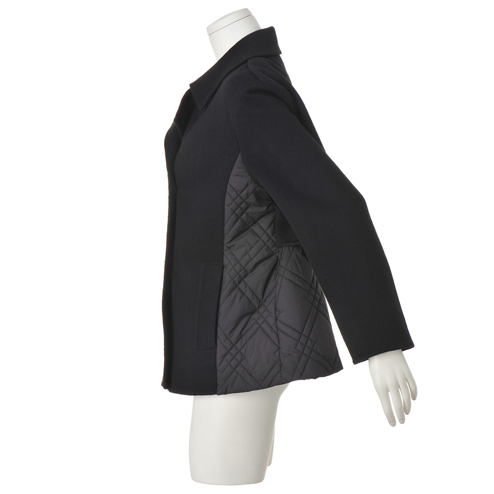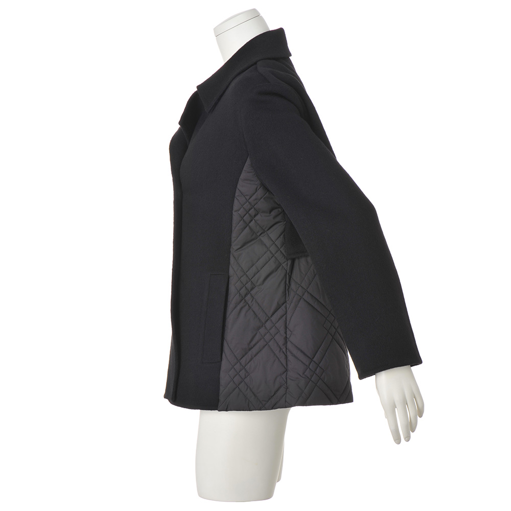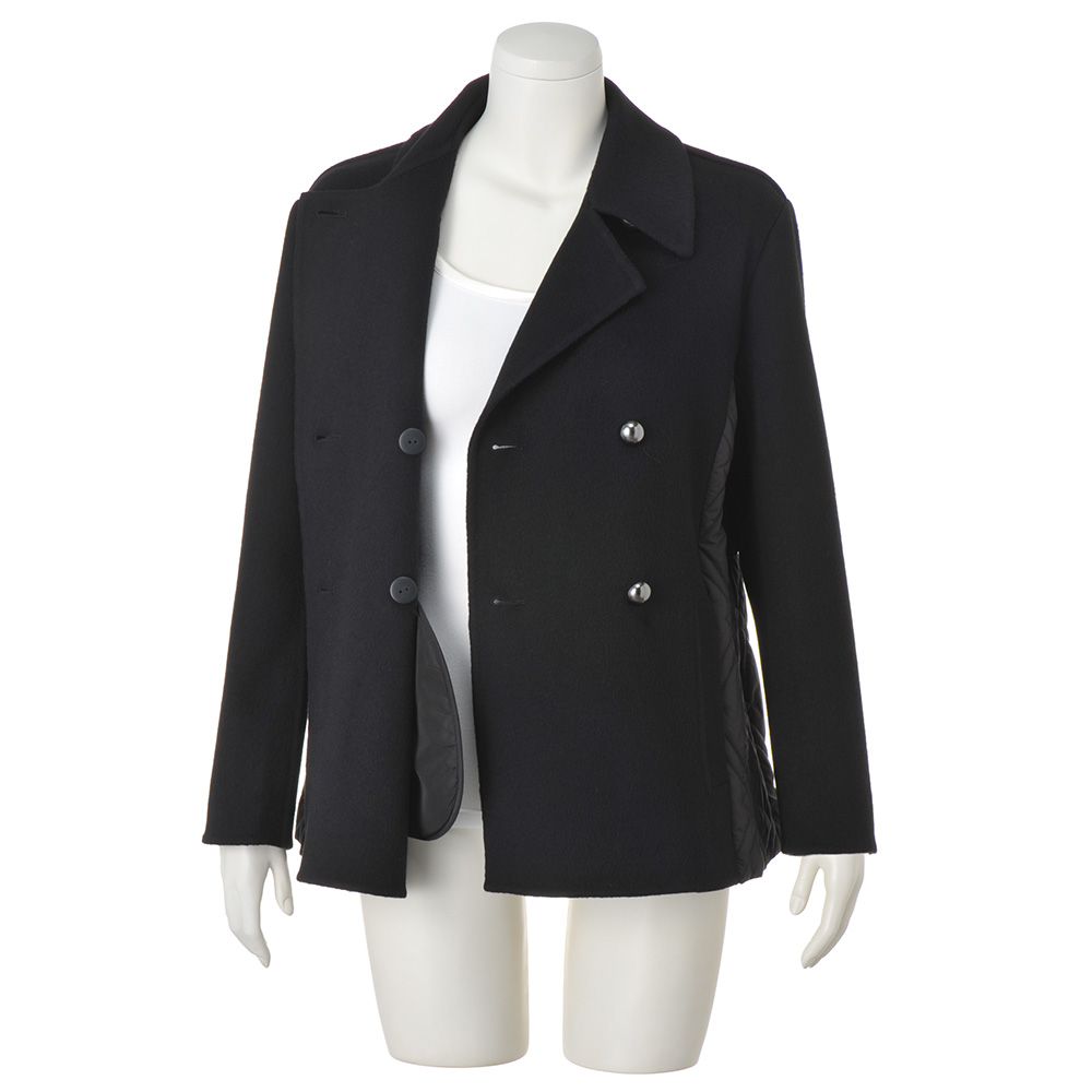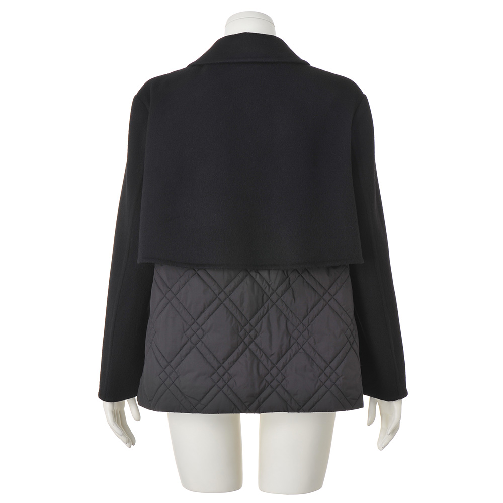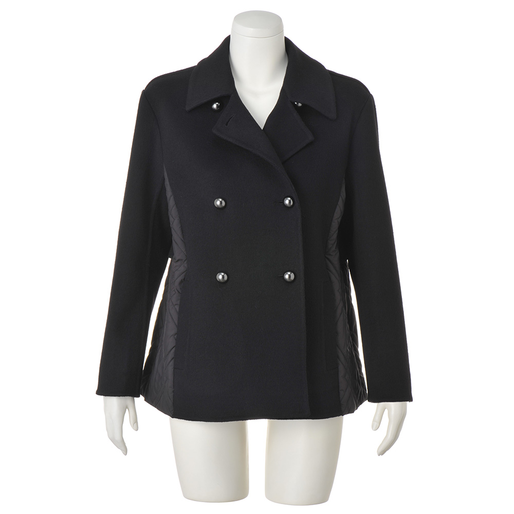 端正なピーコートに異素材を重ね、軽さと温もりを添えて寒の戻りなど、まだまだアウターが手放せない季節。2つの素材を大胆にドッキングして、軽やかな着心地と暖かさが魅力のアウターに。ピーコート風の前身頃と袖、ヨークには、ふっくらと柔らかなカシミヤをブレンドし、しなやかな風合いを表現したウール混ダブルフェイス素材を使用。脇と後ろ身頃は中わた入りのキルト生地で仕立て、上からヨークを重ねています。キルトは視覚的な細見えを後押しするバイアスダブルステッチをセレクト。襟はチンウォーマー付きで、上まで閉じても美しく決まり、存在感あるメタルボタンが上品なクラス感を添えます。さらに、キルト地の内側のドローコードでウエストを絞ることができ、ゆったりシルエットから、ギャザーを寄せたくびれシルエットまで、アレンジも自由自在です。≫ POINT後ろ身頃はキルト地に布帛のヨークを重ねて暖かな着心地。内側のドローストリングを調節して2つのシルエットを楽しめます。