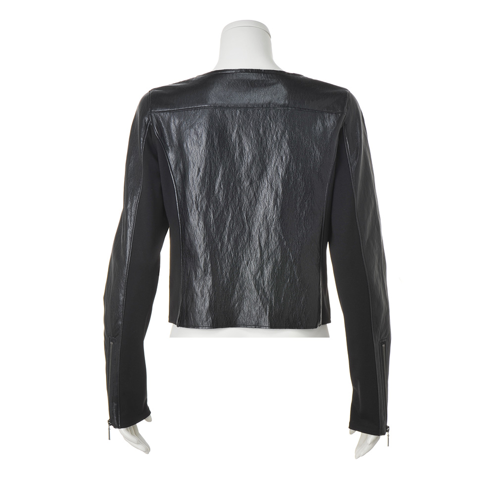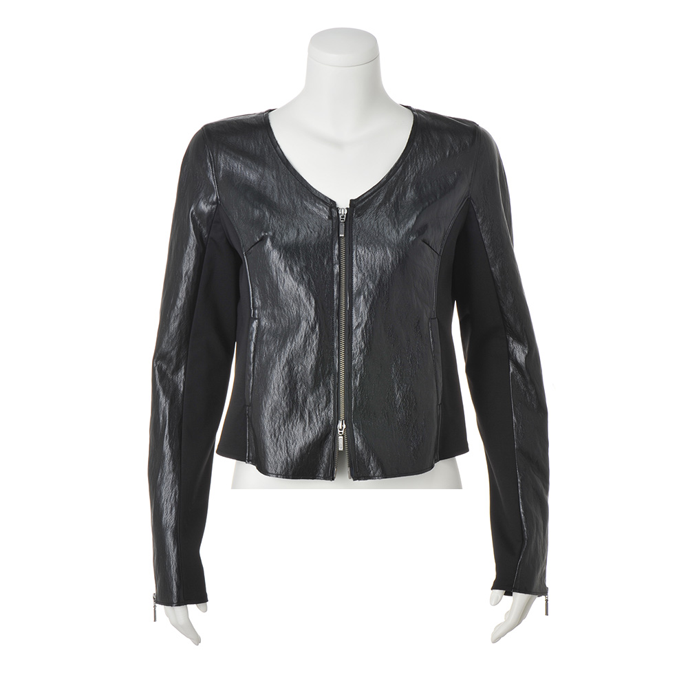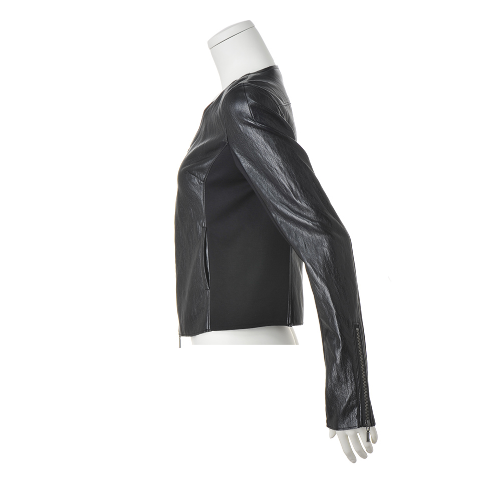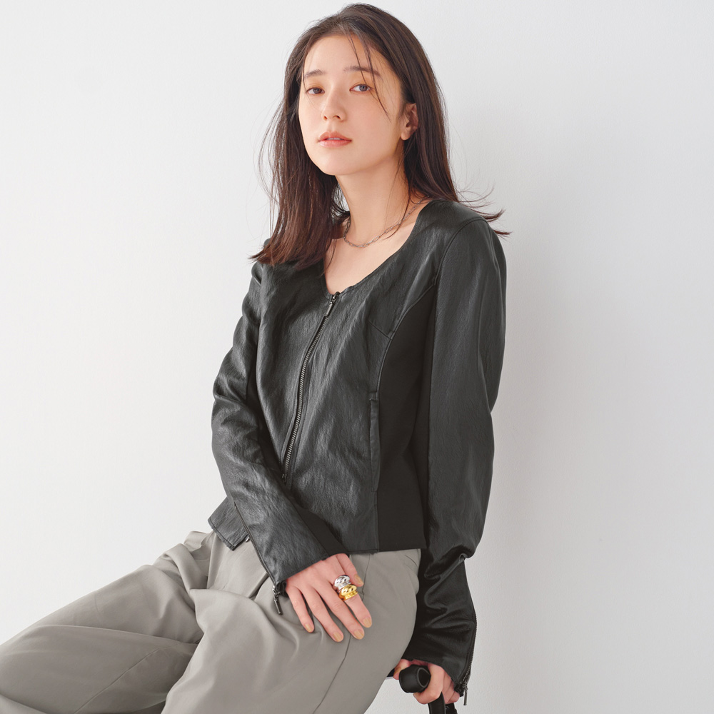 カジュアルを、もっとサステナブルに素敵と思える服が、結果的に地球にやさしい。So Close,が提案するサステナブルファッションは我慢しないおしゃれ。あなたのが選んだ“好き”が、未来の一歩につながりますように。まるでリアルレザーのような質感を叶える、進化したフェイクレザーのジャケット。裁ち切りデザインや細かなシボ感、ディテールはまさに本物の佇まい。夏アイテムとしてあえて一枚仕立て&タイトフィットなサイズ感ですが、カットソー素材とのコンビで窮屈感なくからだに自然となじみ、ほっそり見えるラインを実現。デコルテを美しく見せる襟ぐりの開き具合にもこだわりました。*SUSTAINABLE(アニマルフリー)*