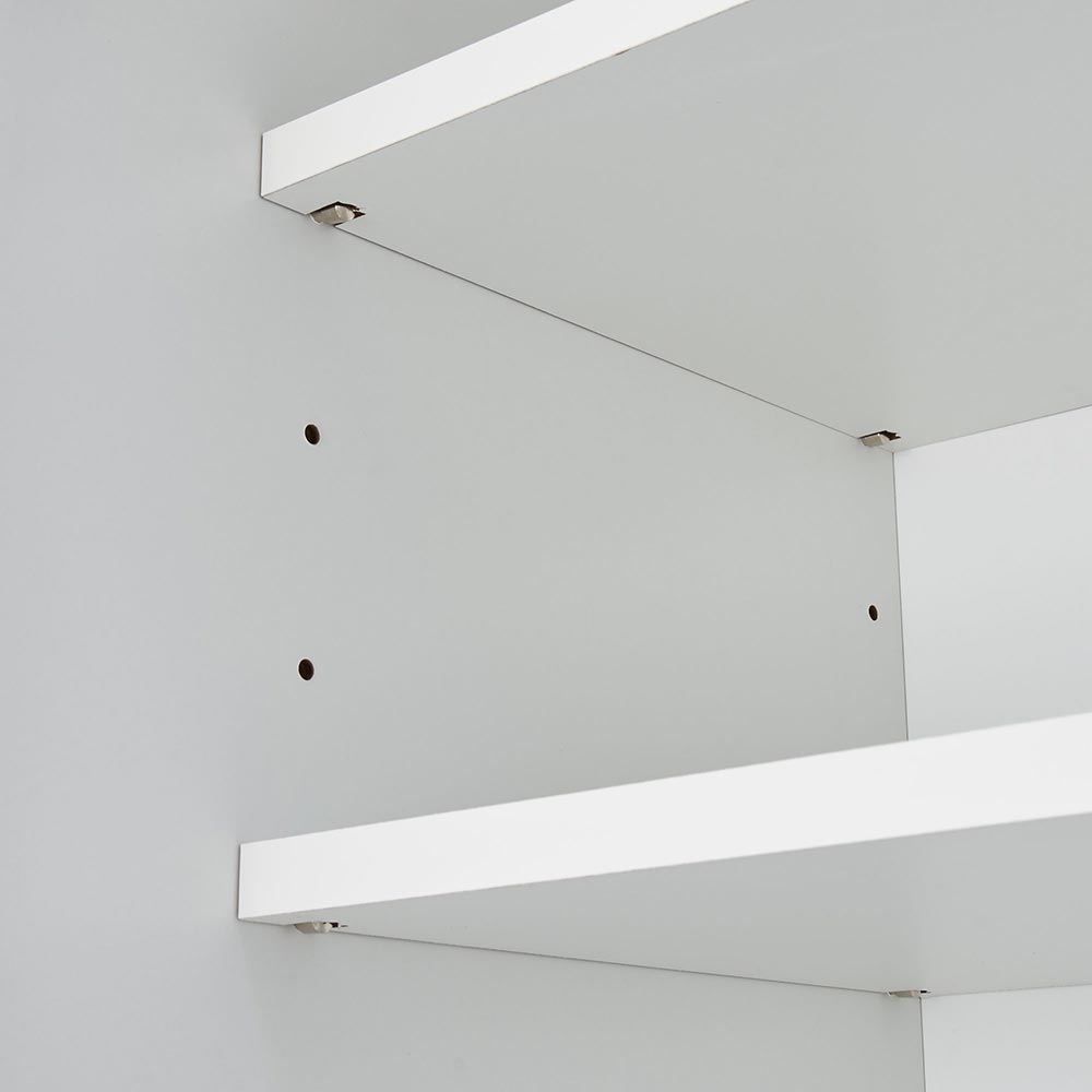 棚板は可動式。しっかりとした金属ダボで固定します。