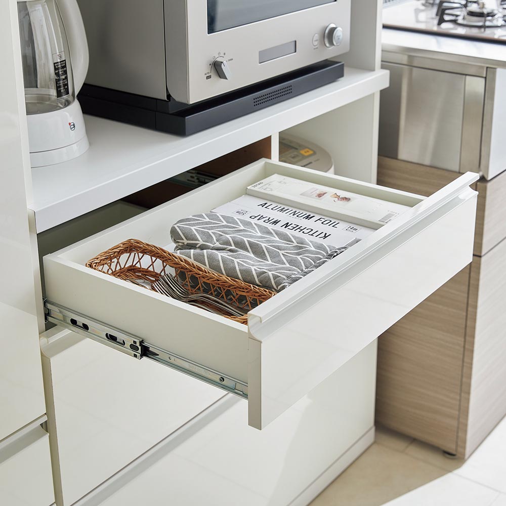 コンパクトなサイズ感と水汚れに強い素材やスムーズに開閉する引き出しなど、キッチンの主役にふさわしい機能性を備えたアイテム。昨今の冷蔵庫に合わせやすいカラーリングとして、シルバー×ダークブラウンと、取っ手まで真っ白なホワイトをご用意しています。奥行スリム・幅コンパクトなサイズ感。都心マンションやセカンドキッチンなど多彩に活躍するキッチンシリーズ■奥行40.5cmのコンパクトなサイズ感が魅力のキッチンシリーズ。■キッチンの通路・動線にゆとりを持たせたい方にお勧めのキッチン収納です。■収納力や設置場所に合わせて選べるバリエーションも魅力です。レンジやコーヒーメーカー、炊飯器までまとめて収まる家電スペース■家電スライドは手前に大きく引き出すことができるので、蓋が上に開く家電も安心。■棚板奥にもコードを通す穴を設け、配線がスムーズに済むよう配慮しました。収納ボリュームもたっぷり、収納力が自慢のキッチン収納・レンジ台■引出しには全段フルスライドレールを採用。奥までスムーズに引き出せるので出し入れが楽々。◆買い置きをまとめて収納する食品ストッカー・キッチンストッカーとしても重宝します。■前面にはお手入れのしやすい素材を採用。汚れても絞ったふきんでさっと拭き取って綺麗に。■引き出しや棚部分などの収納内部も綺麗に化粧を施し、お手入れしやすく配慮しました。■深引き出しには2Lペットボトルが収まるので、調味料の大ボトルの買い置きにも便利です。シックな大人のキッチンに。おしゃれなこだわりのカラーリングも魅力シルバー系昨今多くみられるシルバー系の冷蔵庫とコーディネートしやすいカラー。正面は艶のあるシルバーにハンドルもシルバーで仕上げ一体感のあるデザイン。本体はとても細かい木目柄のダークブラウンで圧迫感を感じさせないよう、落ち着いた印象にまとめています。ホワイト前面はツヤのあるホワイトに、本体はマットなホワイト。取っ手までホワイトで仕上げて、オールホワイトで統一感を持たせたこだわり。キッチン収納では定番の白も取っ手までホワイトで仕上げることで、より清潔感が際立ちます。安心と信頼の職人技が光る国産のキッチン収納■熟練の家具職人がひとつずつ丁寧に仕上げたワンランク上のダイニングボード・食器棚です。■細部の丁寧な仕上がりなど日本製の高品質なキッチンボード・カップボードをお楽しみください。面倒な組み立てのいらない完成商品■届いたその日からお使いになれます。