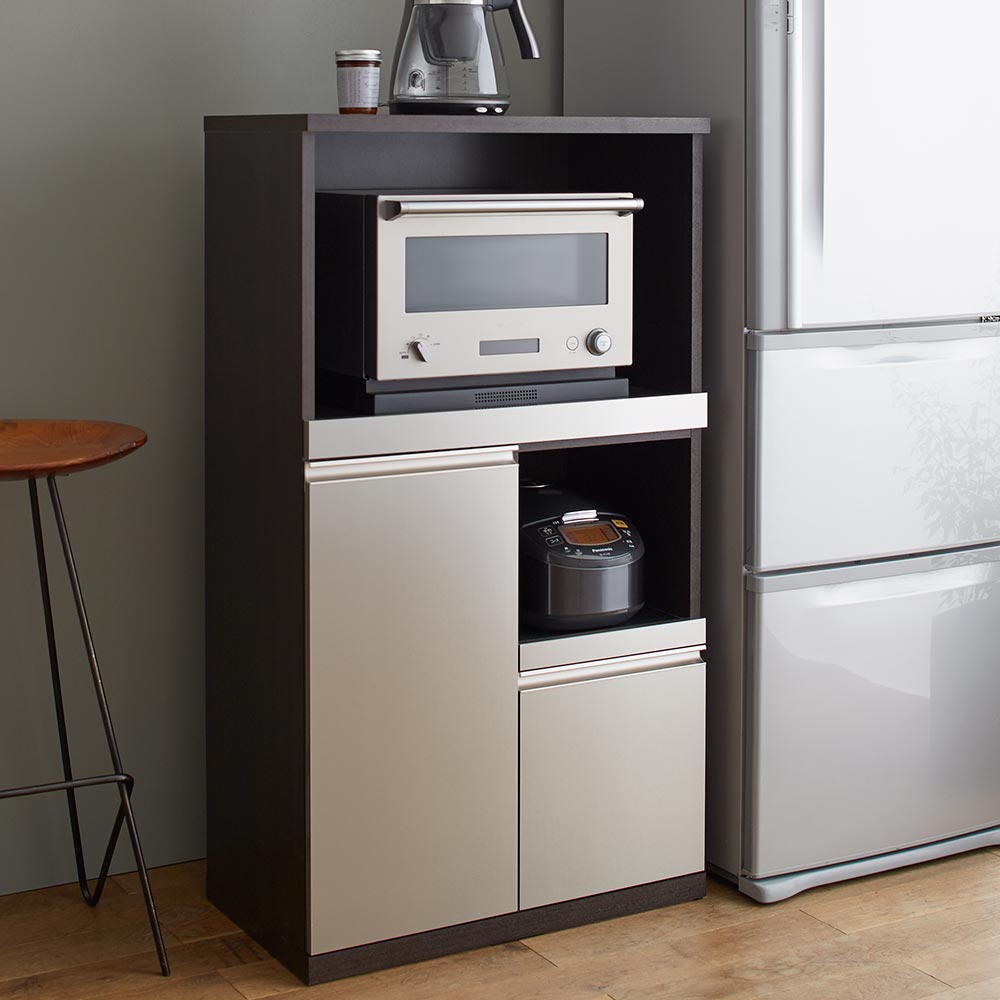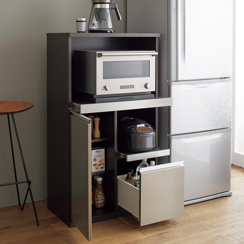 コンパクトながら、家電収納・棚収納(扉)・引き出しと、多彩な収納機能を持たせることでストッカーとしても活躍。