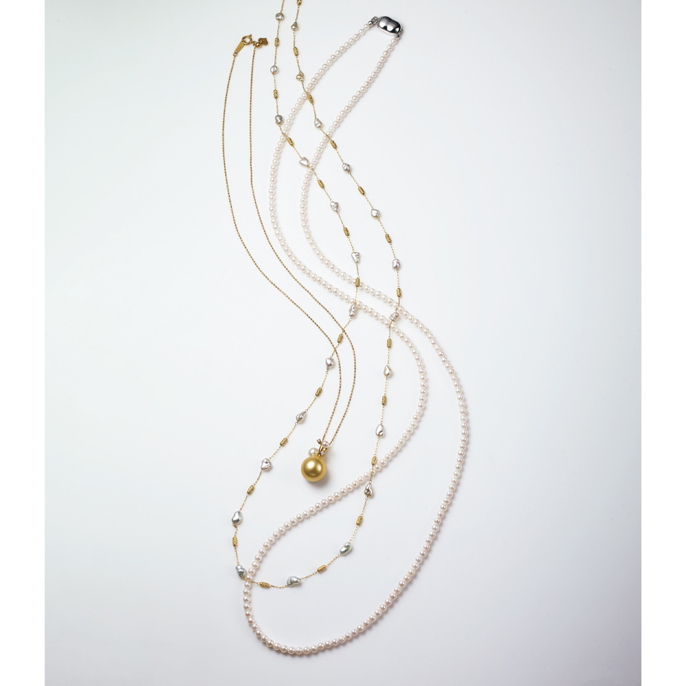 ATTRACTIVE PEARLマイ・スタイルと作り上げる魅惑のパール神秘の天然美としていつの時代も愛されるパール。希少性ゆえに纏う人の個性が際立つ羨望のアイテムをご紹介しましょう。品格と可憐さを備え、他のジュエリーとしなやかに調和するパール。自分らしさを表現するジュエリーレイヤードに欠かせない存在です。ラグジュアリー感を高めるゴールドパールにベビーパールのアクセントが効いたペンダント。